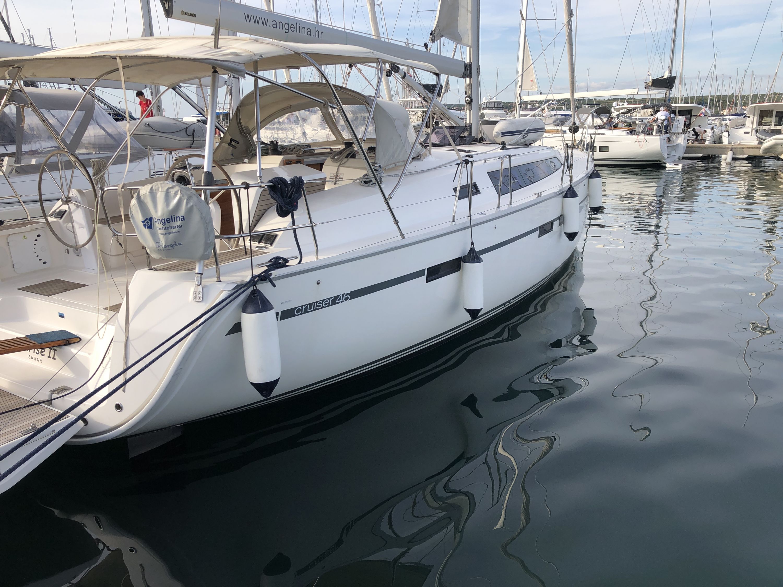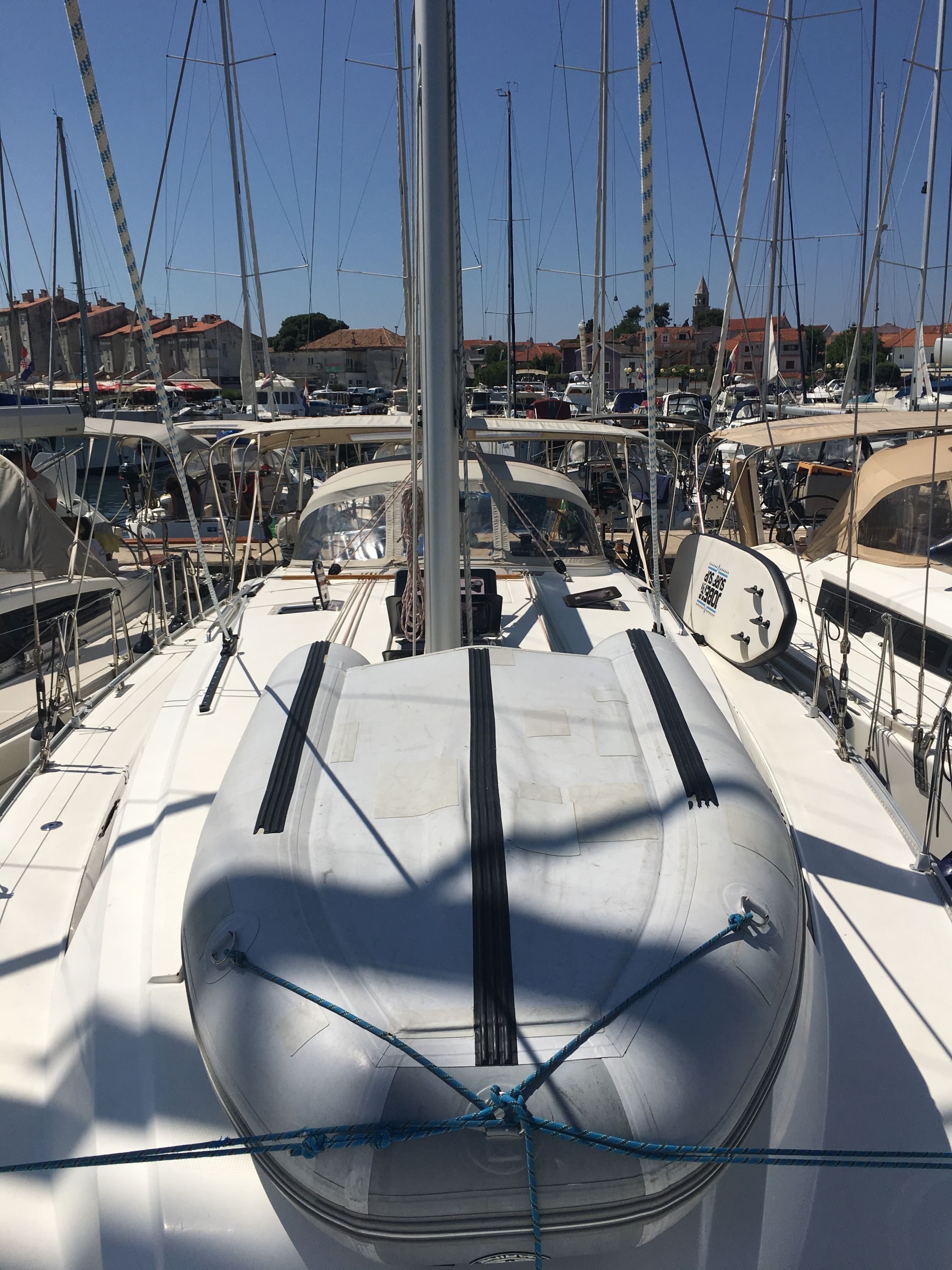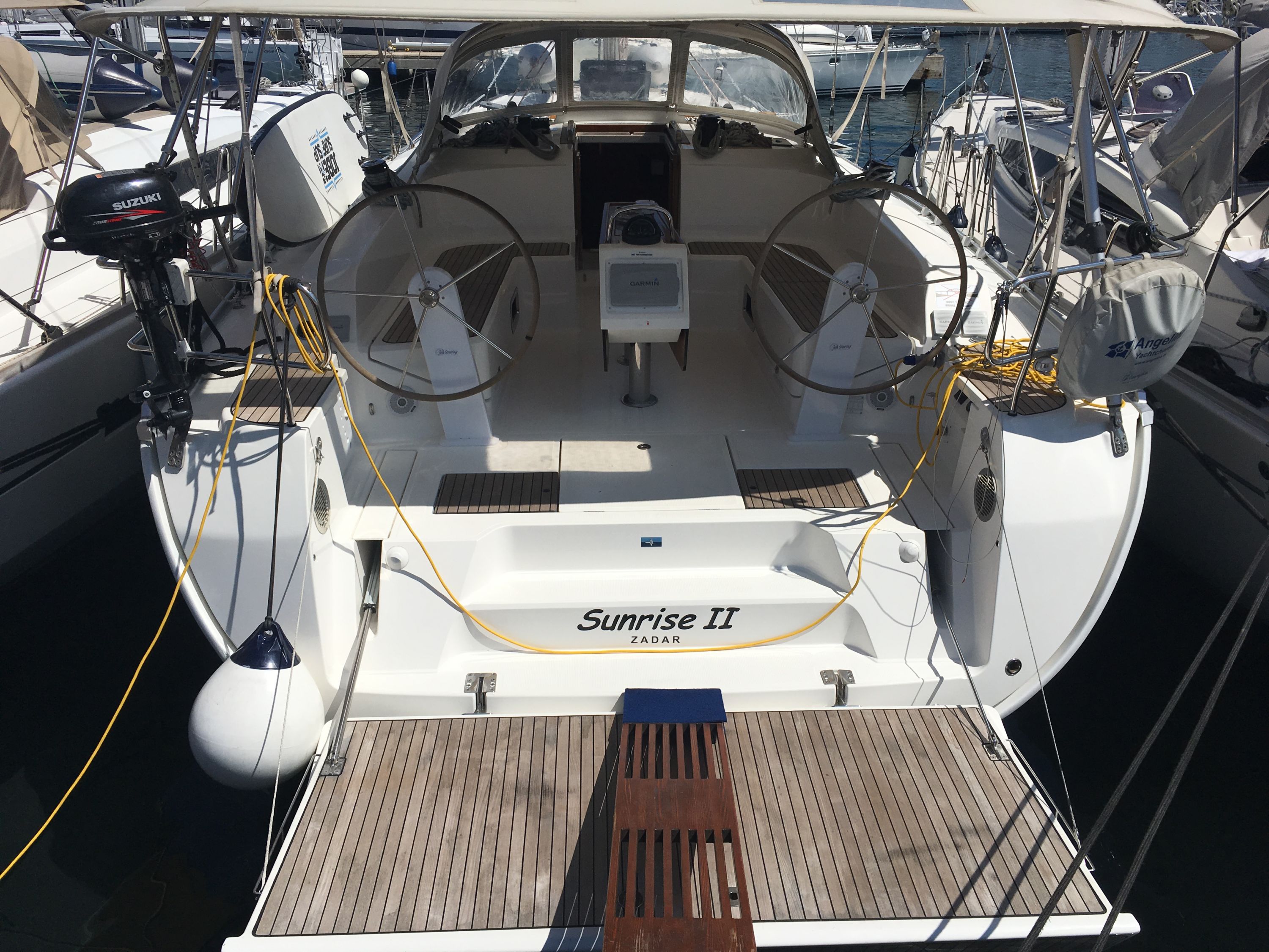 | Outside | 220 V-Landanschluss, Anker mit Kette, Biminitop, Cockpitdusche, Cockpitlautsprecher, Cockpitpolster, Cockpittisch, elektr. Ankerwinsch, Fender, Gangway, Kugelfender, Sprayhood, Teak auf Badeplattform, Teak im Cockpit, Winschen |