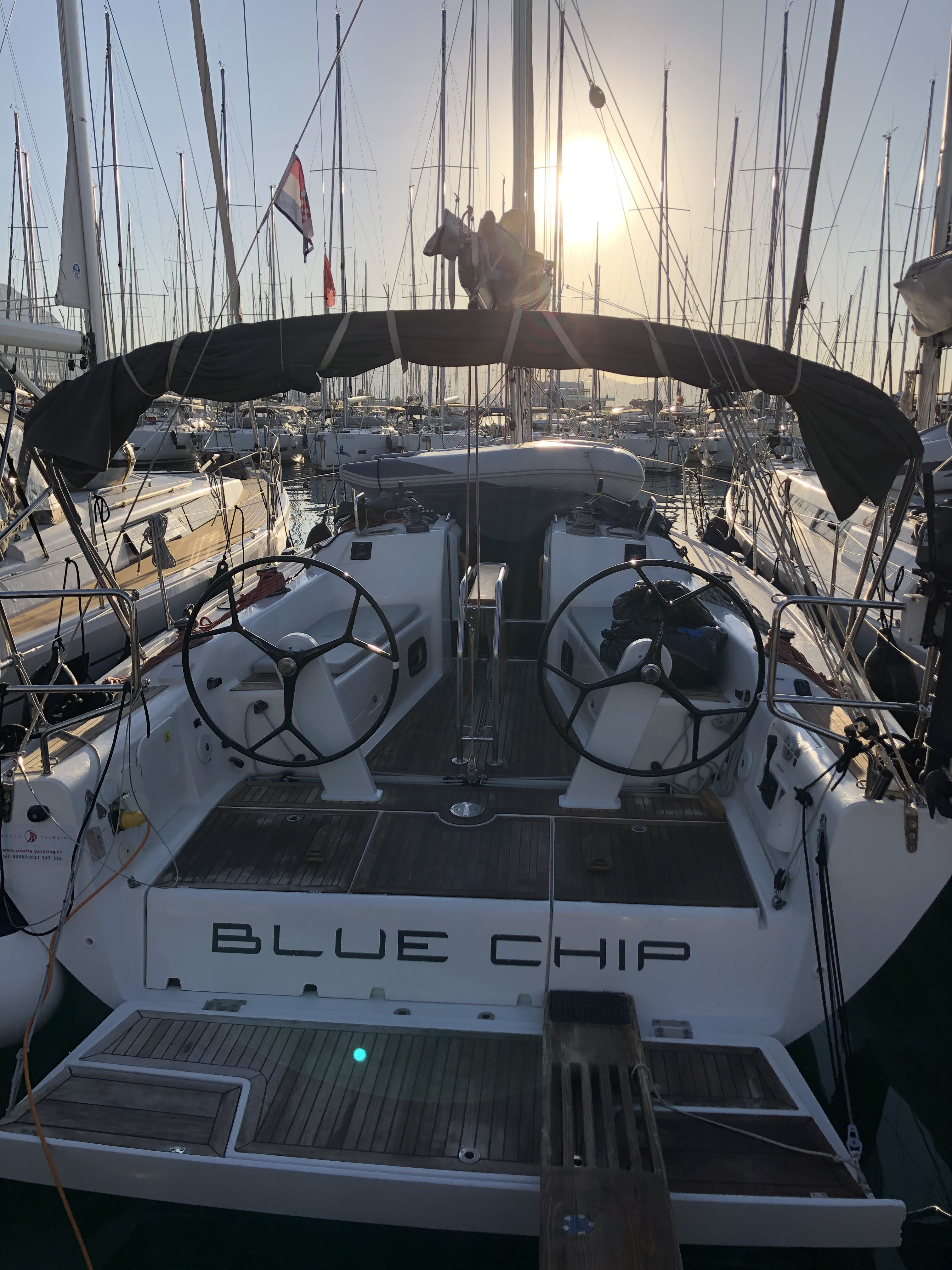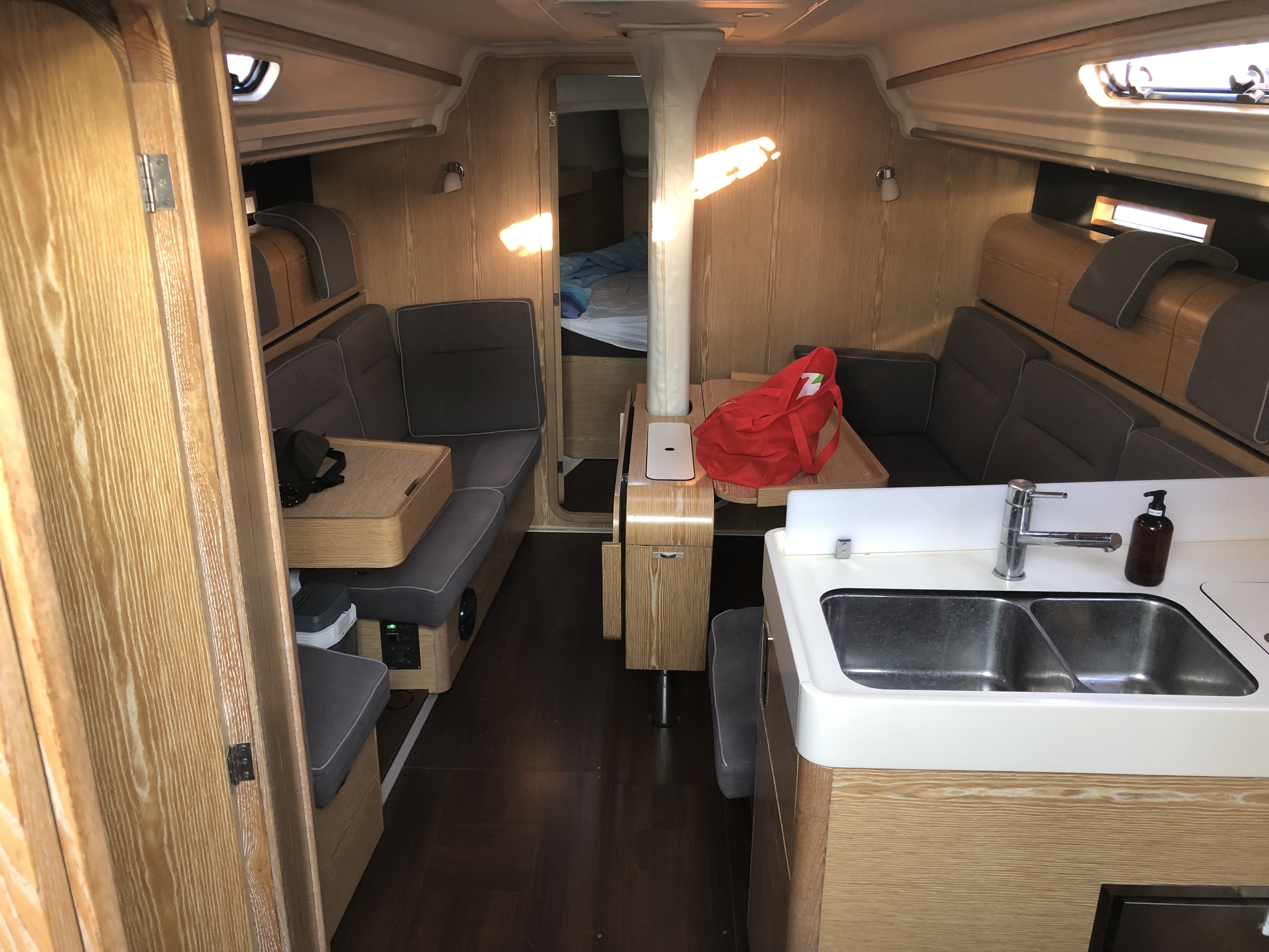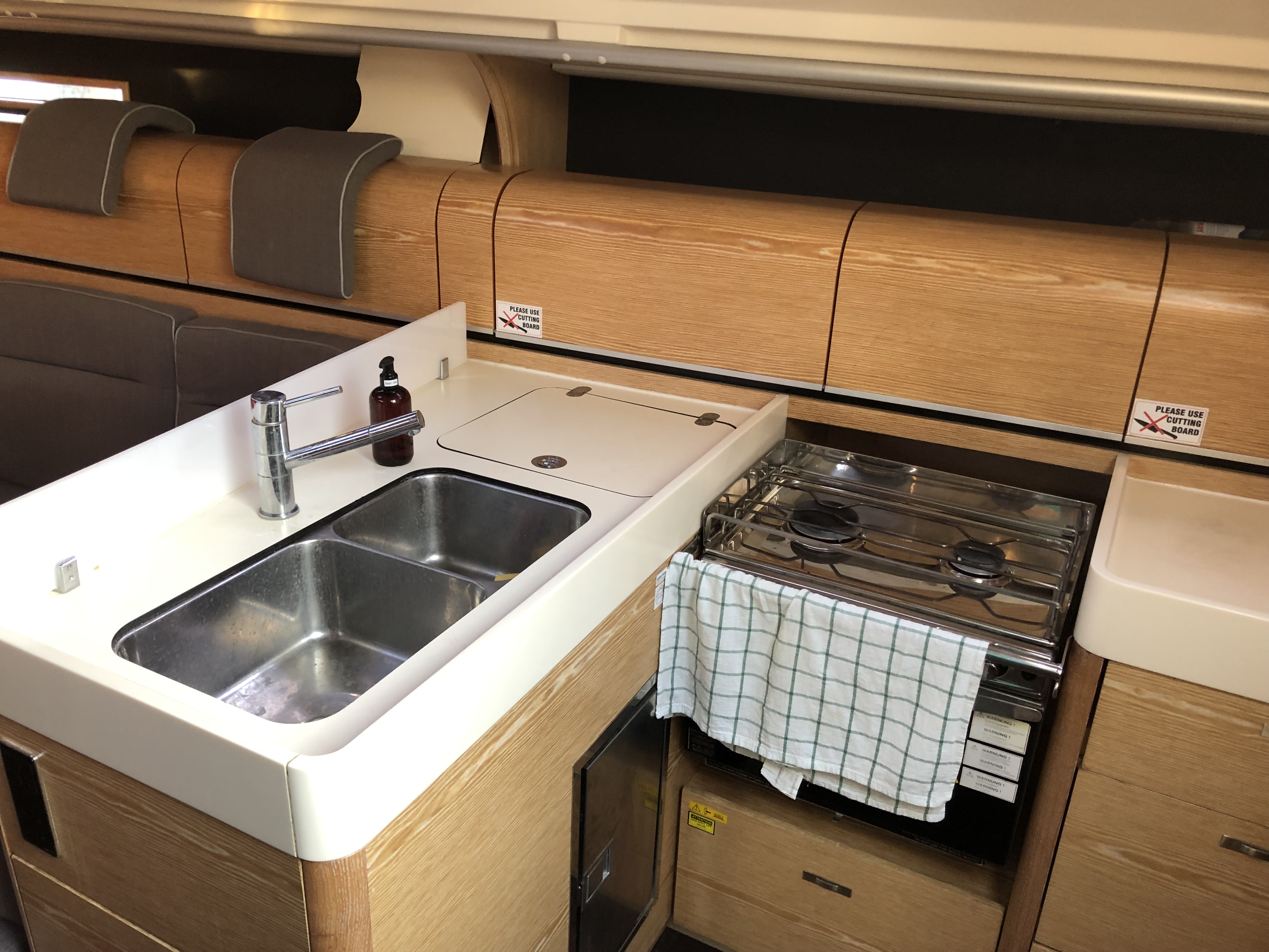 | Outside | Badeplattform, Biminitop, Cockpitdusche, Cockpitlautsprecher, Cockpittisch, elektr. Ankerwinsch, Sprayhood, Teak im Cockpit |