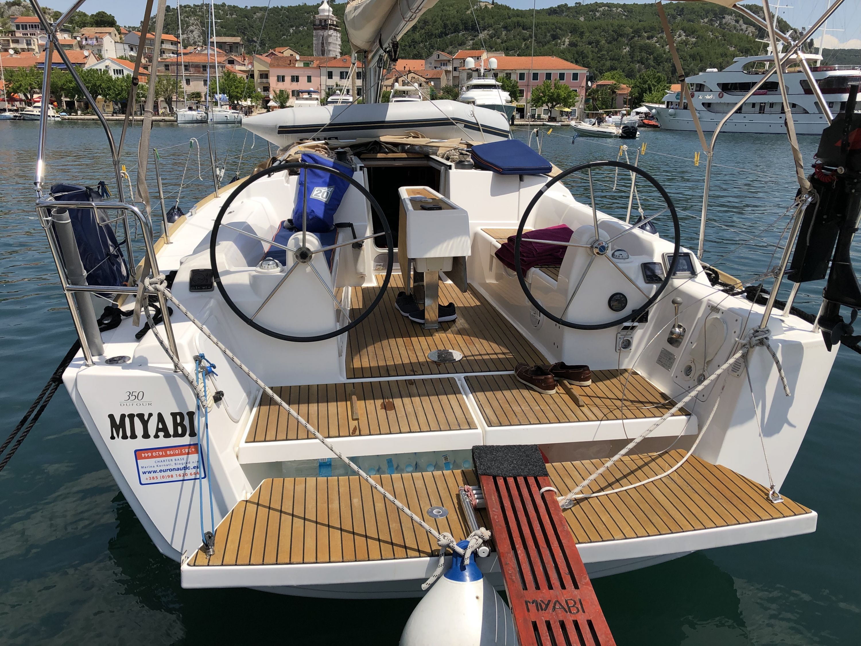 Outside 220 V-Landanschluss, Biminitop, Cockpitdusche, Cockpitpolster, Cockpittisch, elektr. Ankerwinsch, Fender, Solaranlage, Sprayhood, Teak im Cockpit, Wantenschneider
