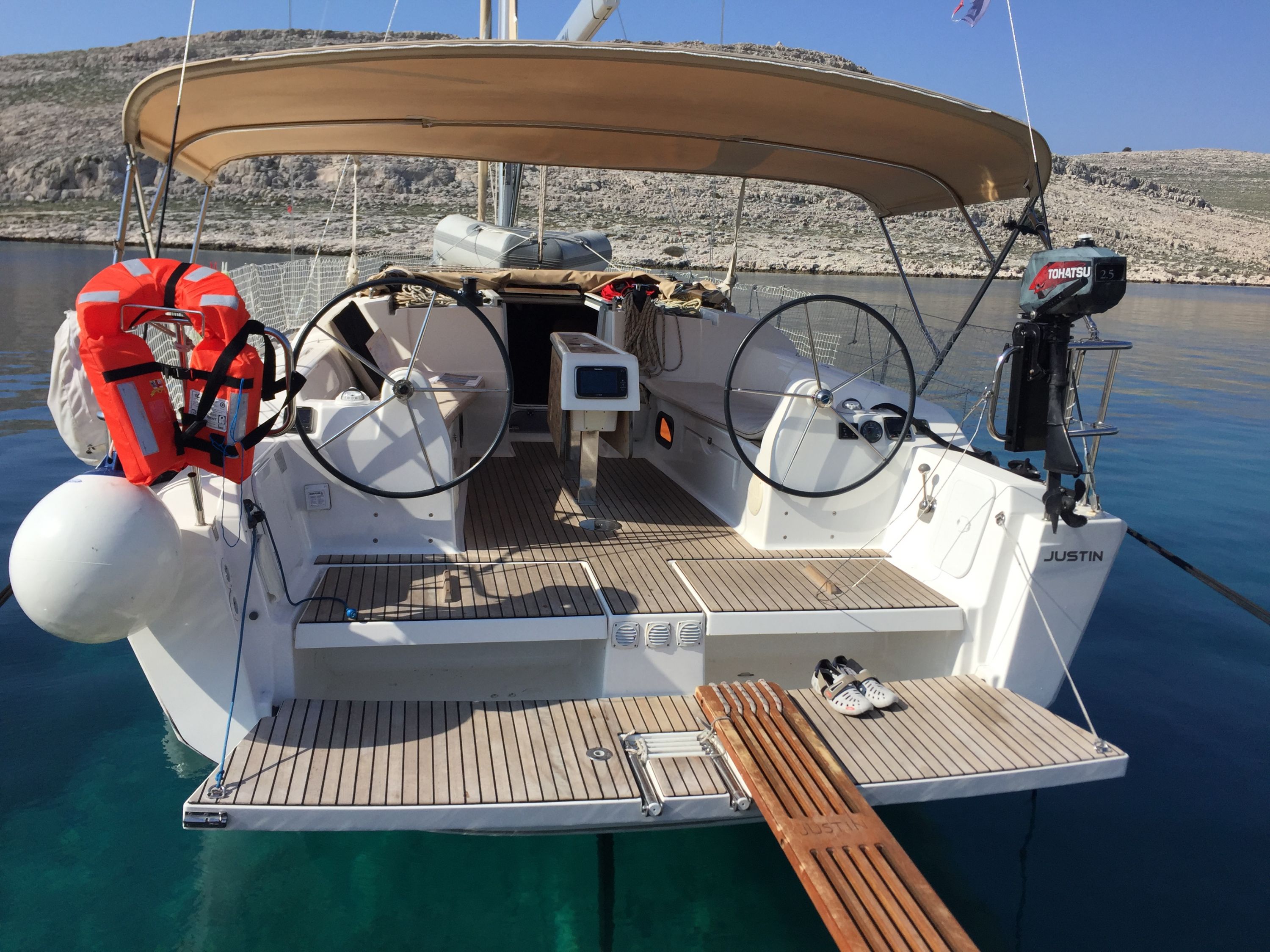 | Outside | Badeplattform, Biminitop, Cockpitdusche, Cockpitlautsprecher, Cockpittisch, elektr. Ankerwinsch, Sprayhood, Teak im Cockpit |