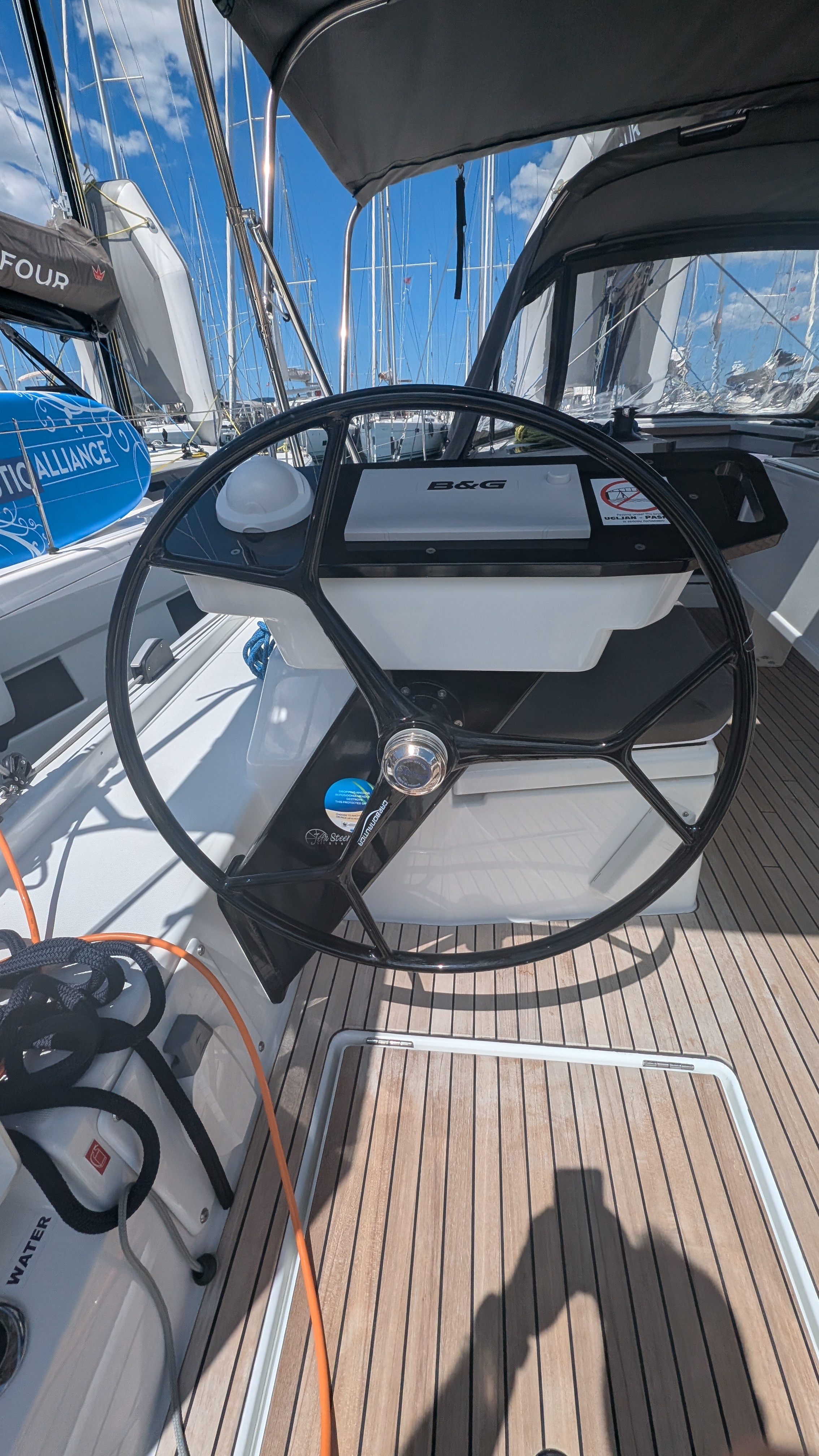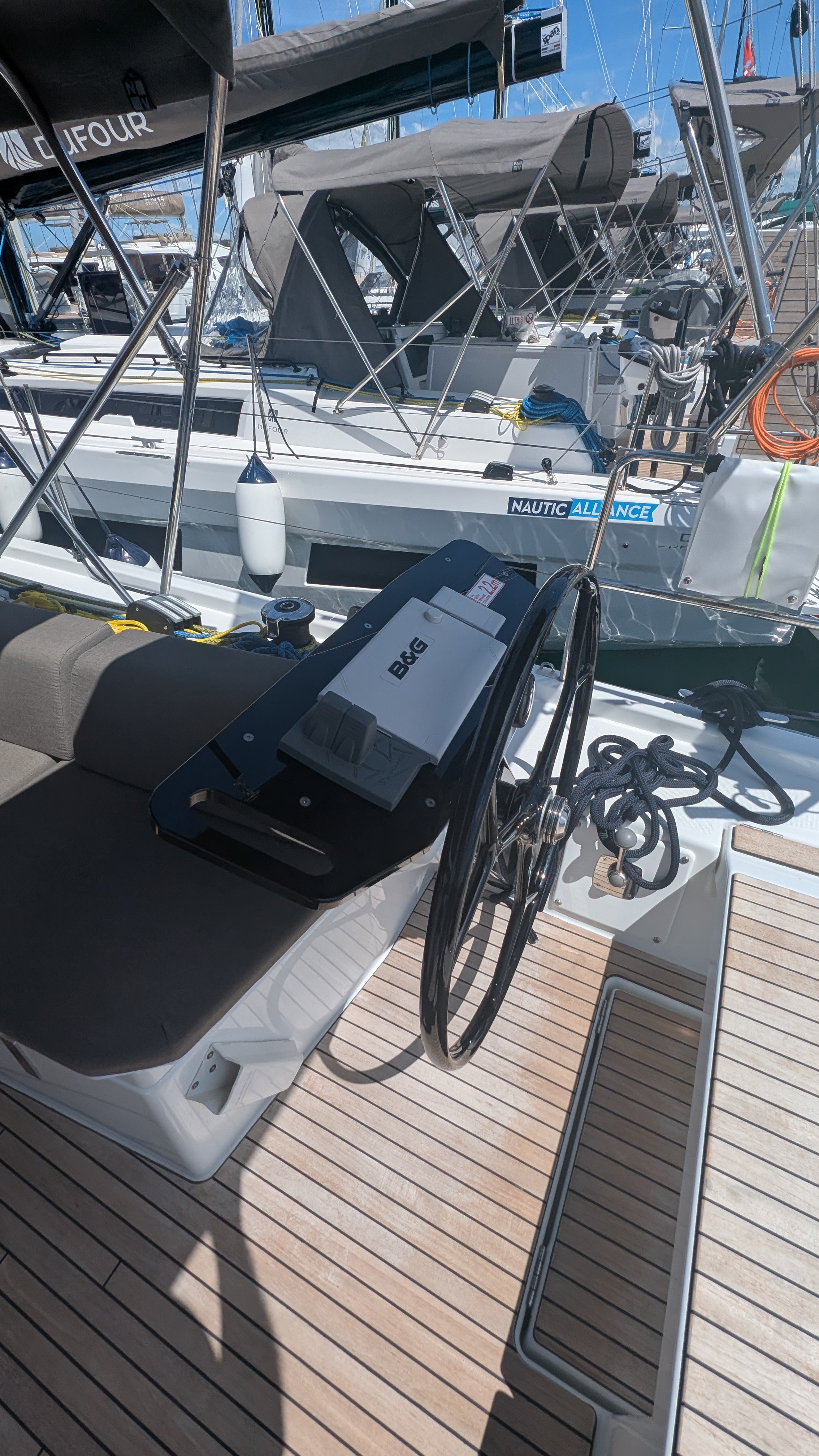 | Navigation | Fernglas, GPS mit Kartenplotter im Cockpit, Hafenhandbücher, Handpeilkompass, Navigationsbesteck, Seekarten, Tridata (Log, Echolot, Windm.) |