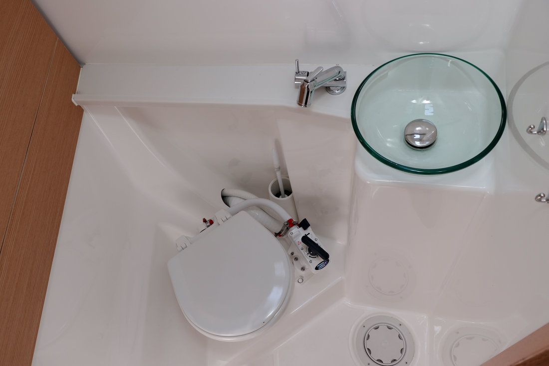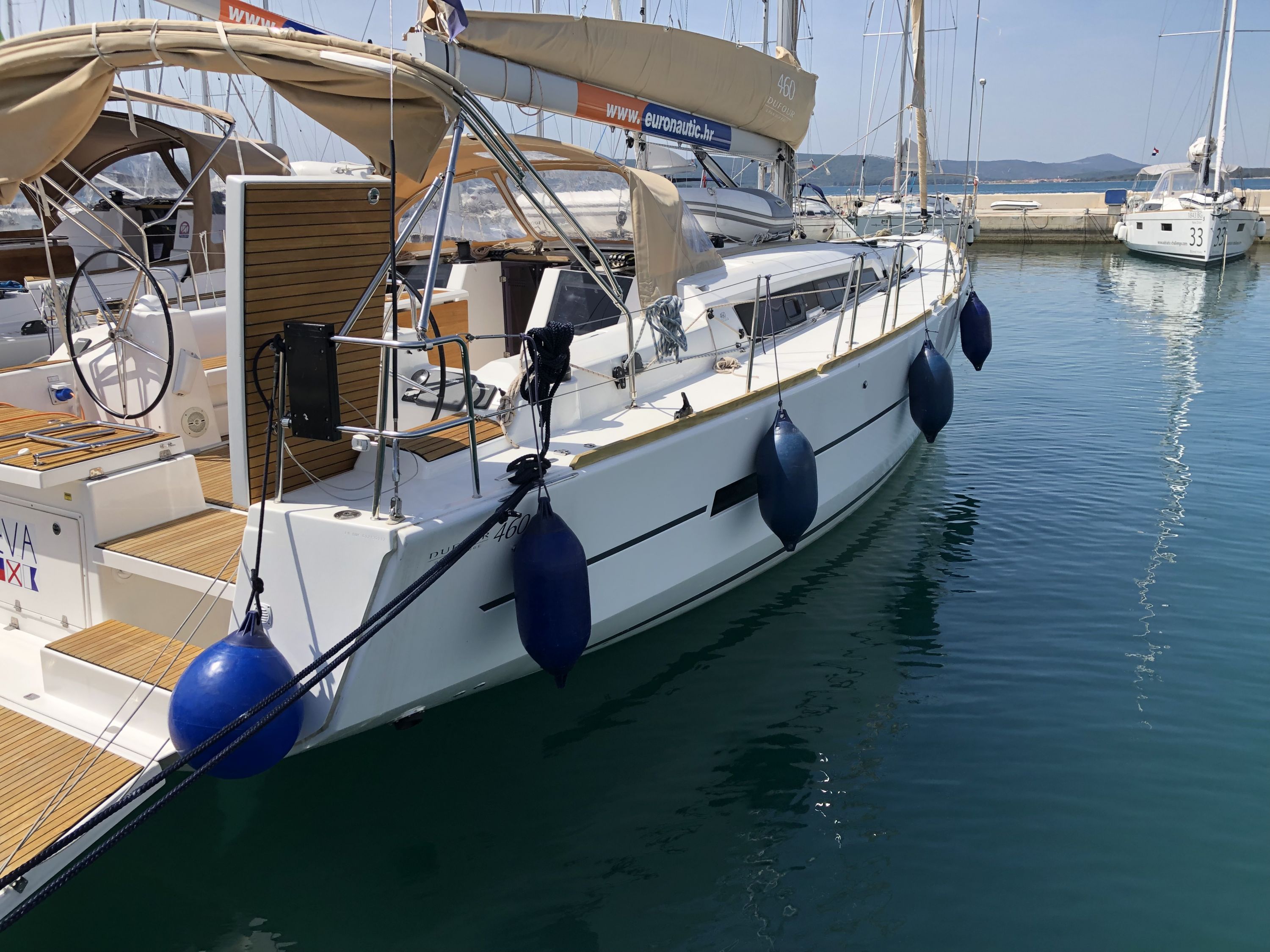 | Outside | 220 V-Landanschluss, Biminitop, Cockpitdusche, Cockpitlautsprecher, Cockpitpolster, Cockpittisch, elektr. Ankerwinsch, Festmacherleinen, Grill, Sprayhood, Teak im Cockpit, Unterwasserbeleuchtung, Wantenschneider |