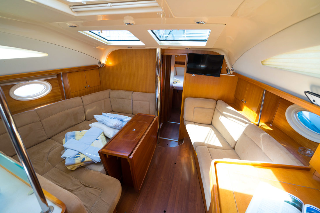| Outside | Biminitop, Cockpitdusche, Cockpitlautsprecher, Cockpitpolster, Cockpittisch, elektr. Ankerwinsch, Sprayhood, Teak im Cockpit |