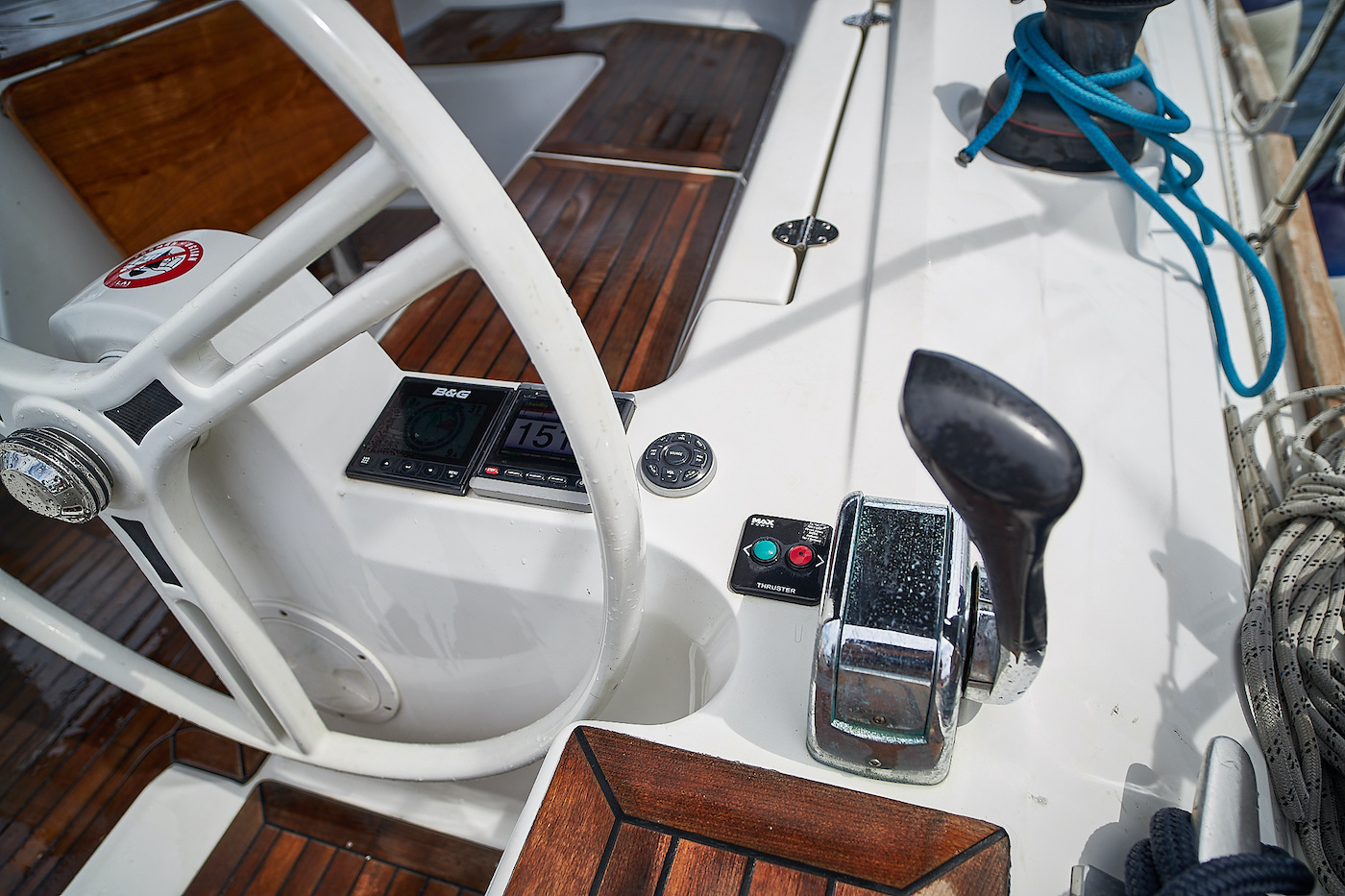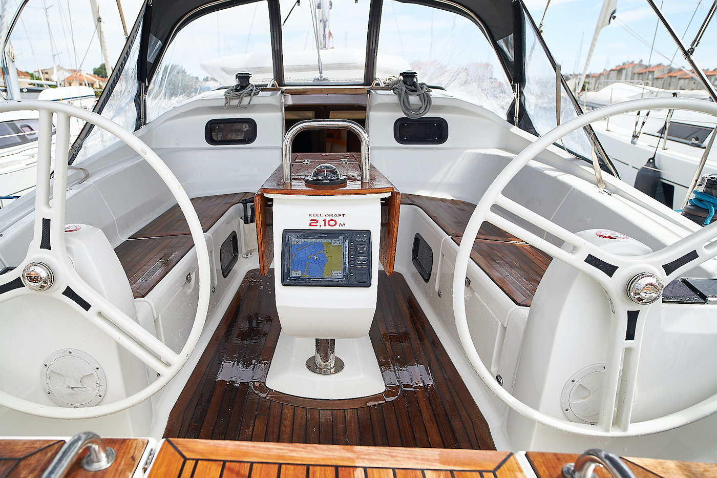 | Outside | Biminitop, Cockpitdusche, Cockpitlautsprecher, Cockpittisch, elektr. Ankerwinsch, Sprayhood, Teak im Cockpit |
