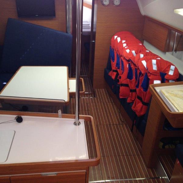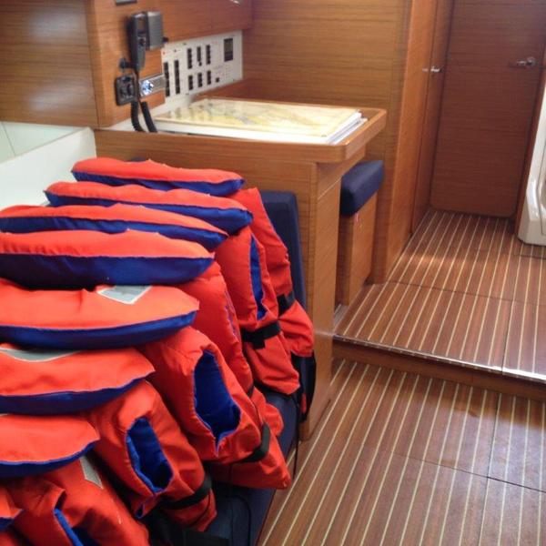 | Safety | Autopilot, Bugstrahlruder, elektr. Bilgepumpe, Feststoffschwimmwesten, Flaggen, Lifebelts, Notsignale, UKW-Funk, Zweitanker |