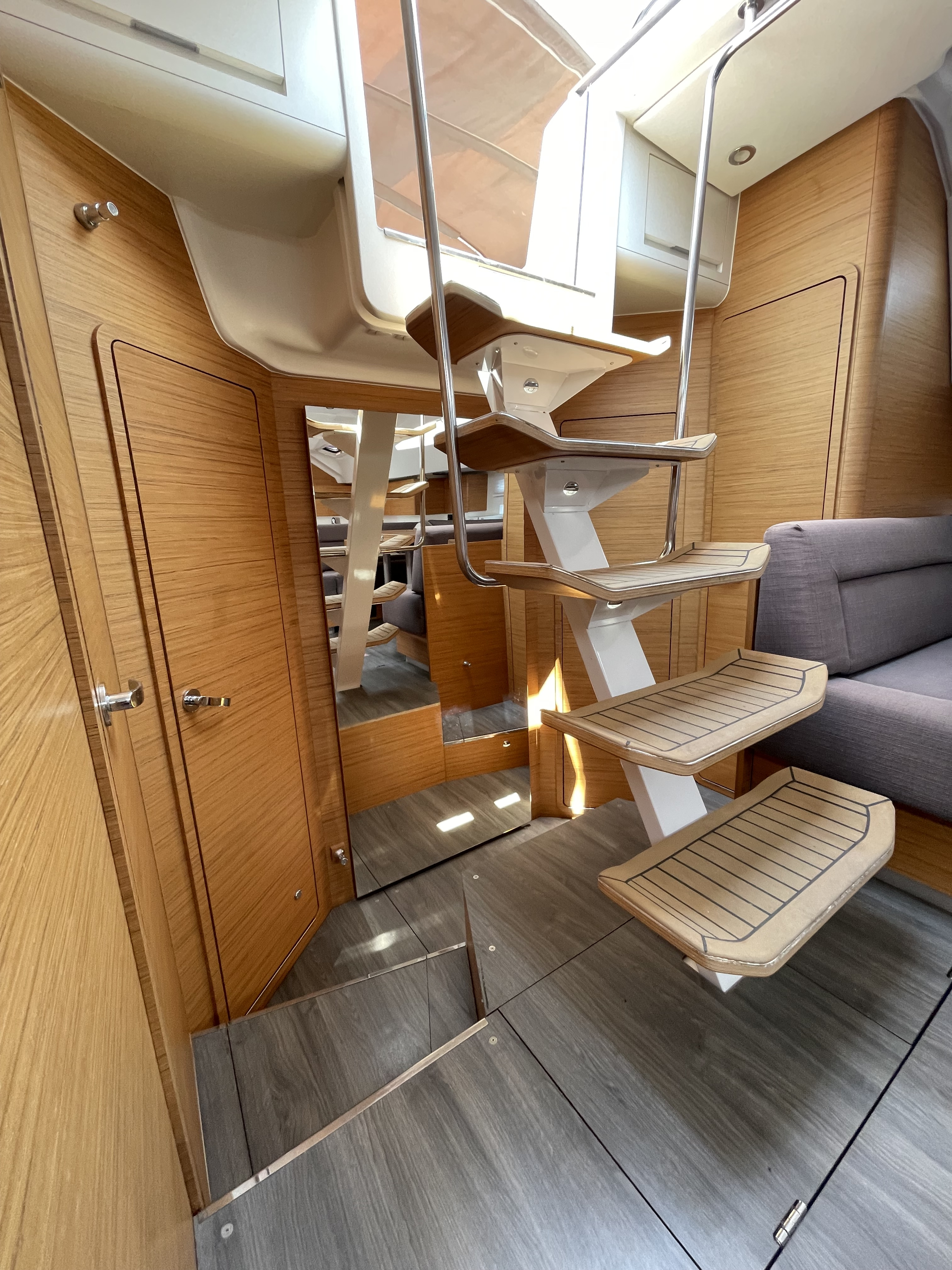| Outside | Anker mit Kette, Ankerkettenzähler, Badeplattform, Biminitop, Cockpitdusche, Cockpitkühlschrank, Cockpitlautsprecher, Cockpitpolster, Cockpittisch, elektr. Ankerwinsch, elektr. Winsch, Faltpropeller, Fernsteuerung für elektr. Ankerwinsch, Sprayhood, Spülbecken im Cockpit |