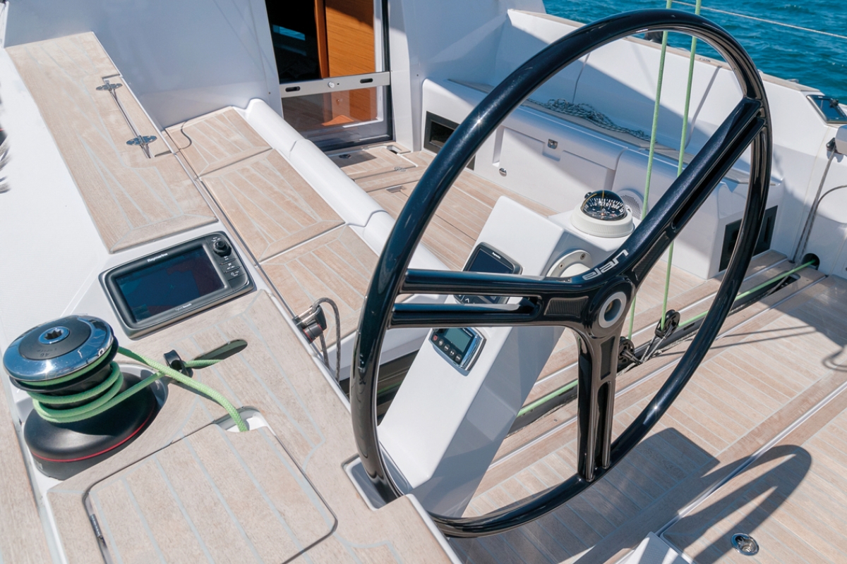 | Navigation | Barometer, Fernglas, GPS mit Kartenplotter im Cockpit, Hafenhandbücher, Handpeilkompass, Navigationsbesteck, Seekarten, Tridata (Log, Echolot, Windm.) |