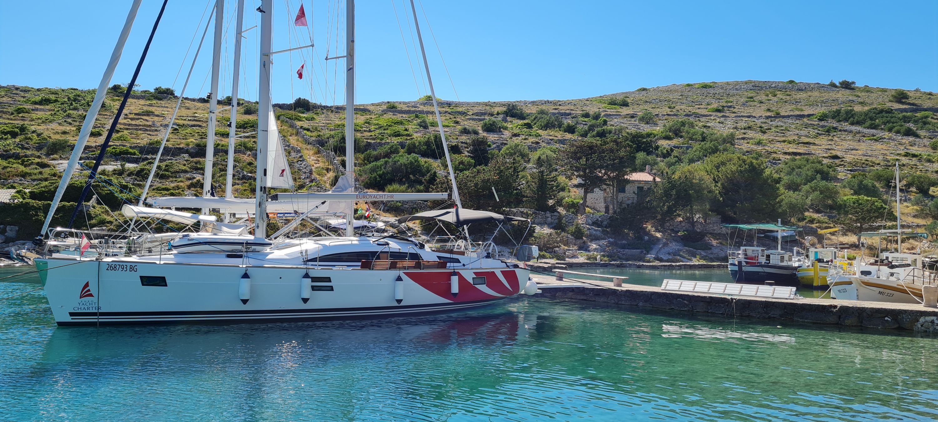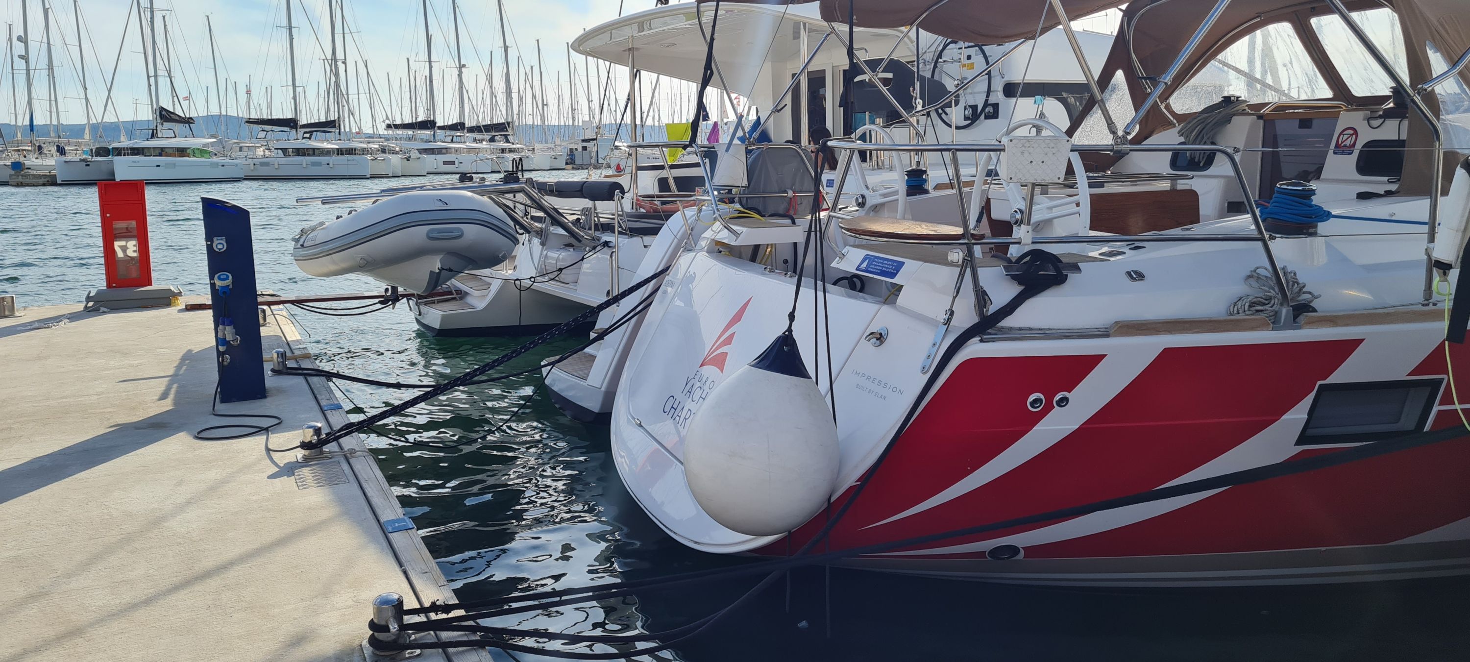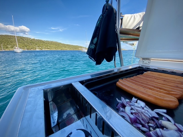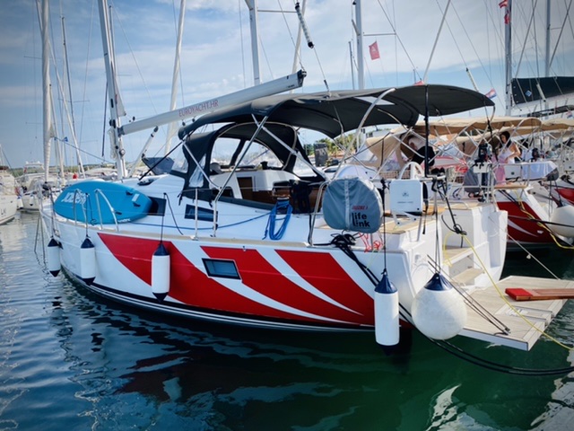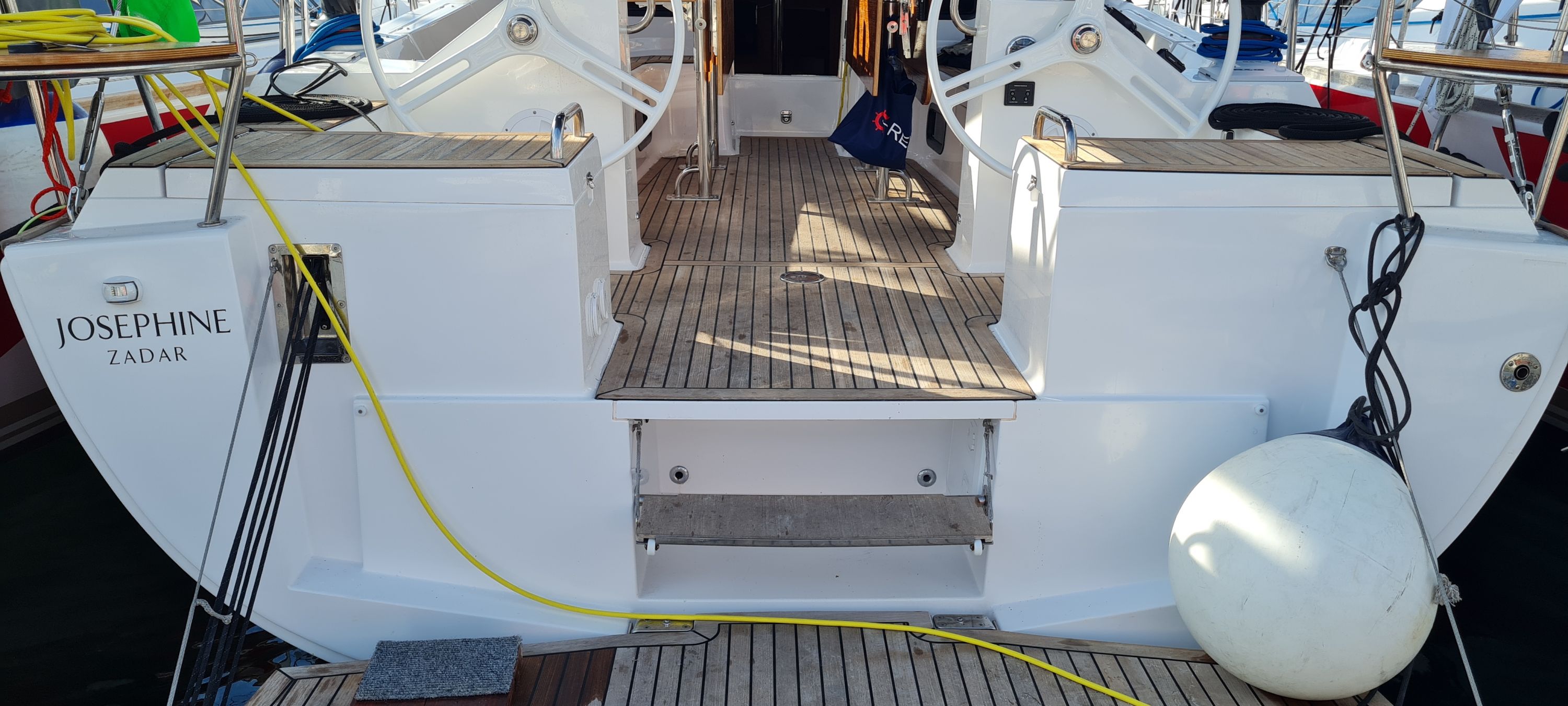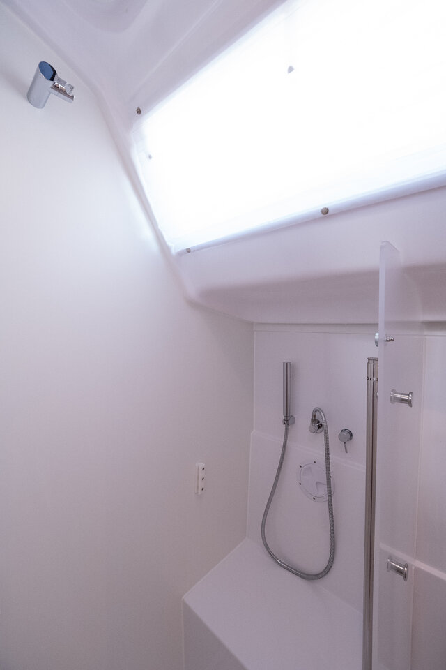 | Outside | 220 V-Landanschluss, Badeleiter, Badeplattform, Biminitop, Cockpitdusche, Cockpitlautsprecher, Cockpittisch, elektr. Ankerwinsch, Faltpropeller, Grill, Sprayhood, Teak im Cockpit |