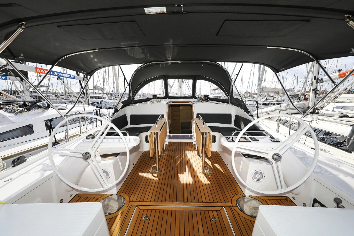 | Outside | Anker mit Kette, Badeplattform, Biminitop, Bootshaken, Cockpitdusche, Cockpitkühlschrank, Cockpitlautsprecher, Cockpitpolster, Cockpittisch, elektr. Ankerwinsch, Fender, Fernsteuerung für elektr. Ankerwinsch, Festmacherleinen, Grill, Sprayhood, Teak im Cockpit, Treibanker, Wantenschneider, Windex |