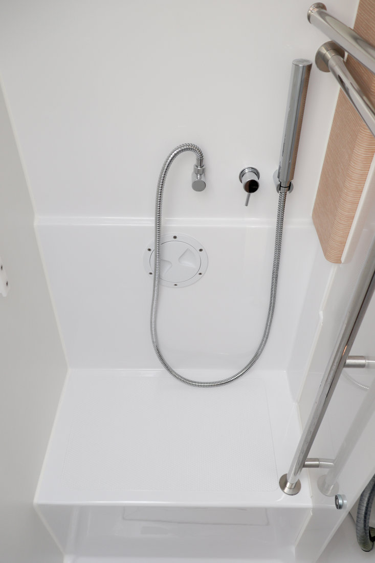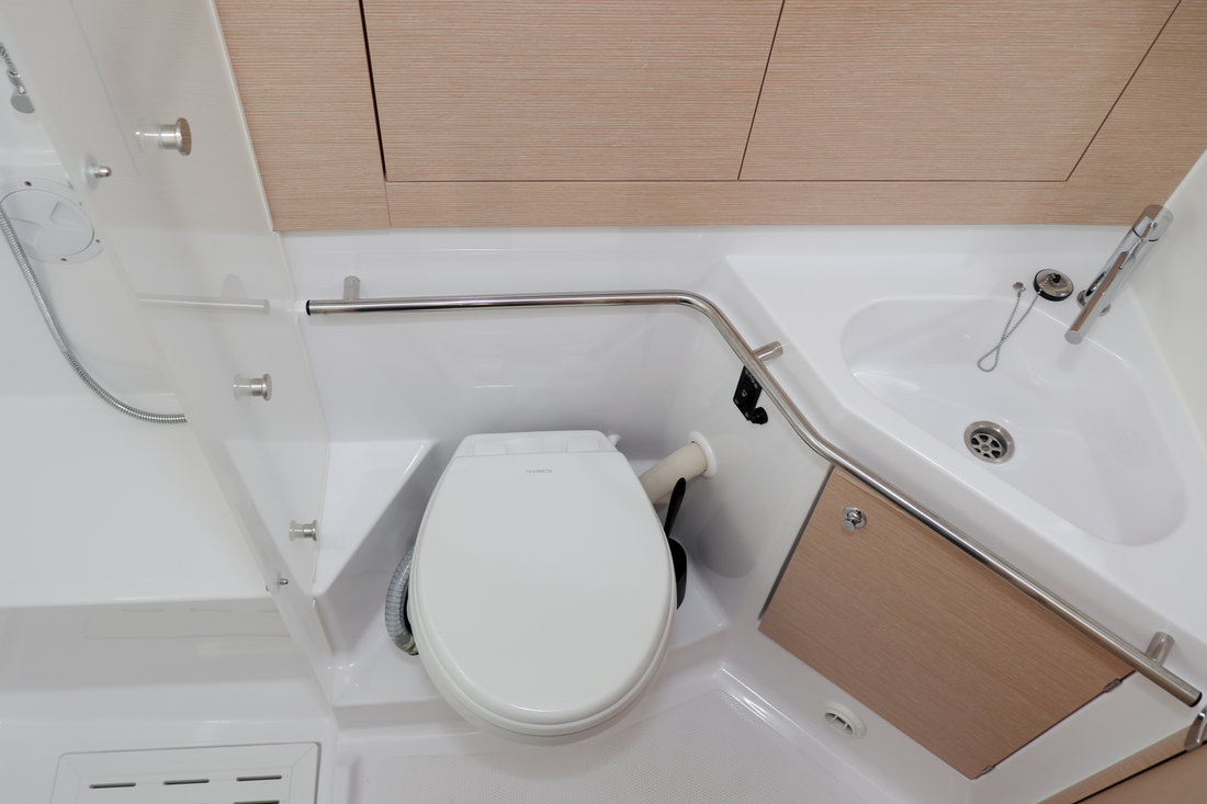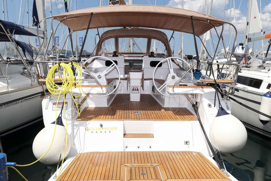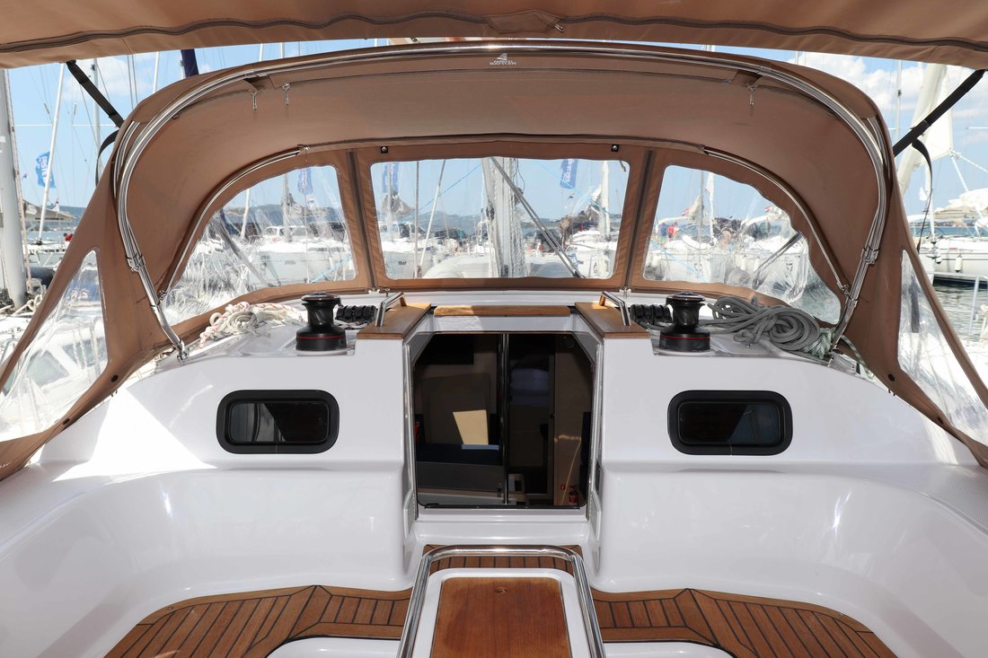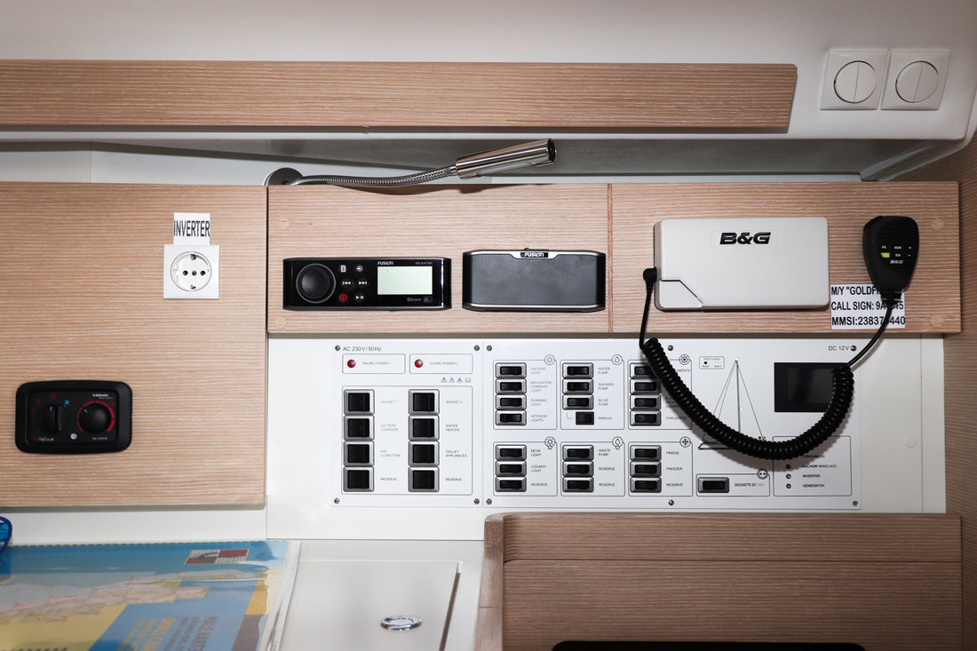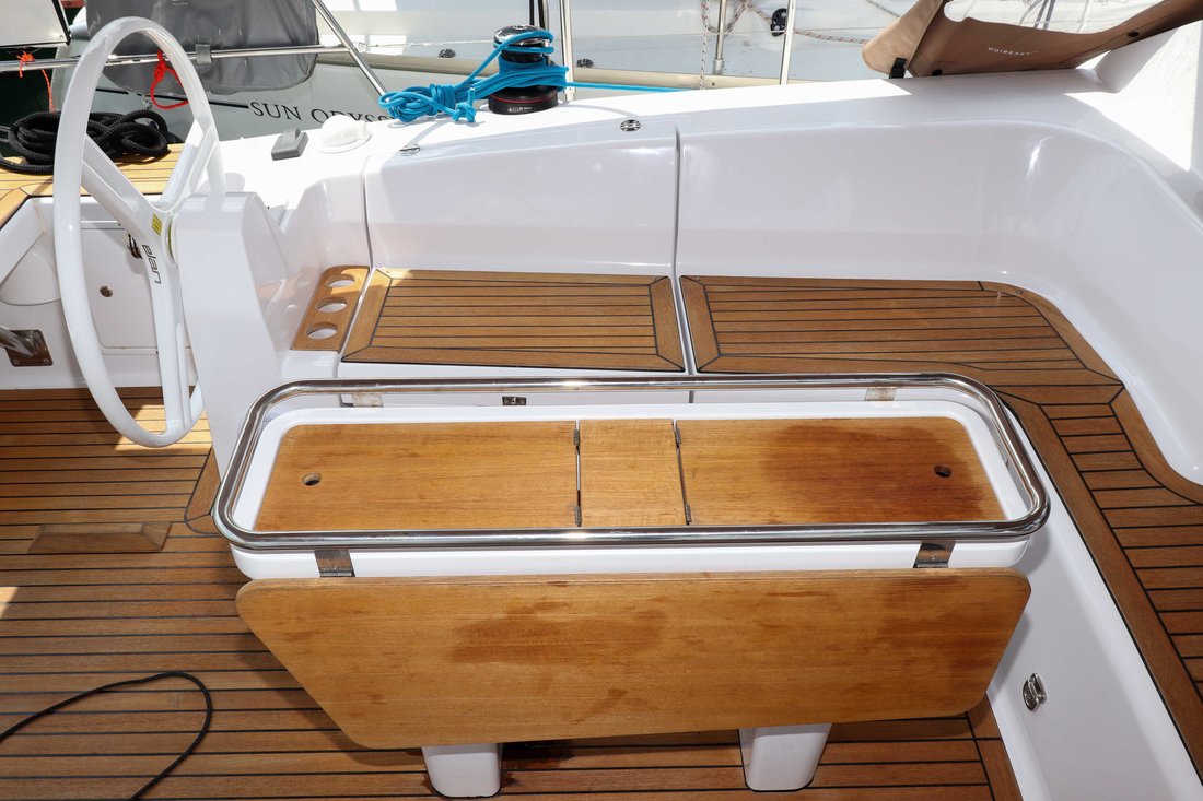 | Outside | 12 V-Anschluss, Badeplattform, Biminitop, Cockpitdusche warm/kalt, Cockpitlautsprecher, Cockpitpolster, Cockpittisch, Deckbeleuchtung, Delta-Anker, elektr. Ankerwinsch, Faltpropeller, Fender, Fernsteuerung für elektr. Ankerwinsch, Festmacherleinen, Pantry im Cockpit, Sprayhood, Teak auf Badeplattform, Teak im Cockpit, Wantenschneider, Windex |