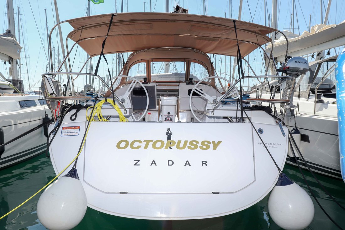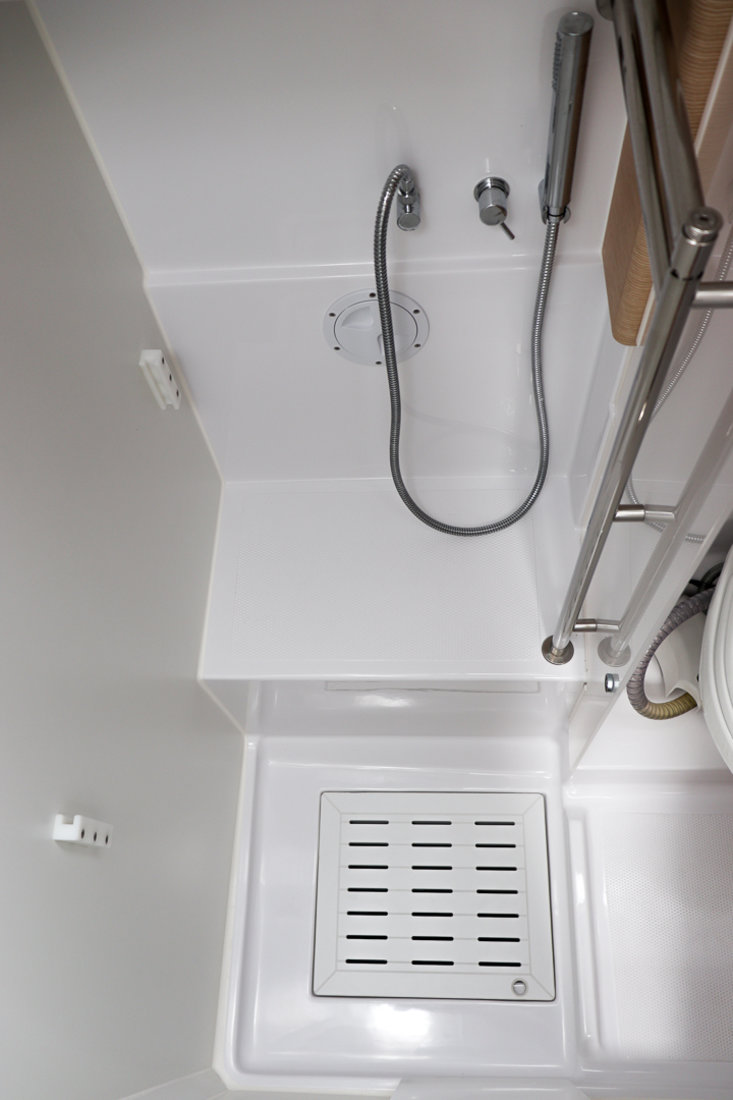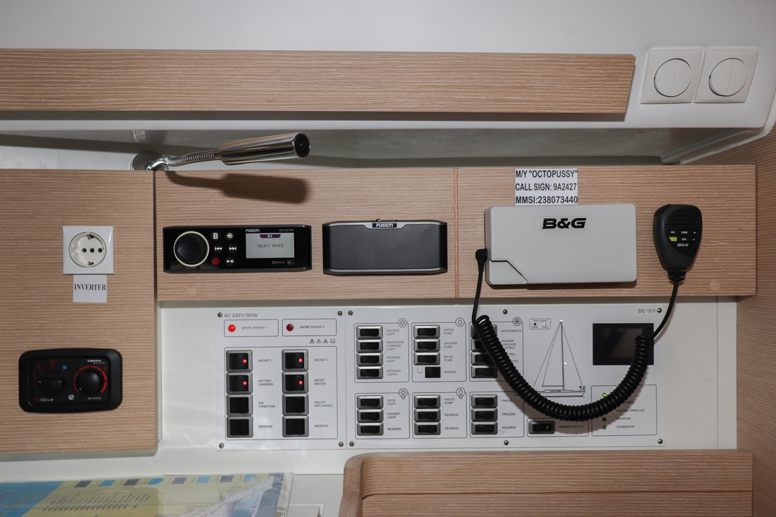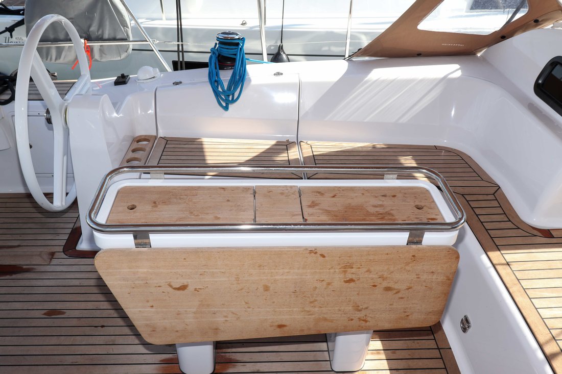 | Outside | 12 V-Anschluss, Badeplattform, Biminitop, Cockpitdusche warm/kalt, Cockpitlautsprecher, Cockpitpolster, Cockpittisch, Deckbeleuchtung, Delta-Anker, elektr. Ankerwinsch, Faltpropeller, Fender, Fernsteuerung für elektr. Ankerwinsch, Festmacherleinen, Pantry im Cockpit, Sprayhood, Teak auf Badeplattform, Teak im Cockpit, Wantenschneider, Windex |
