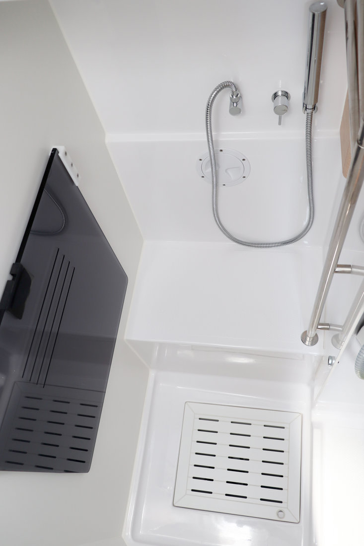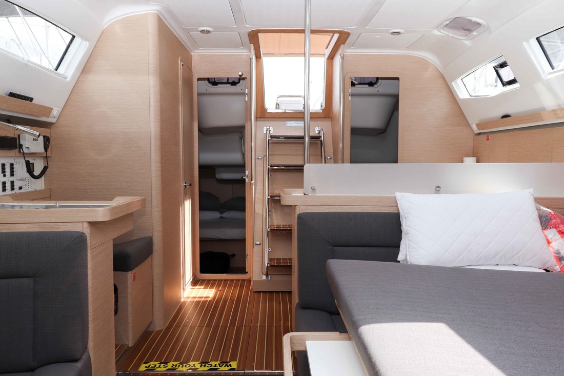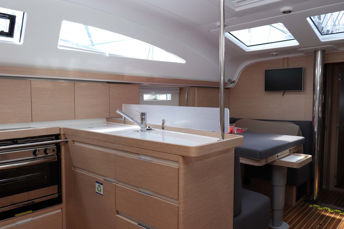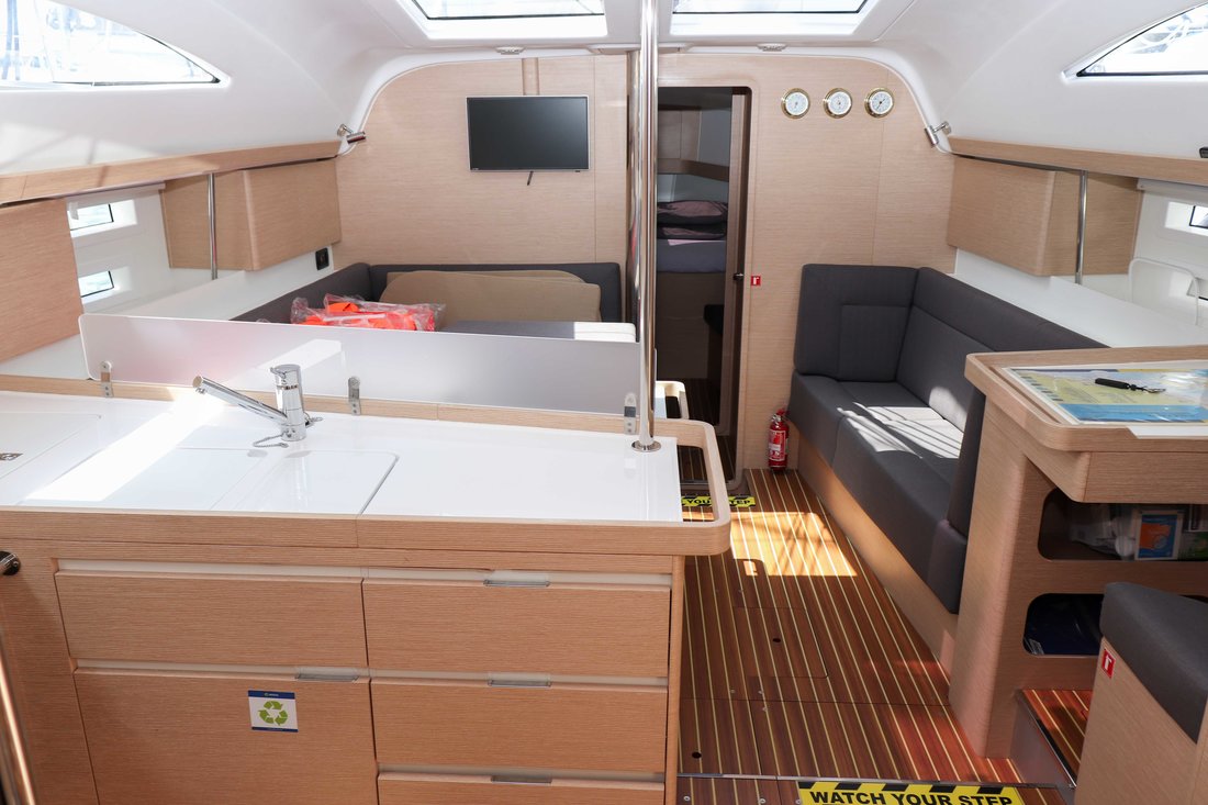 | Outside | 12 V-Anschluss, Badeplattform, Biminitop, Cockpitdusche warm/kalt, Cockpitlautsprecher, Cockpitpolster, Cockpittisch, Deckbeleuchtung, Delta-Anker, elektr. Ankerwinsch, Faltpropeller, Fender, Fernsteuerung für elektr. Ankerwinsch, Festmacherleinen, Pantry im Cockpit, Sprayhood, Teak auf Badeplattform, Teak im Cockpit, Wantenschneider, Windex |