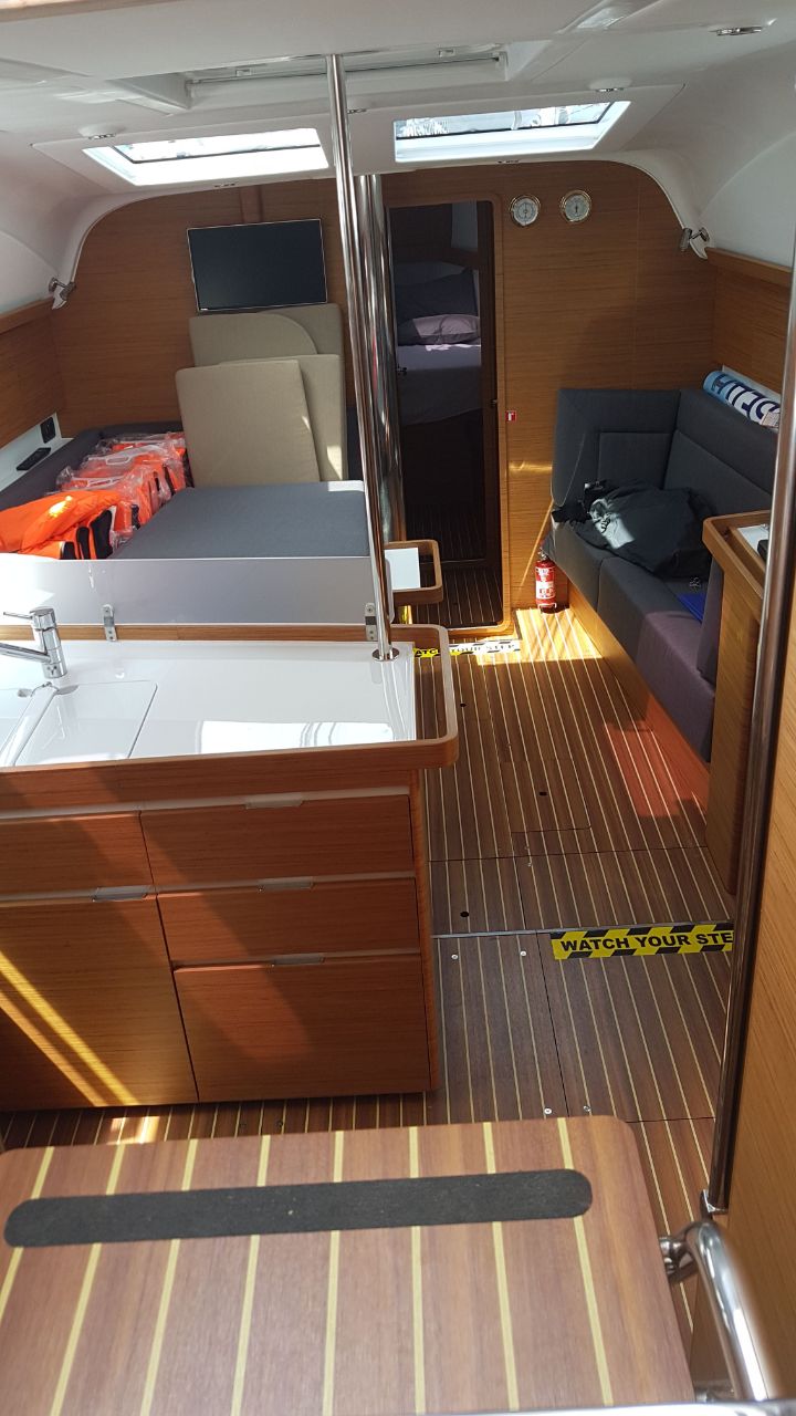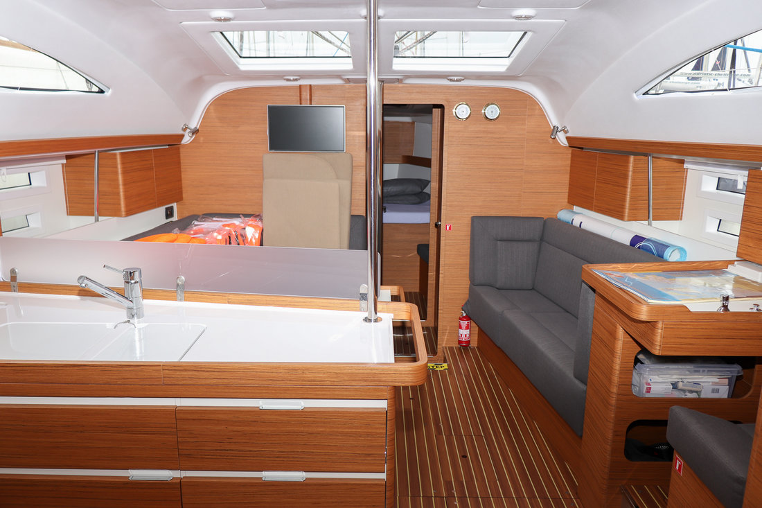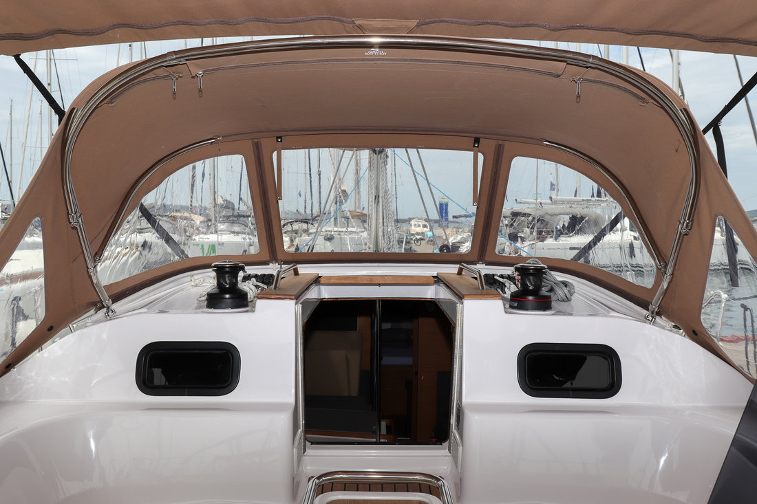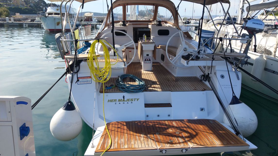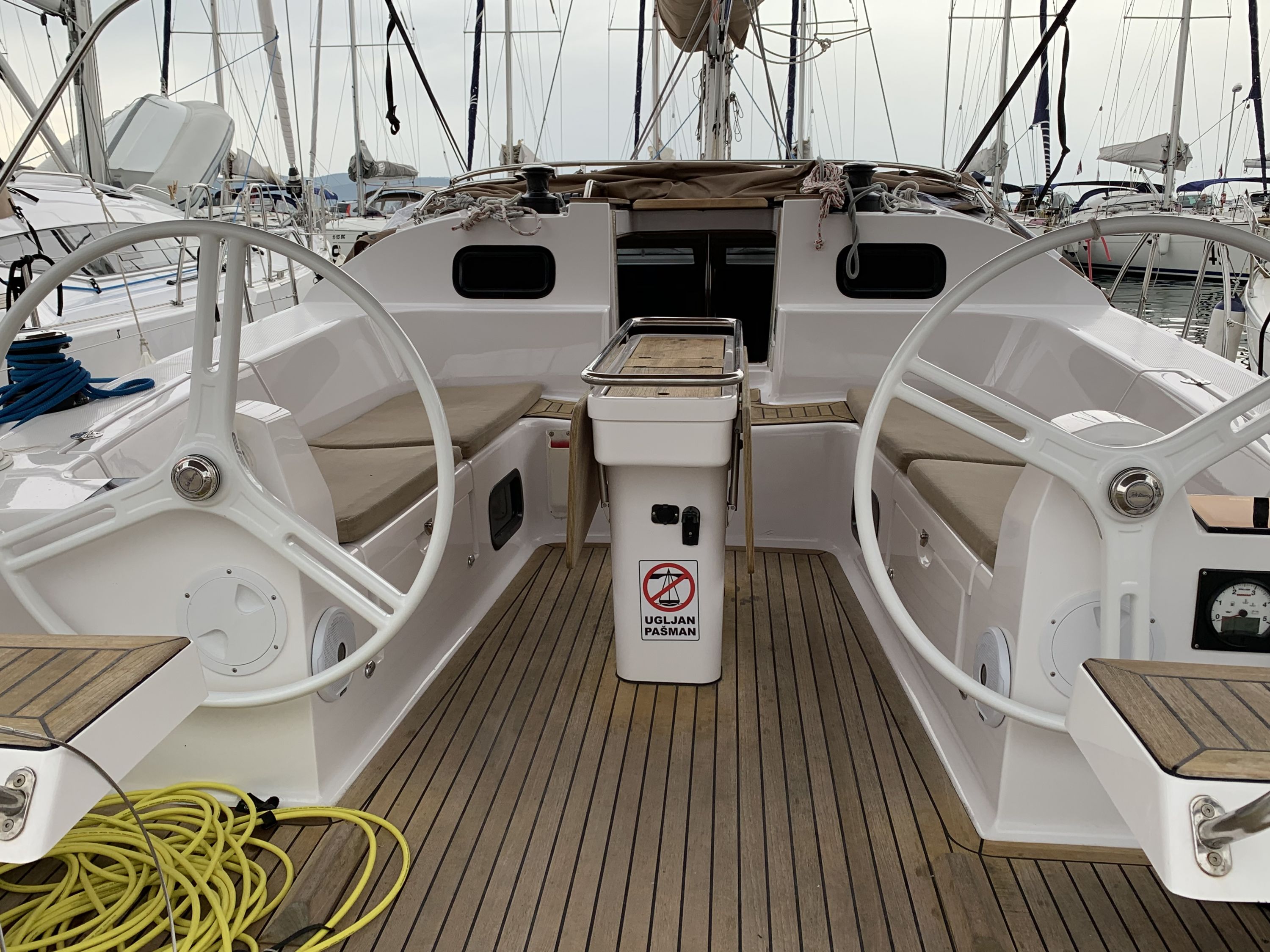 | Outside | 12 V-Anschluss, Badeplattform, Biminitop, Cockpitdusche warm/kalt, Cockpitlautsprecher, Cockpitpolster, Cockpittisch, Deckbeleuchtung, Delta-Anker, elektr. Ankerwinsch, Faltpropeller, Fender, Fernsteuerung für elektr. Ankerwinsch, Festmacherleinen, Pantry im Cockpit, Sprayhood, Teak im Cockpit, Wantenschneider, Windex |
