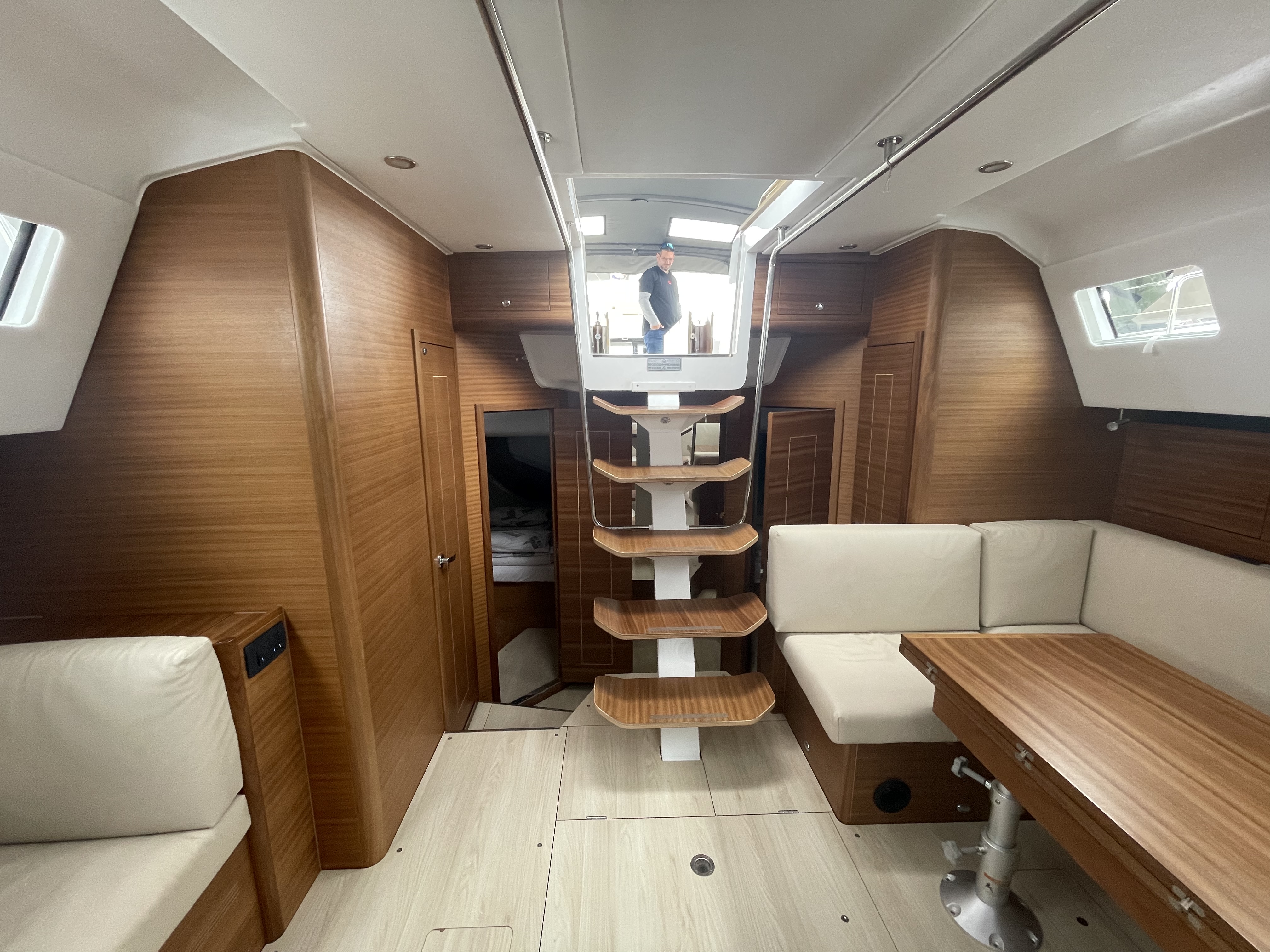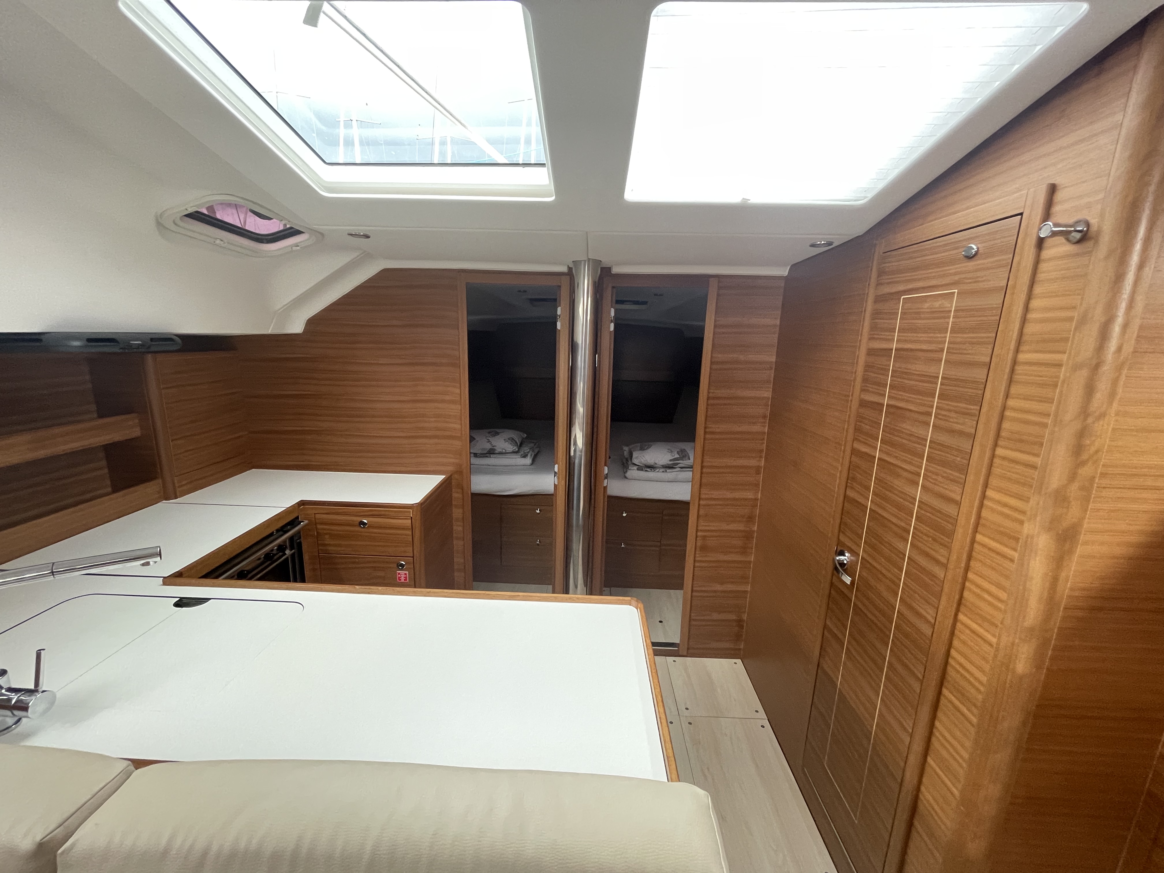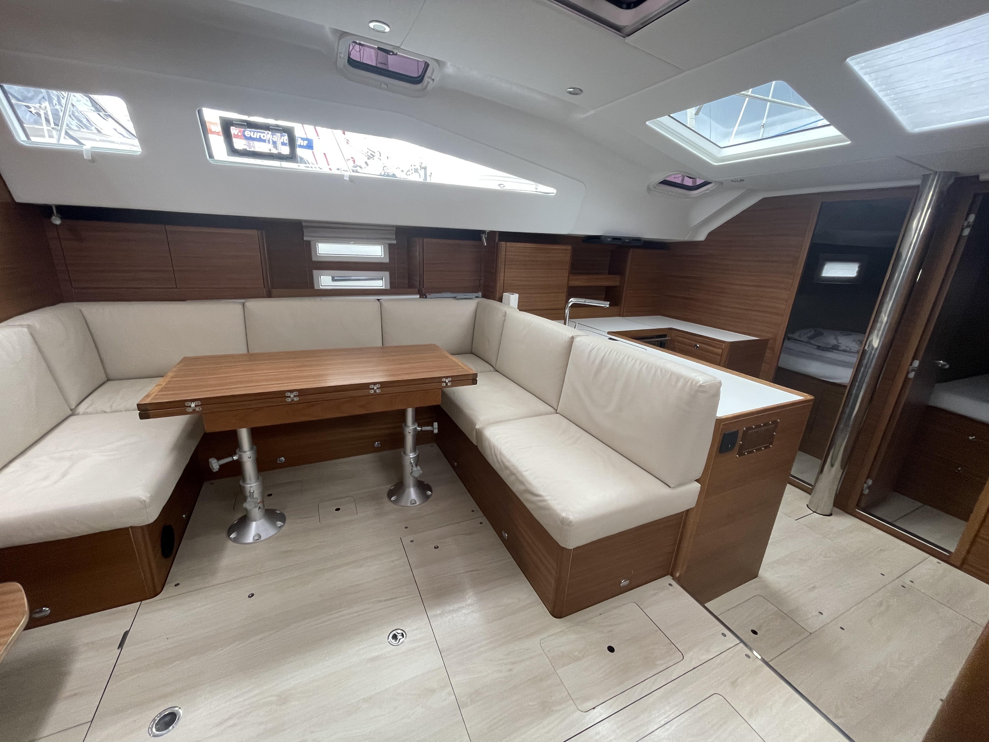 Bei der Übernahme der Yacht war ein Auflager der Bodenluke gebrochen ( Elan Problem) sowie die Tischverstellung in der Pantry defekt. Dieses würde am nächsten Tag morgens behoben.