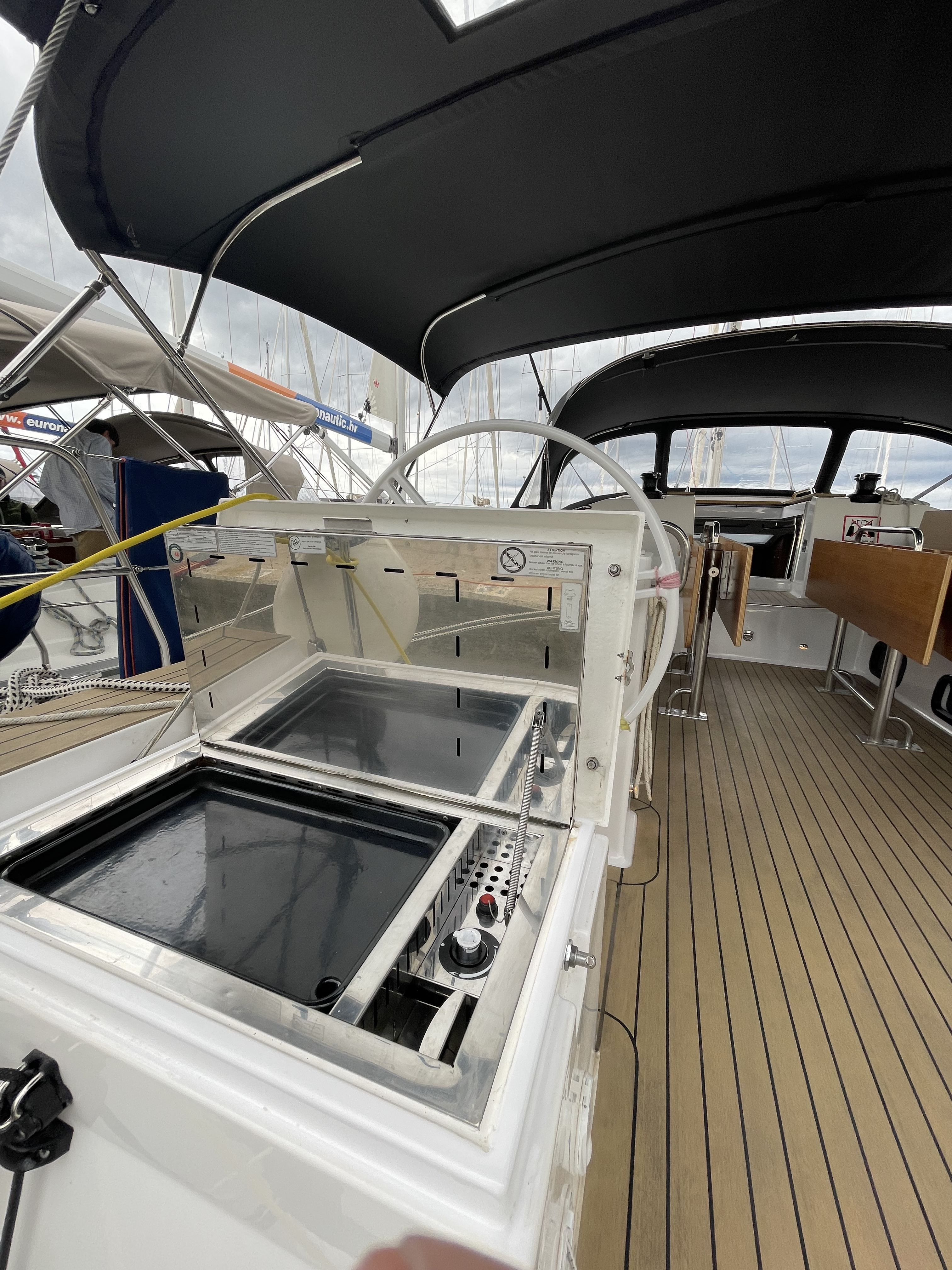 | Outside | Anker mit Kette, Badeplattform, Biminitop, Cockpitdusche, Cockpitkühlschrank, Cockpitlautsprecher, Cockpitpolster, Cockpittisch, elektr. Ankerwinsch, Fender, Fernsteuerung für elektr. Ankerwinsch, Festmacherleinen, Gas-Barbecue-Grill im Cockpit, Sprayhood, Spülbecken im Cockpit, Teak im Cockpit, Treibanker, Wantenschneider, Windex |