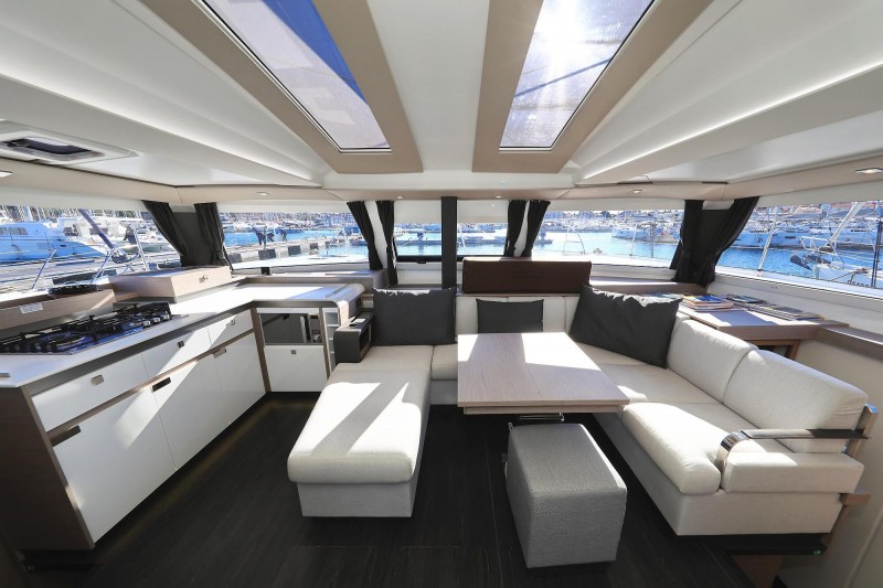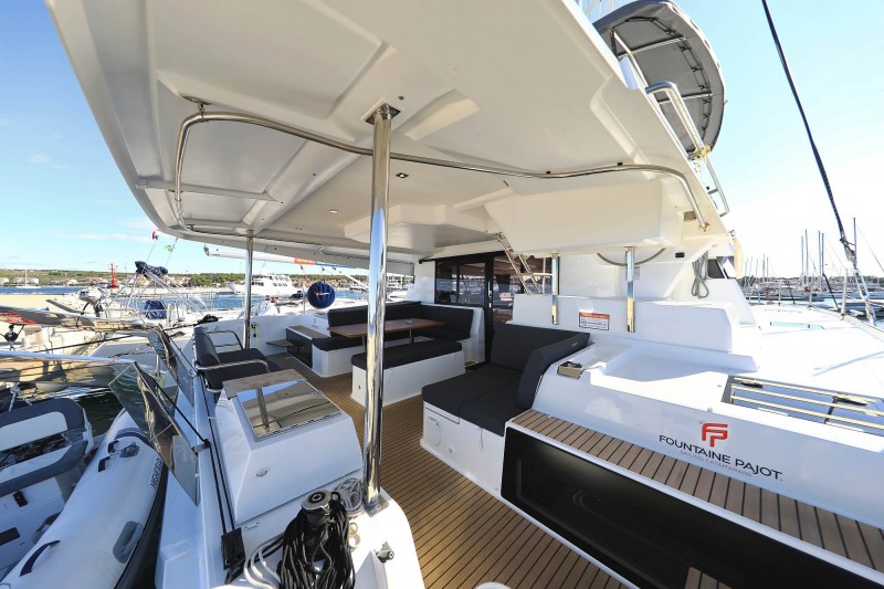 | Outside | 220 V-Landanschluss, Anker mit Kette, Biminitop, Cockpitlautsprecher, Cockpitleuchte, Cockpitpolster, Cockpittisch, Deckbeleuchtung, Deckpolster, elektr. Ankerwinsch, elektr. Winsch, Fender, Festmacherleinen, Grill, Solaranlage, Sonnendeck, Sonnensegel, Teak im Cockpit, Wantenschneider |