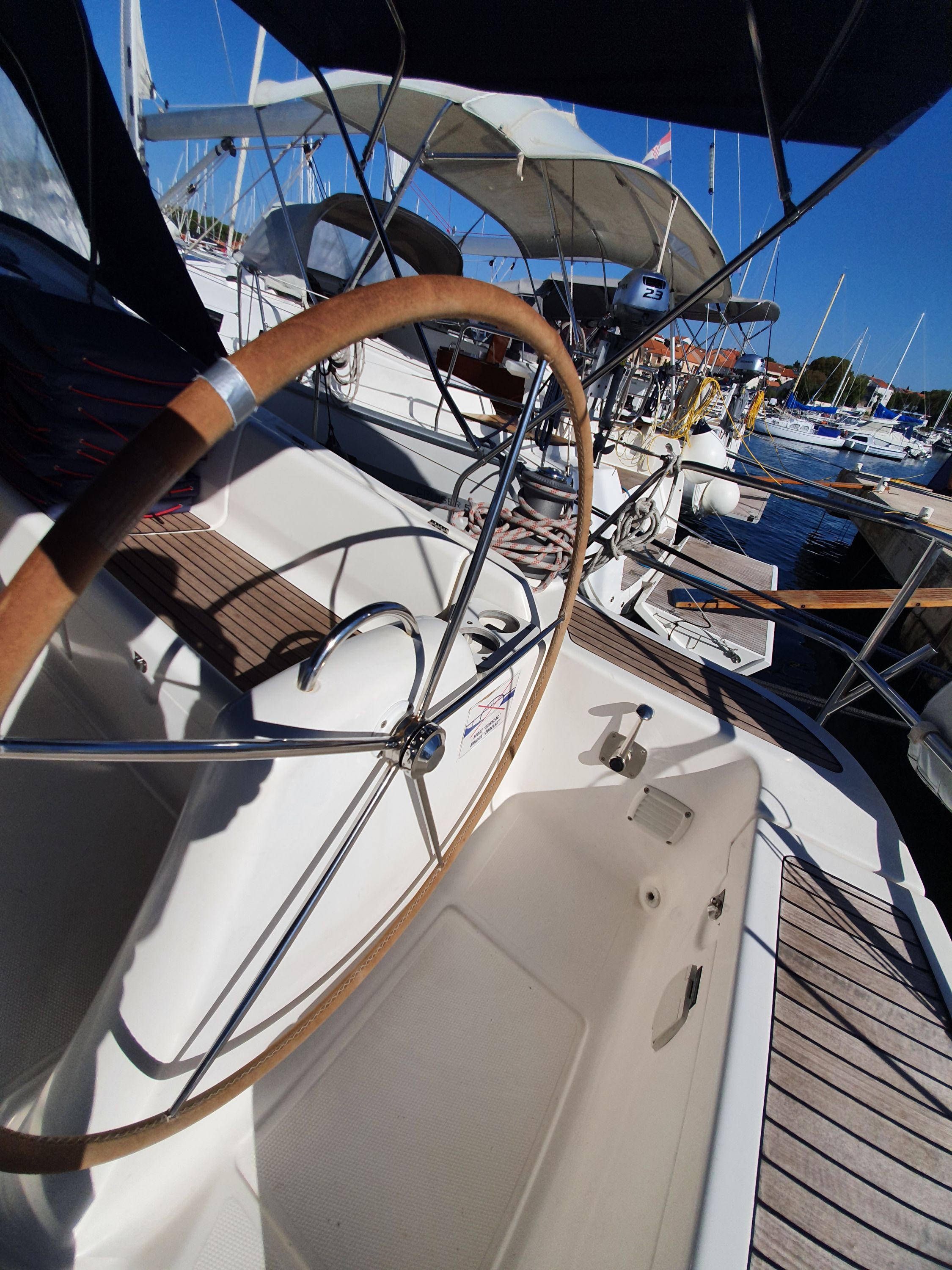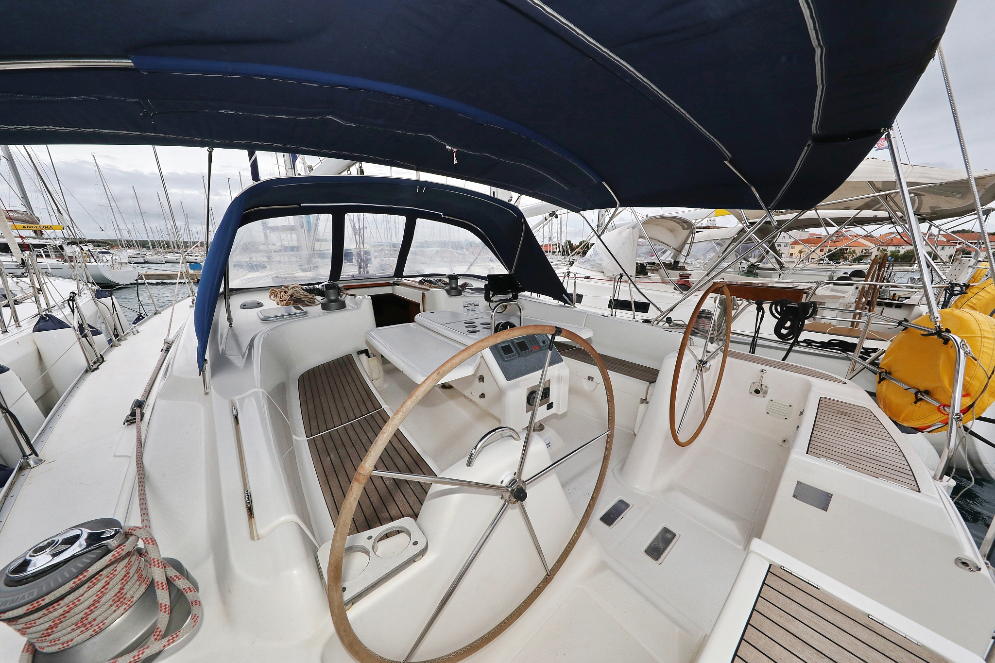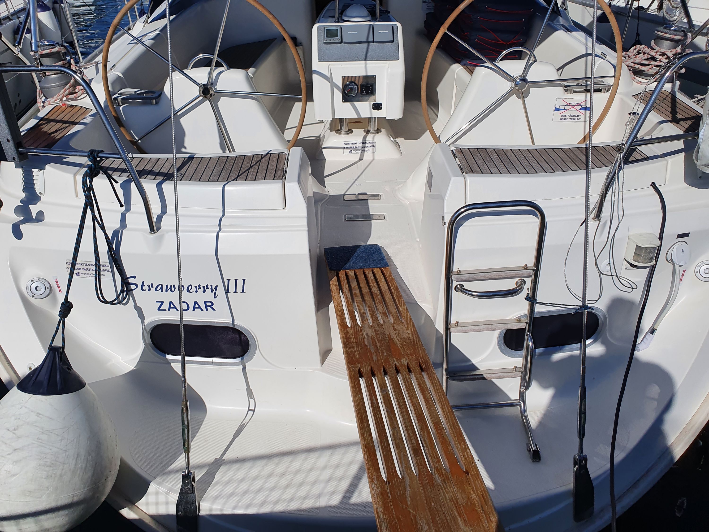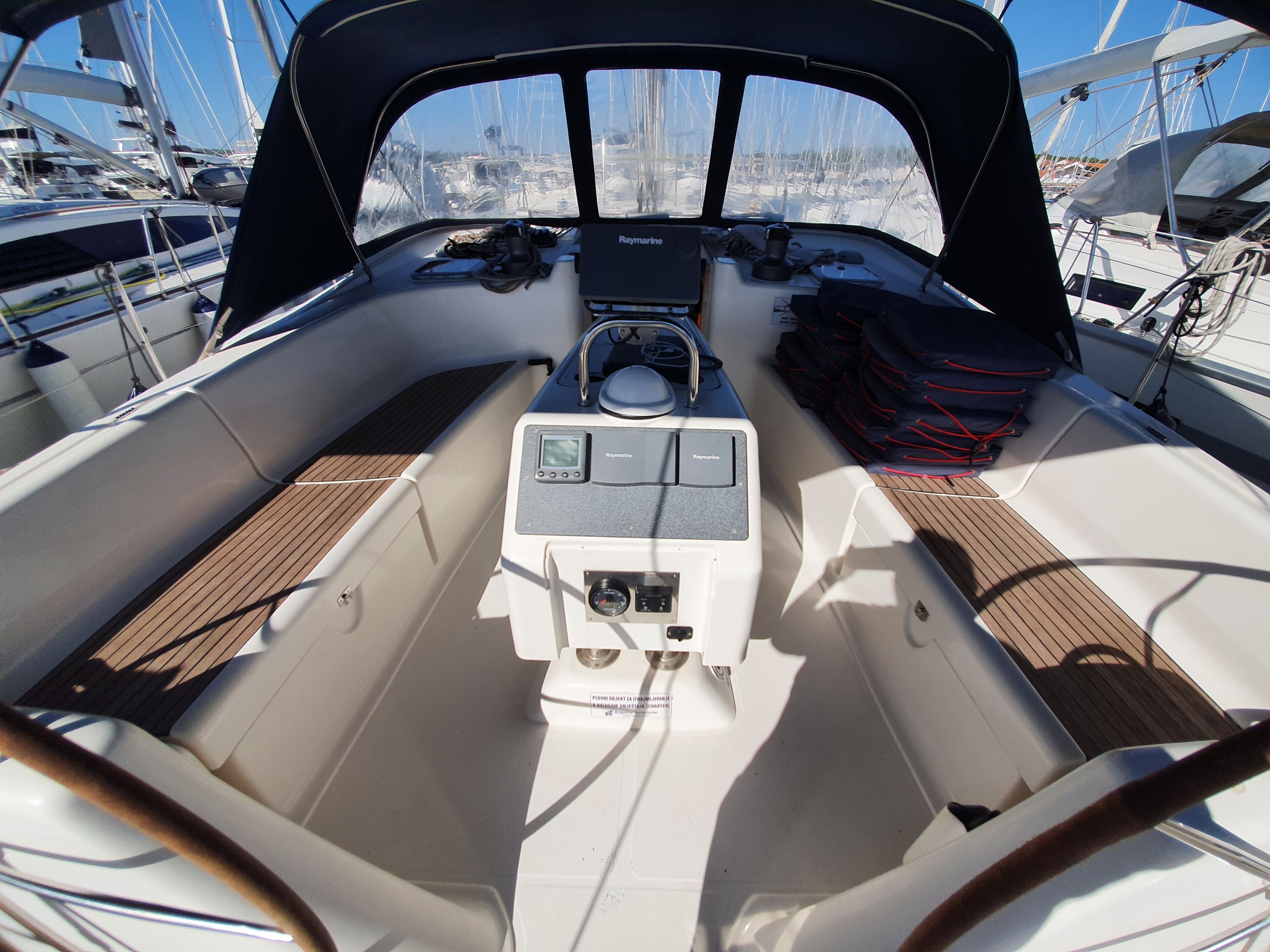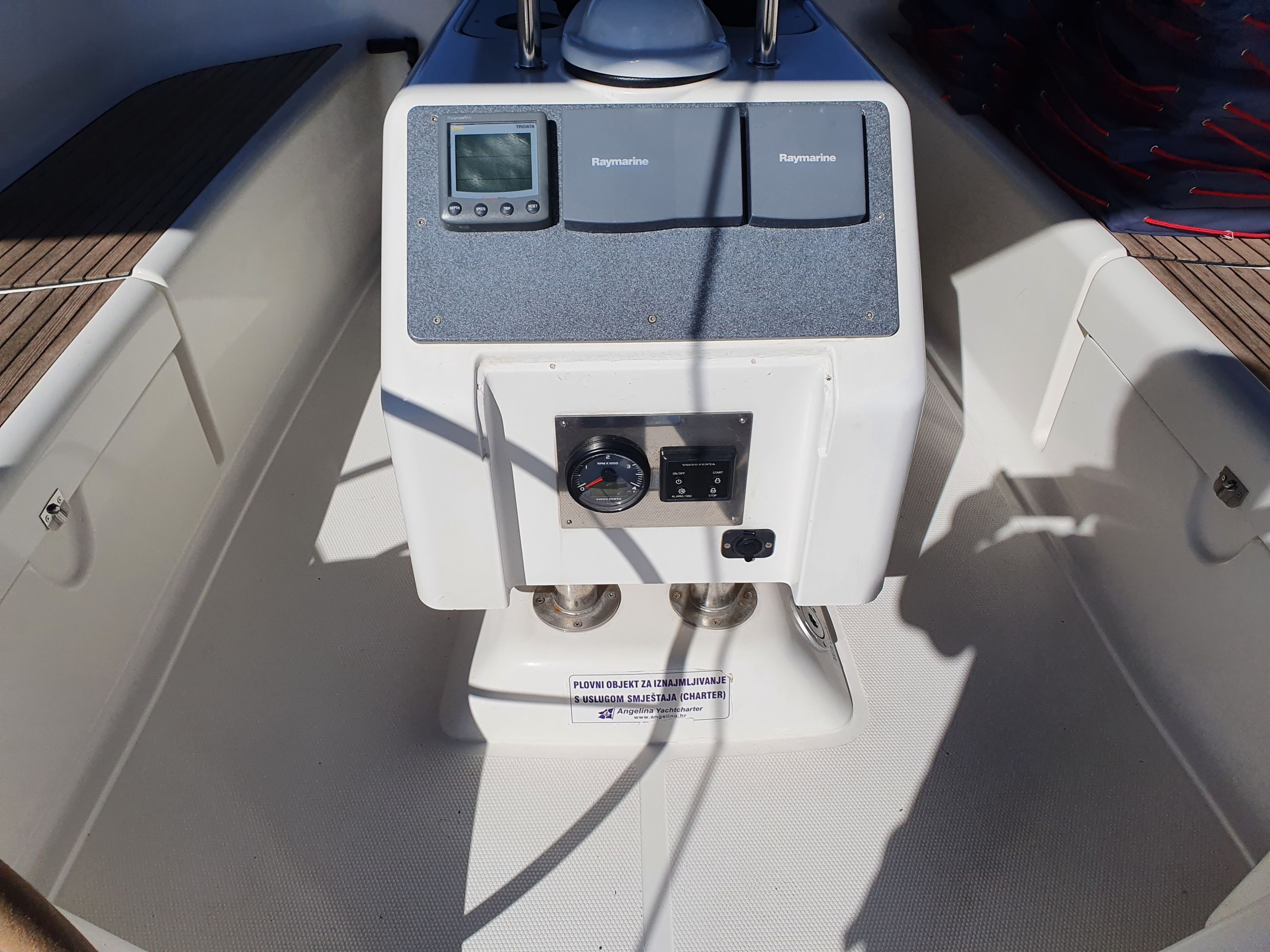 | Outside | 220 V-Landanschluss, Anker mit Kette, Biminitop, Cockpitdusche, Cockpitpolster, Cockpittisch, elektr. Ankerwinsch, Fender, Gangway, Kugelfender, Sprayhood, Teak im Cockpit, Winschen |