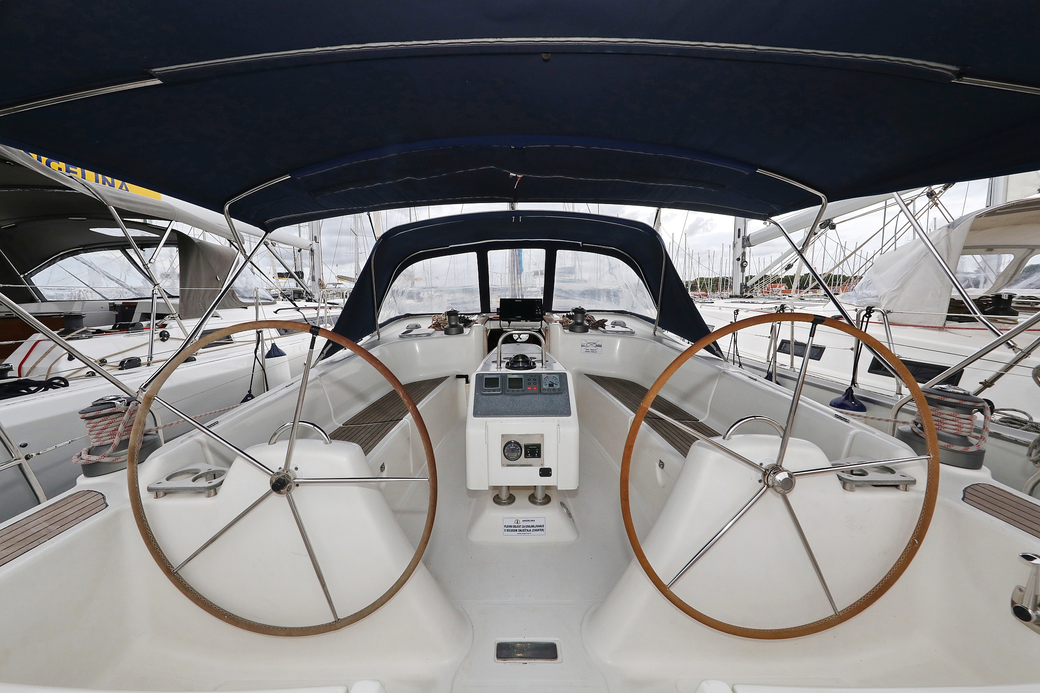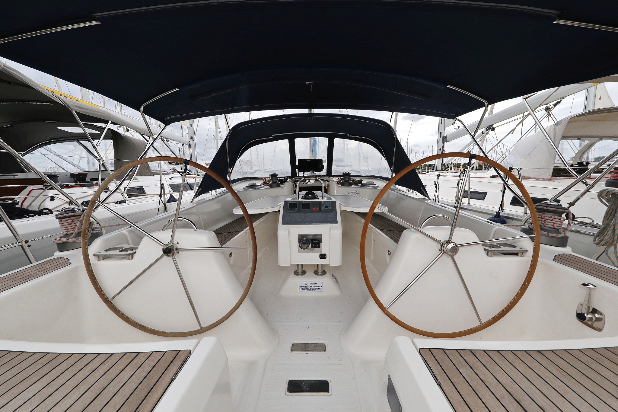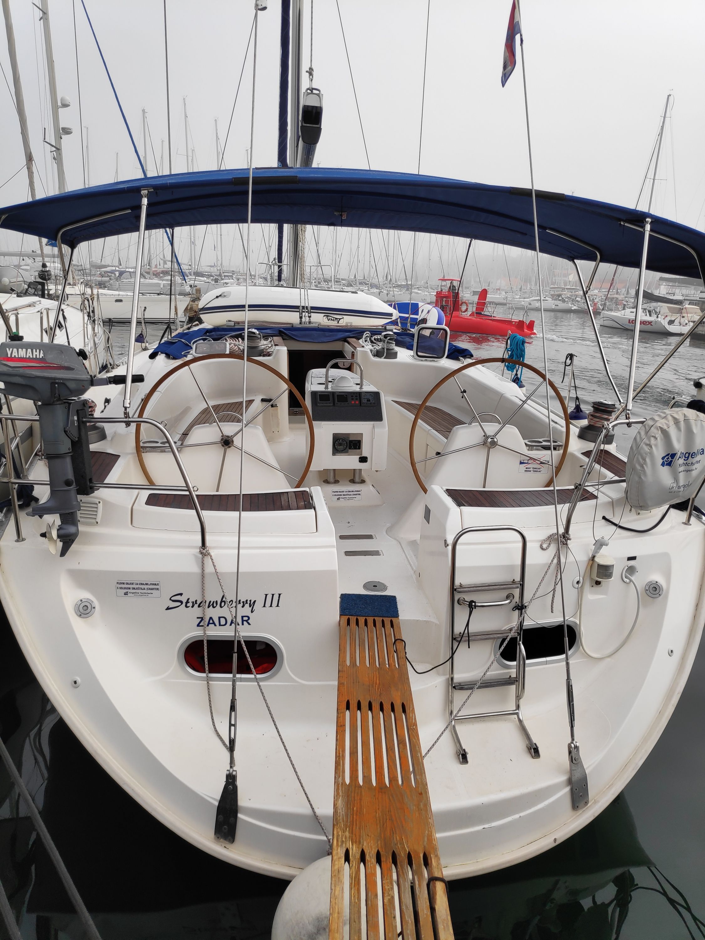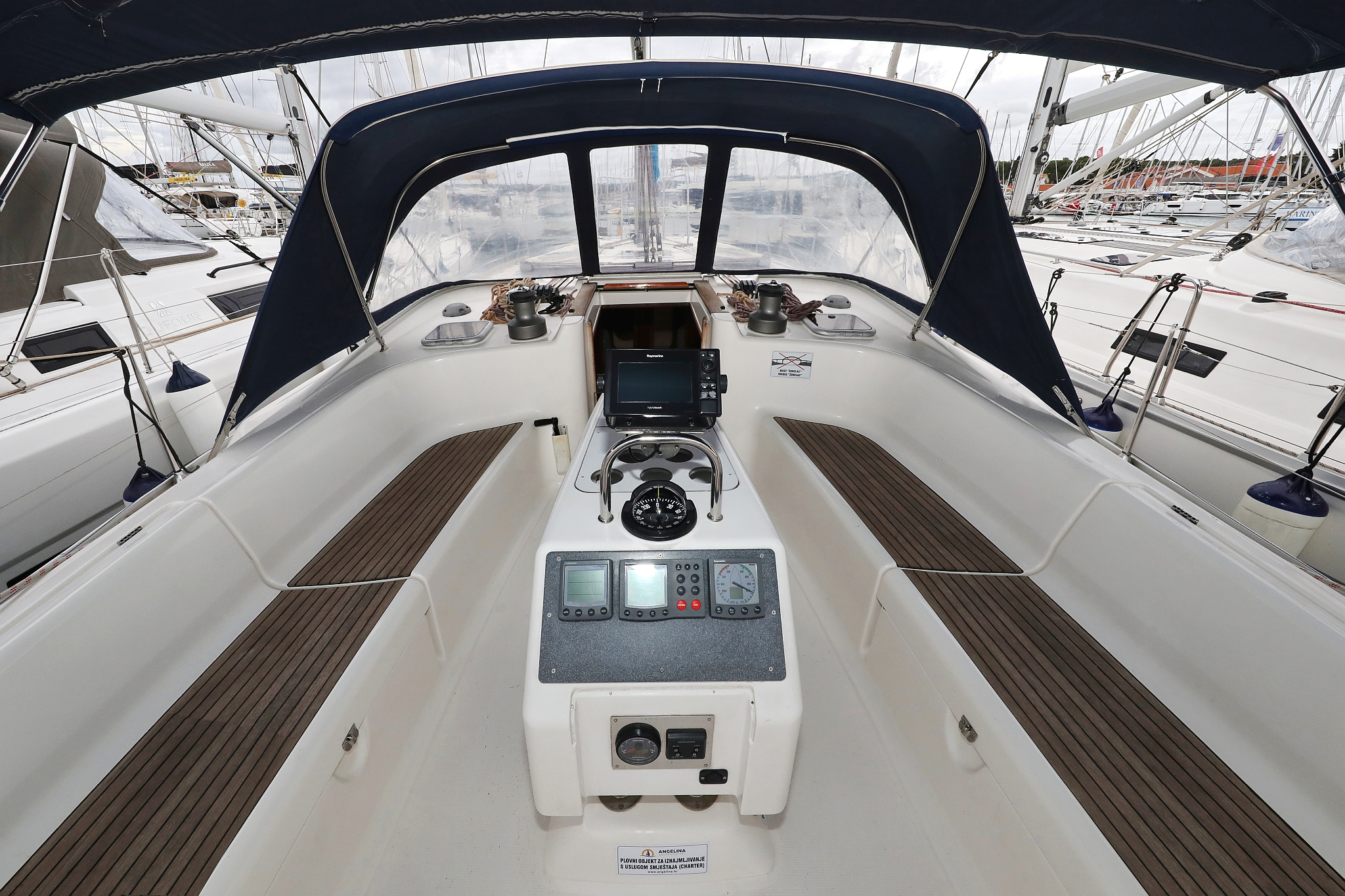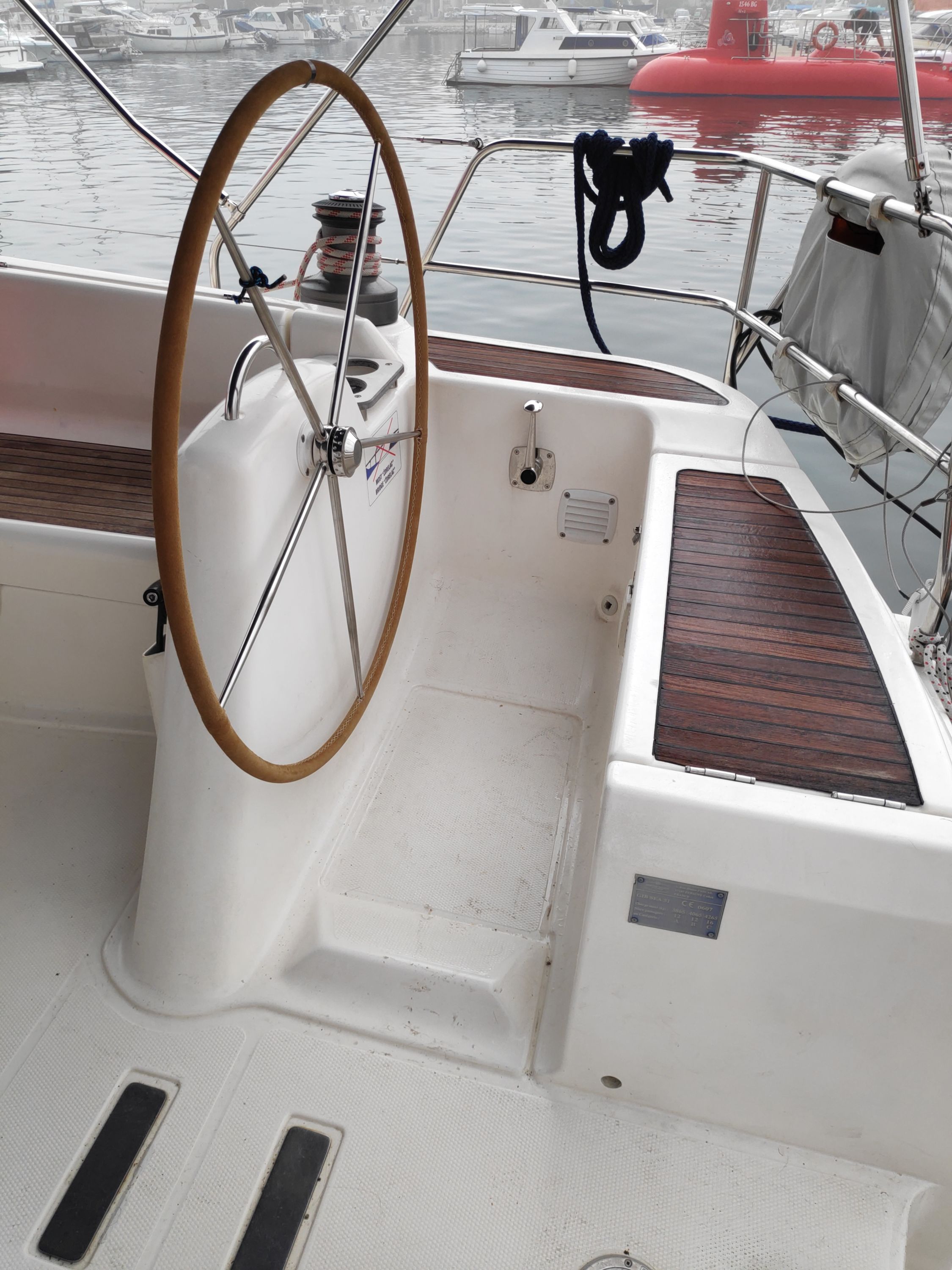 | Outside | 220 V-Landanschluss, Anker mit Kette, Biminitop, Cockpitdusche, Cockpitpolster, Cockpittisch, elektr. Ankerwinsch, Fender, Gangway, Kugelfender, Sprayhood, Teak im Cockpit, Winschen |