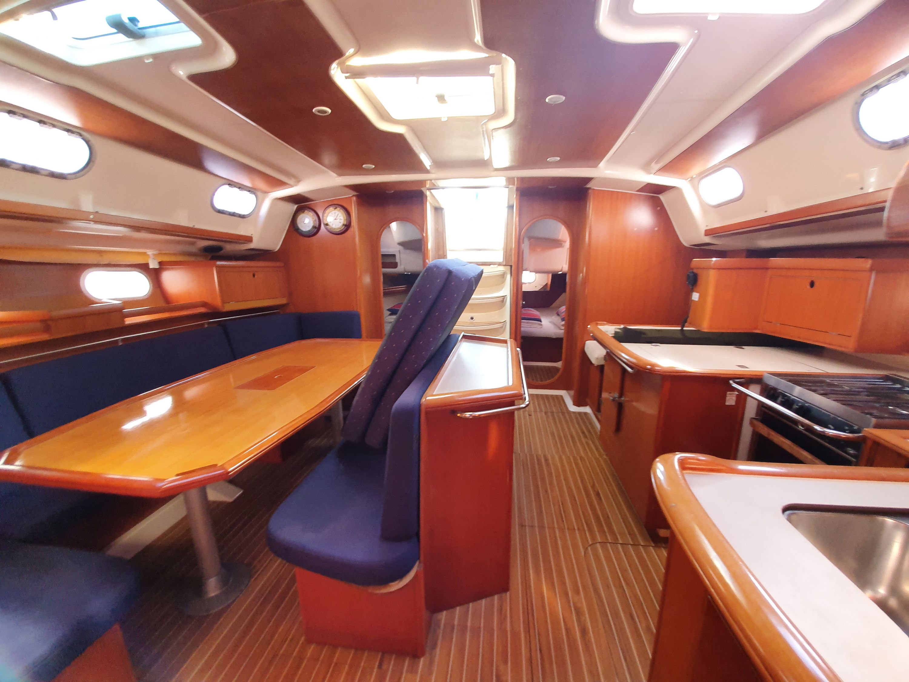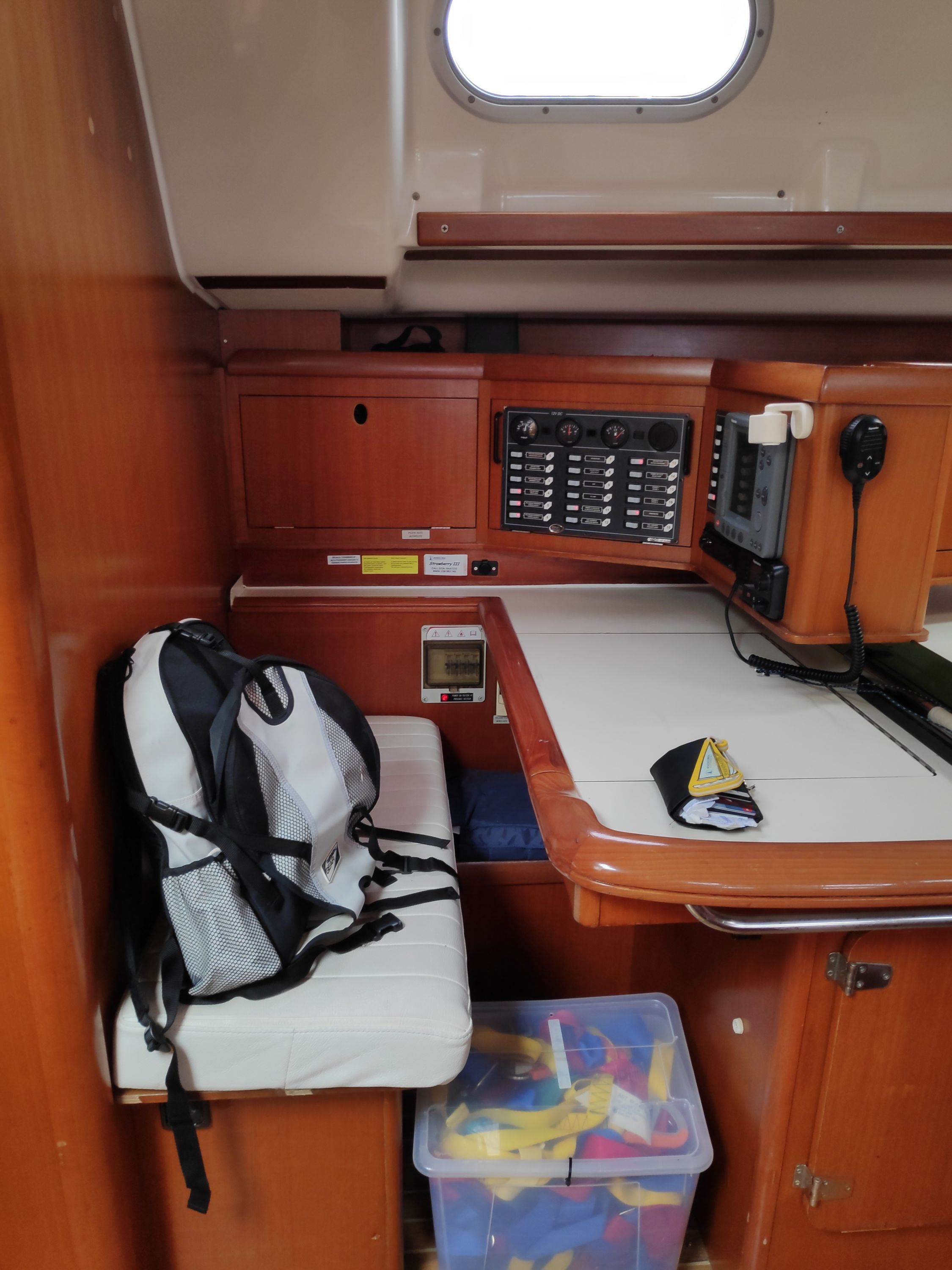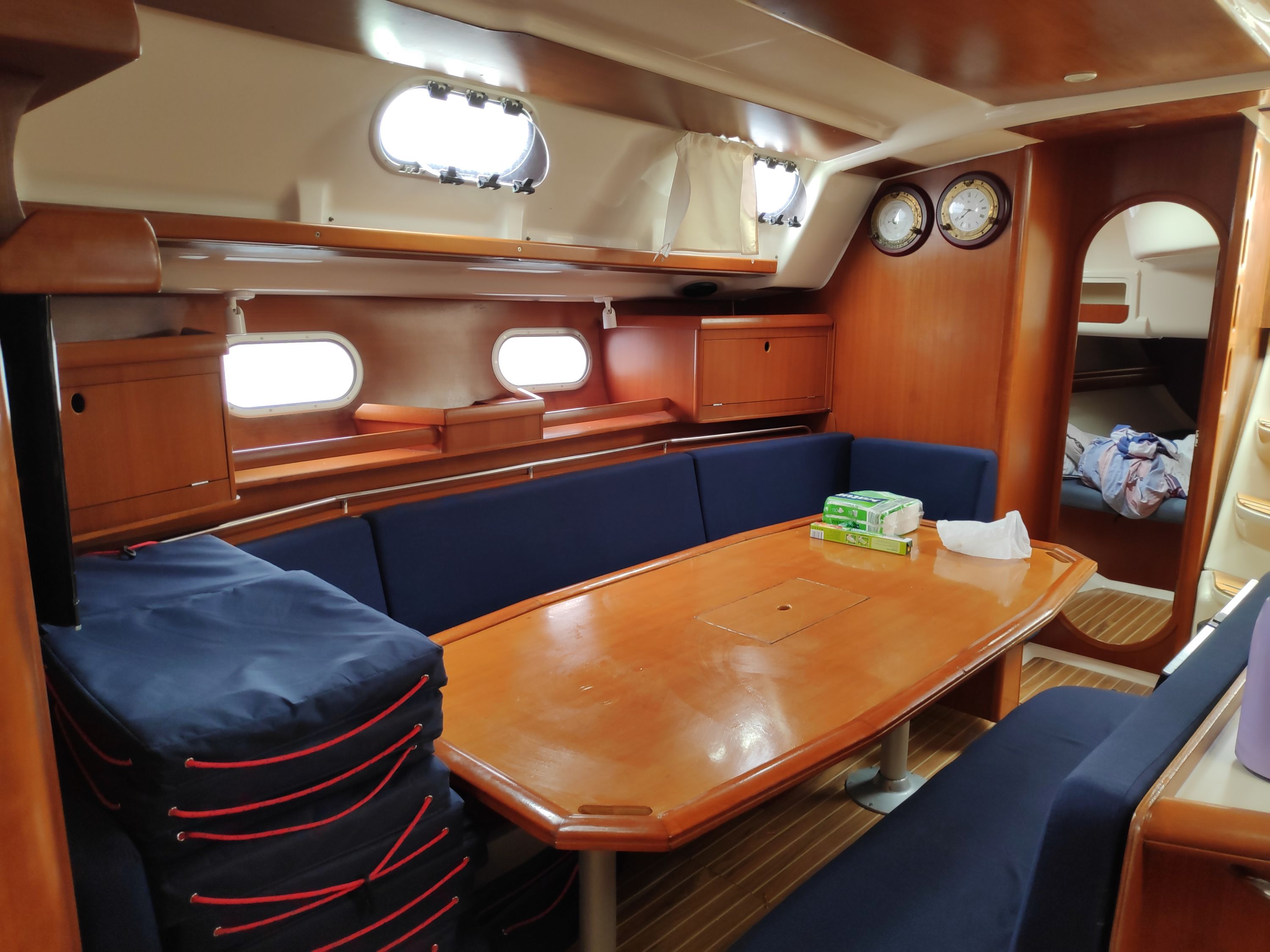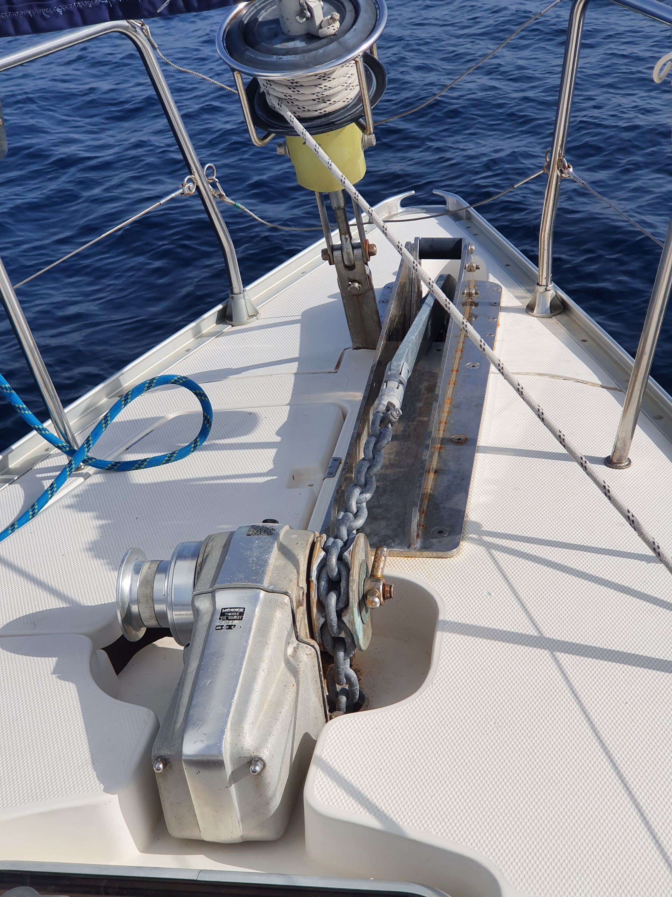 | Navigation | Fernglas, GPS mit Kartenplotter im Cockpit, GPS mit Kartenplotter im Salon, Hafenhandbücher, Kompass, Seekarten, Tridata (Log, Echolot, Windm.), Windmesser |
