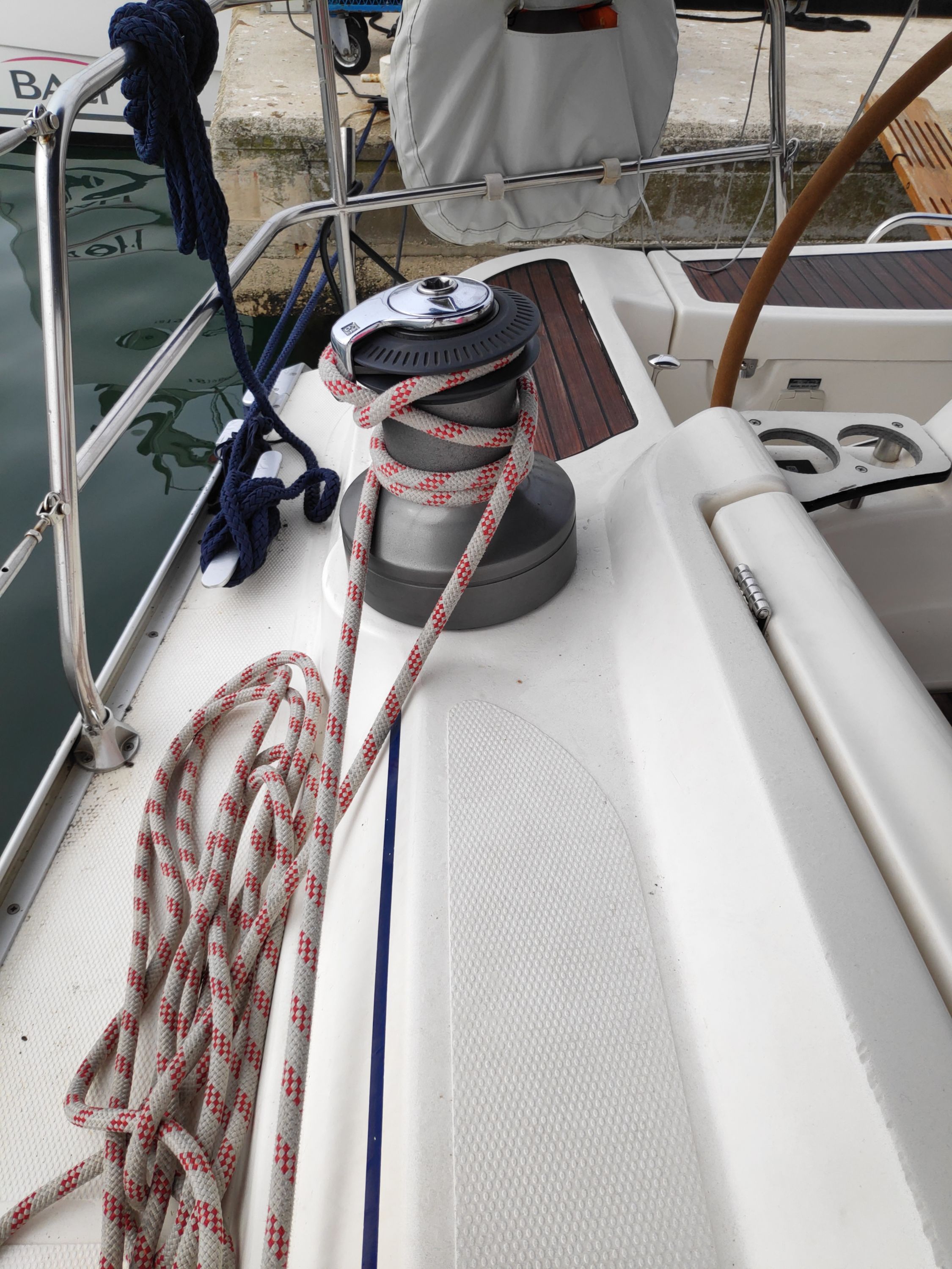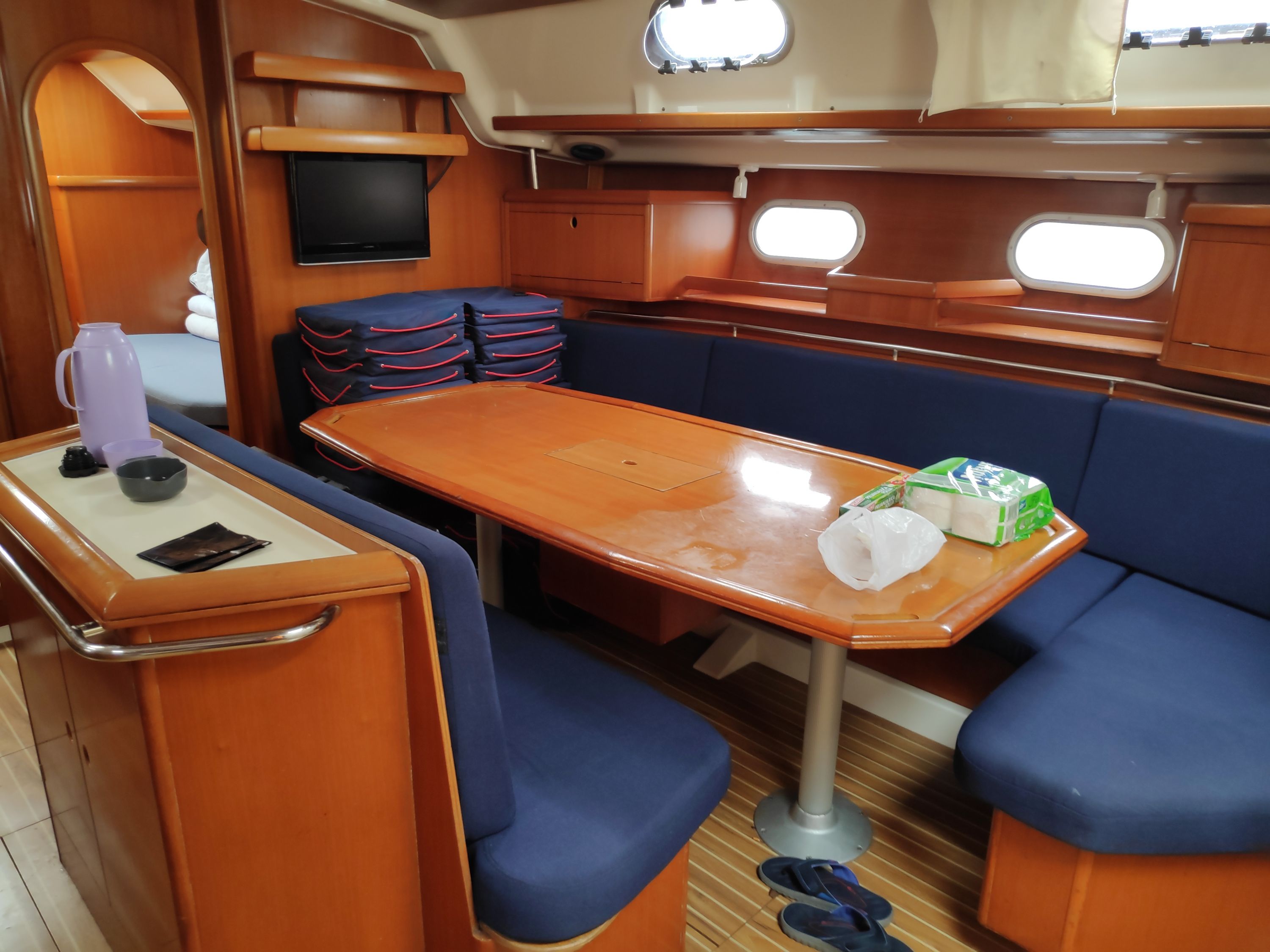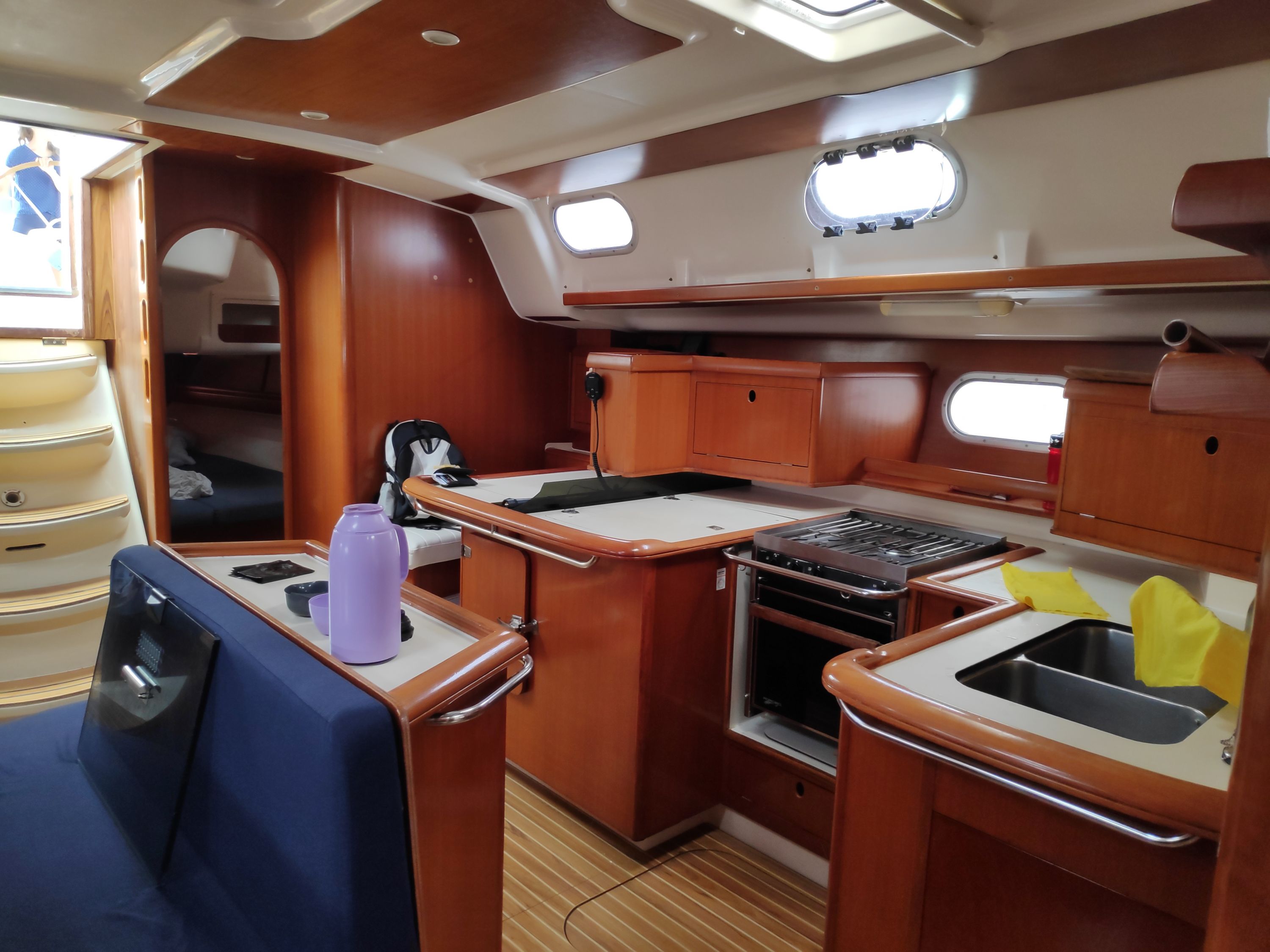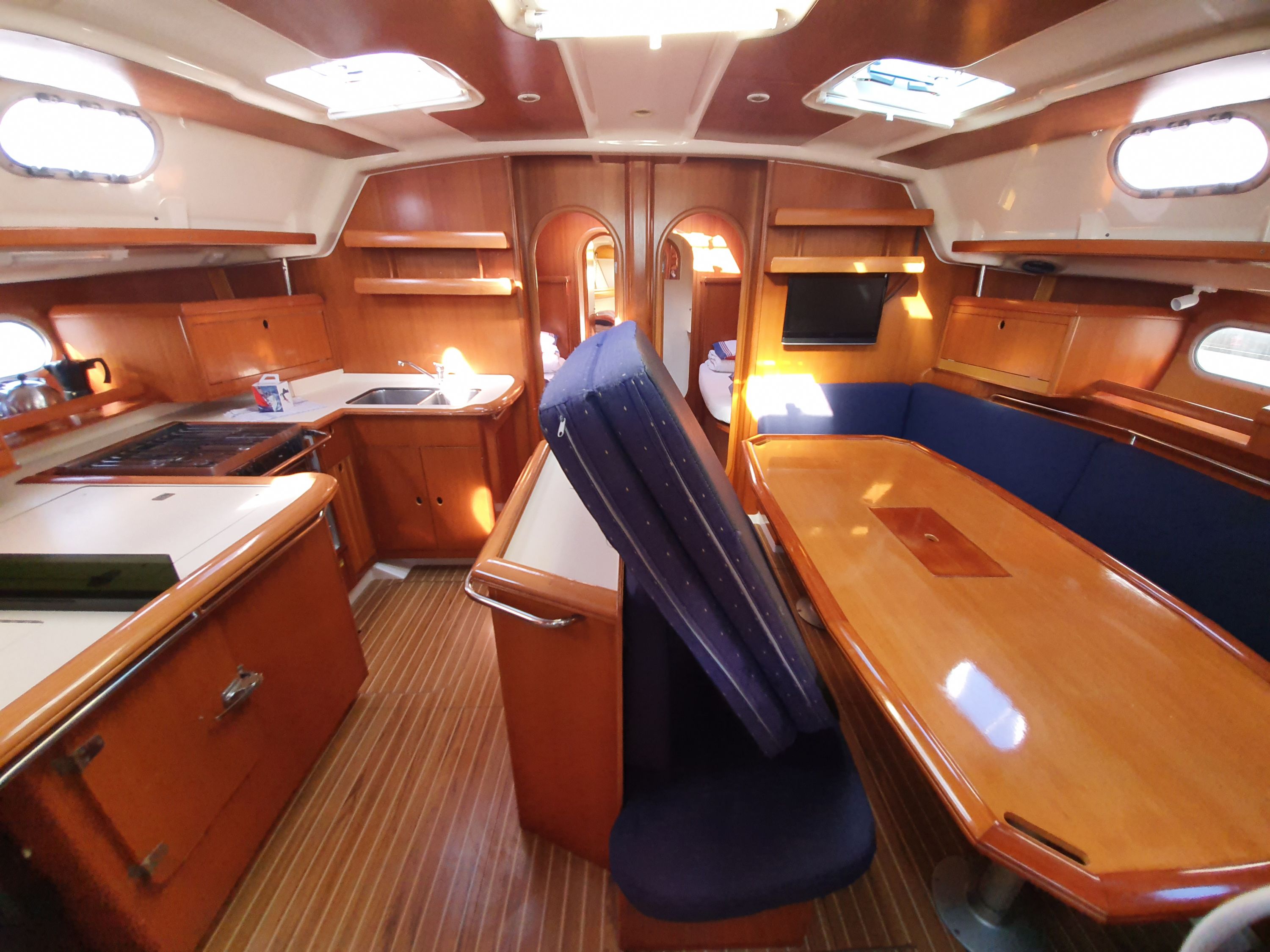| Navigation | Fernglas, GPS mit Kartenplotter im Cockpit, GPS mit Kartenplotter im Salon, Hafenhandbücher, Kompass, Seekarten, Tridata (Log, Echolot, Windm.), Windmesser |