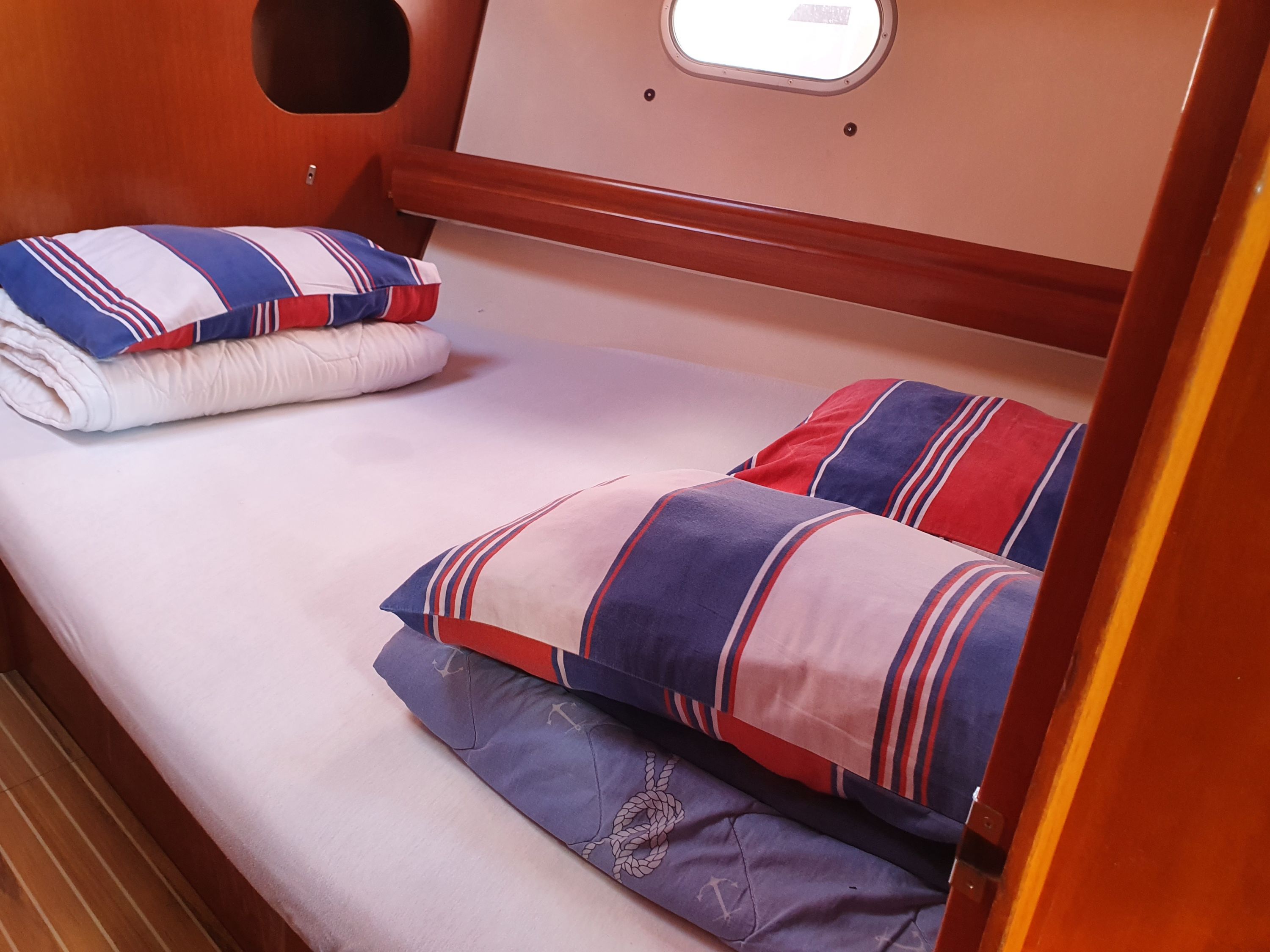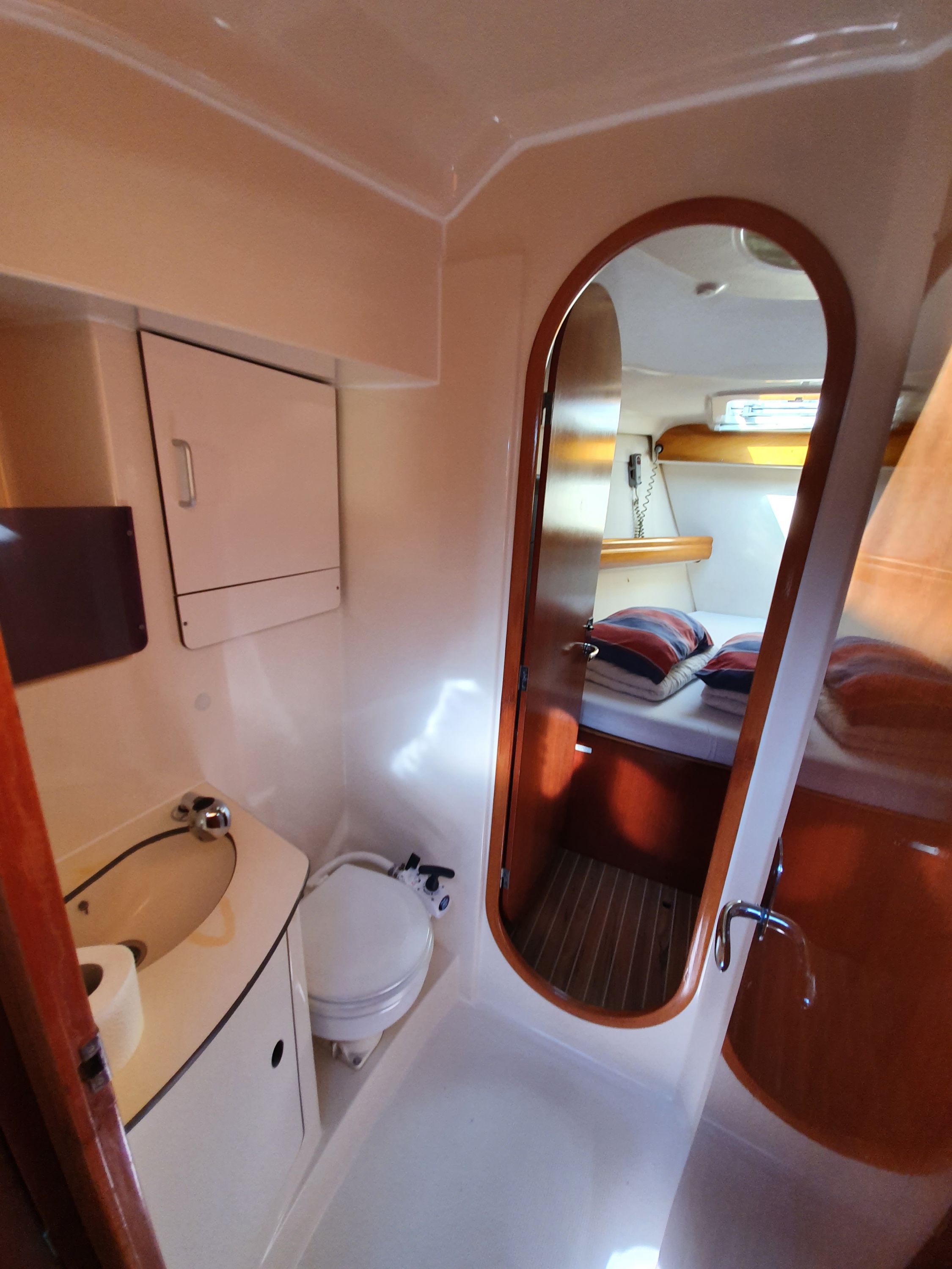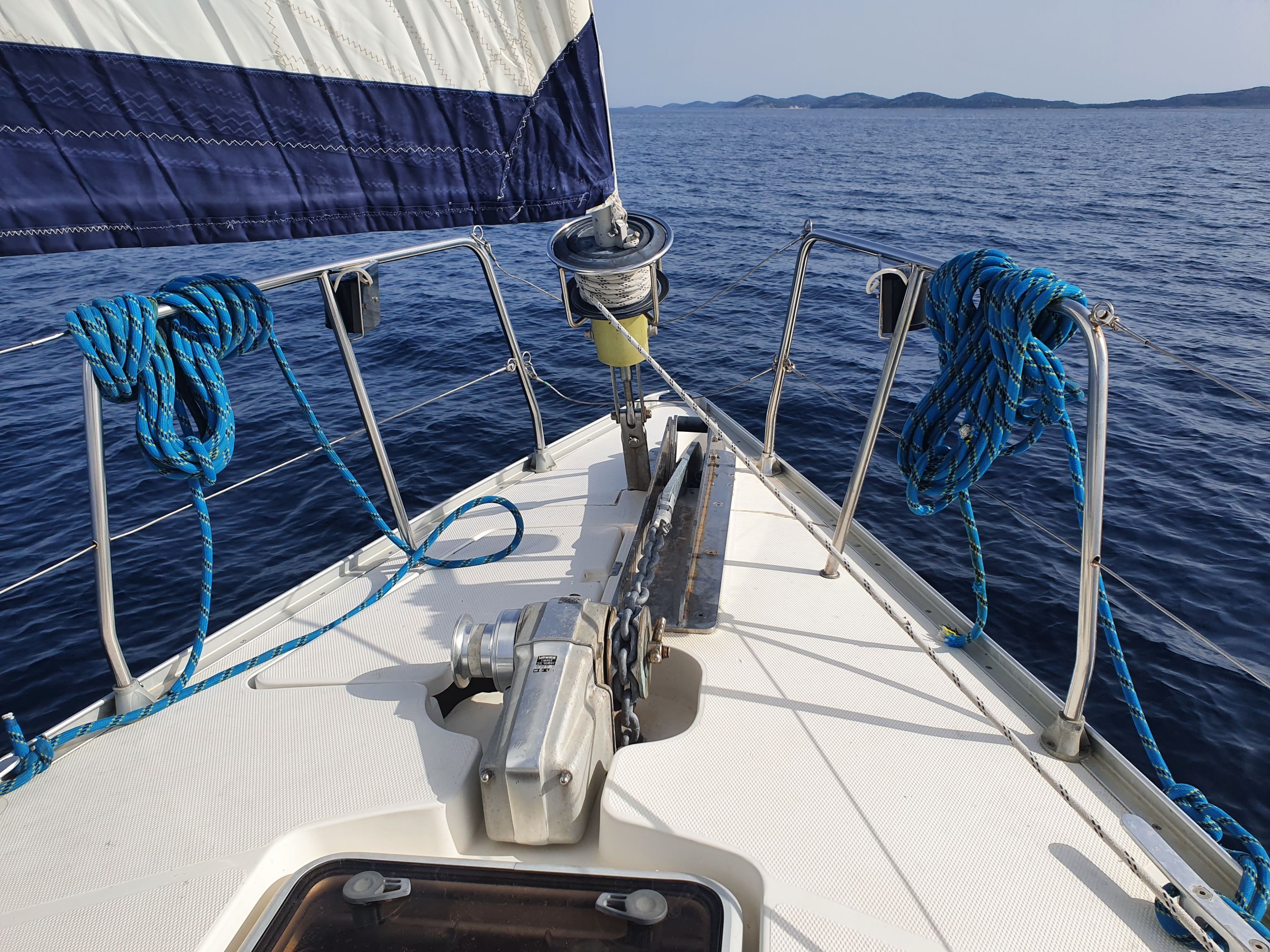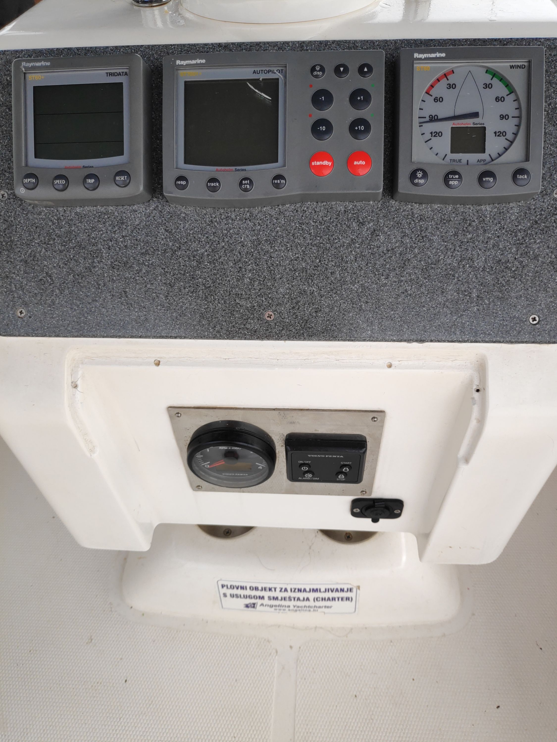 | Navigation | Fernglas, GPS mit Kartenplotter im Cockpit, GPS mit Kartenplotter im Salon, Hafenhandbücher, Kompass, Seekarten, Tridata (Log, Echolot, Windm.), Windmesser |