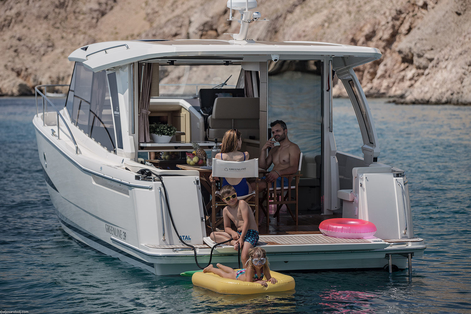 | Outside | Badeplattform elektr., Cockpitdusche, Cockpitlautsprecher, Cockpitpolster, Cockpittisch, elektr. Ankerwinsch, Solaranlage |