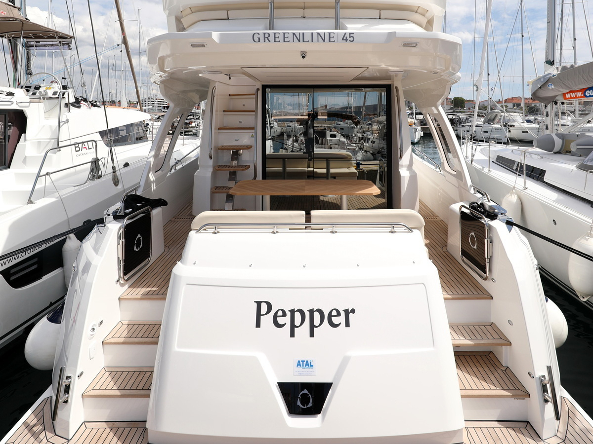 | Outside | 220 V-Landanschluss, Anker mit Kette, Badeplattform, Biminitop, Cockpitlautsprecher, Cockpitpolster, Cockpittisch, Deckpolster, Fender, Festmacherleinen, Flybridge, Grill, Solaranlage, Sonnendeck, Teak auf Badeplattform, Teak im Cockpit, Treibanker, Unterwasserbeleuchtung |