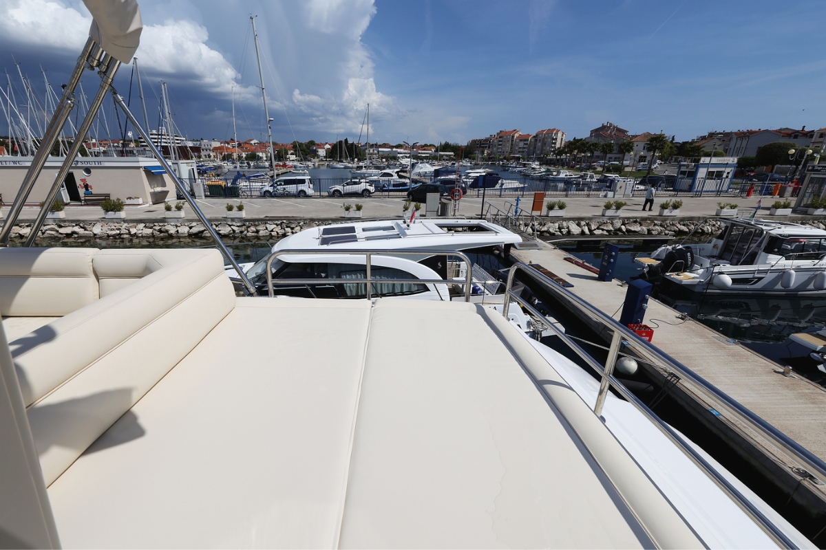 | Outside | Biminitop auf Flybridge, Cockpitpolster, Deckbeleuchtung, elektr. Ankerwinsch, Grill und Kühlschrank auf Flybridge, HiFi Lautsprecher auf Flybridge, Polster auf Flybridge, Solaranlage, Sonnendeck, Spülbecken auf Flybridge, Teak auf Badeplattform, Teak im Cockpit |