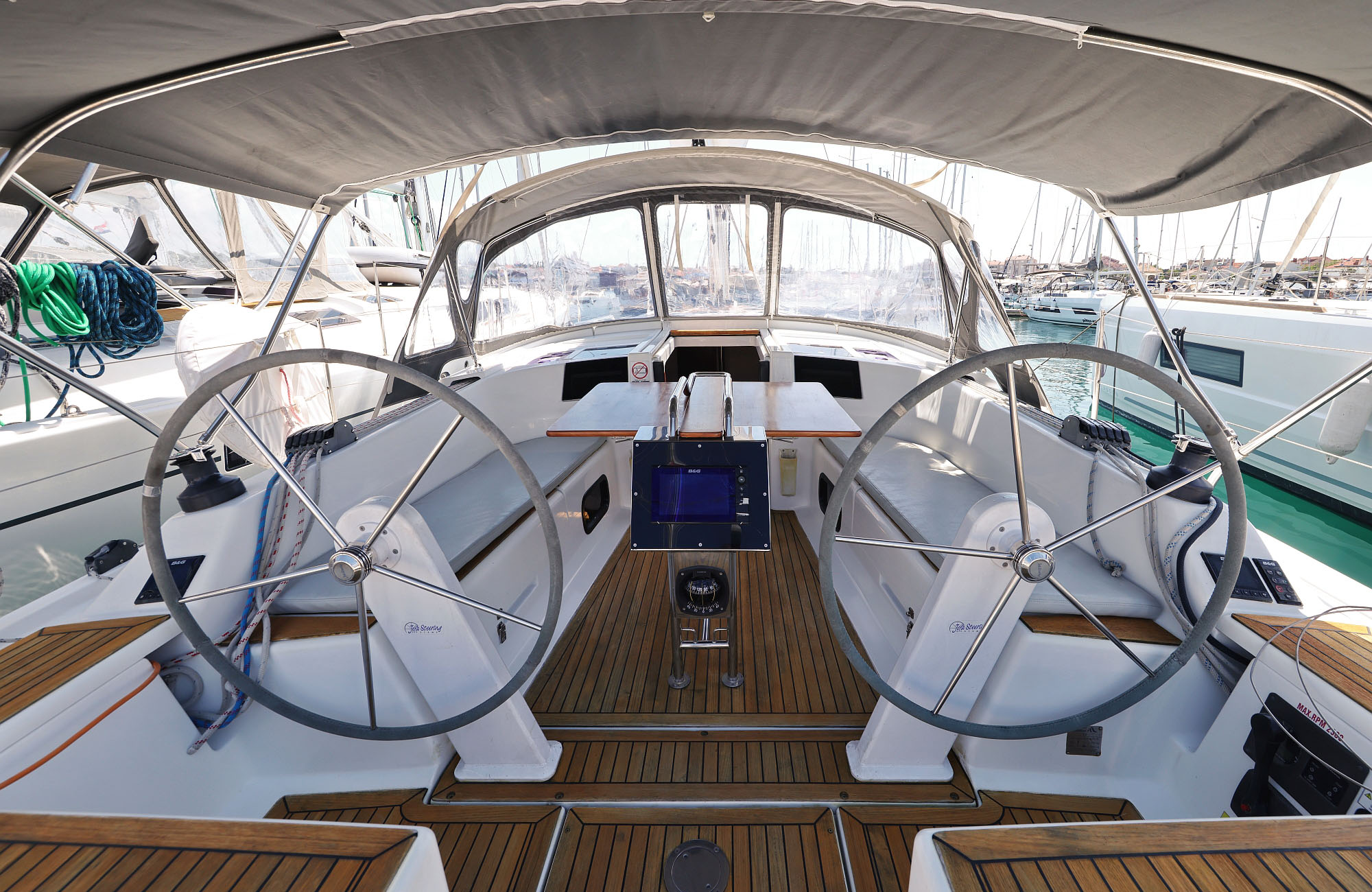 | Outside | Badeplattform, Biminitop, Cockpitdusche, Cockpitlautsprecher, Cockpittisch, elektr. Ankerwinsch, Sprayhood, Teak im Cockpit |