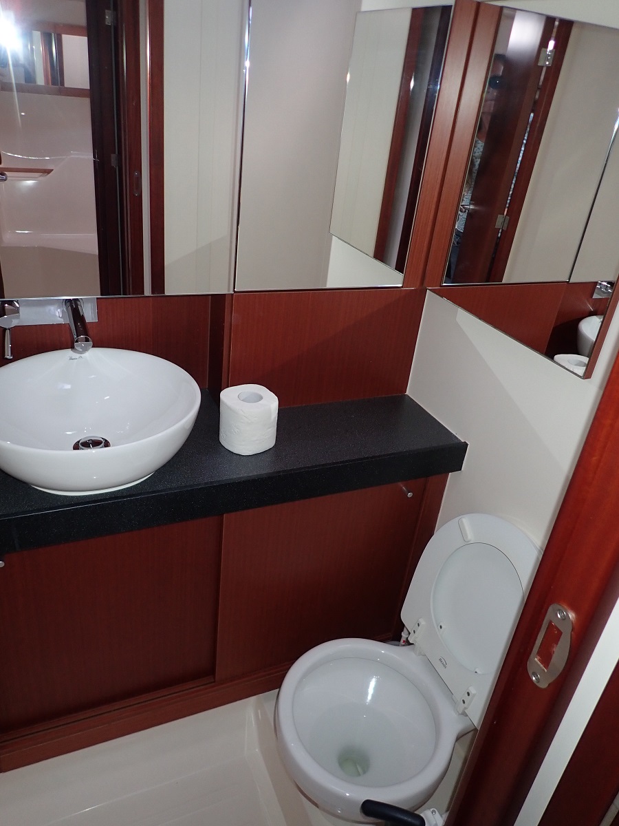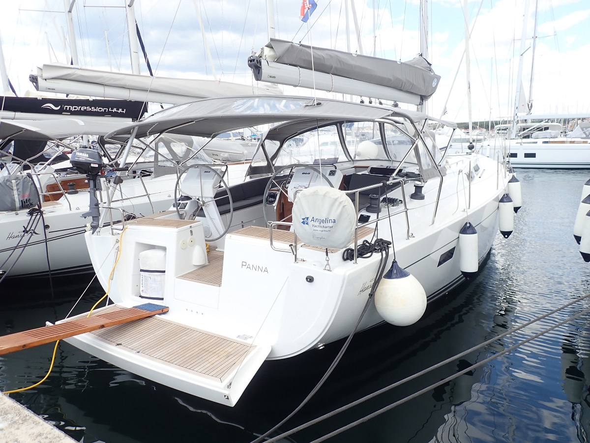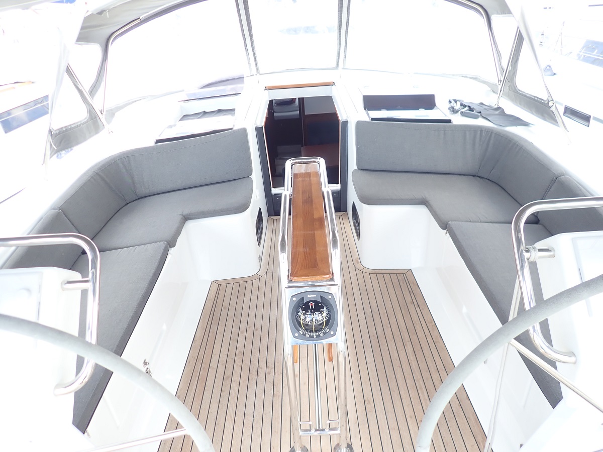 | Outside | 220 V-Landanschluss, Anker mit Kette, Badeplattform, Biminitop, Bootshaken, Cockpitdusche, Cockpitlautsprecher, Cockpitpolster, Cockpittisch, Delta-Anker, elektr. Ankerwinsch, Fender, Festmacherleinen, Gangway, Sprayhood, Teak im Cockpit, Wasserschlauch, Winschen |