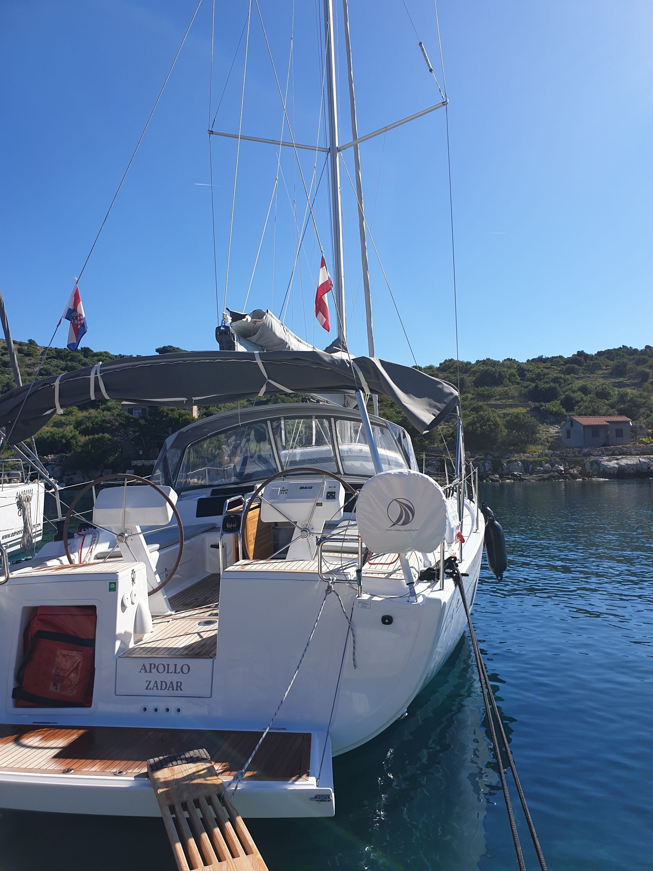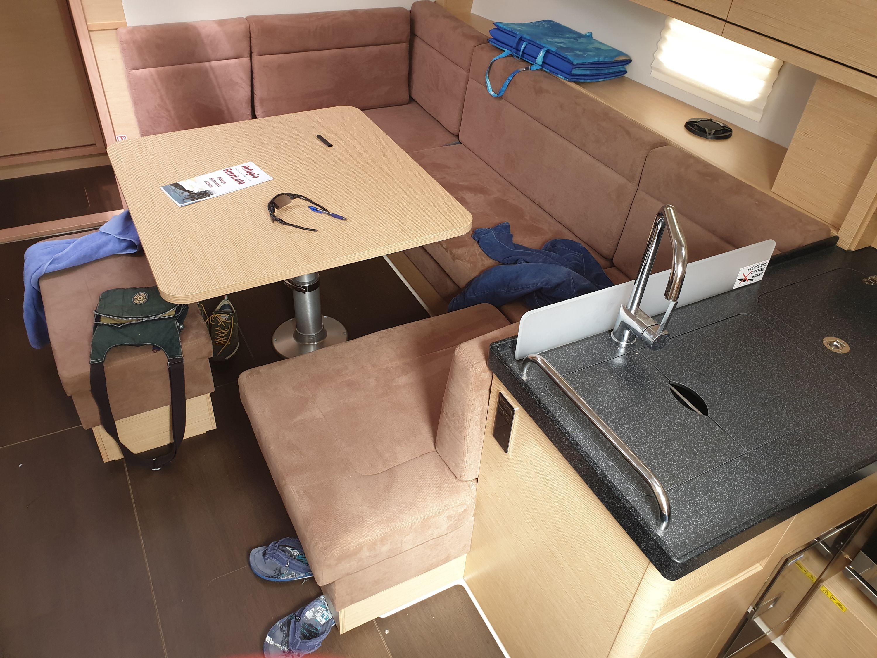 | Outside | Badeplattform, Biminitop, Cockpitdusche, Cockpitlautsprecher, Cockpittisch, elektr. Ankerwinsch, Sprayhood, Teak im Cockpit |