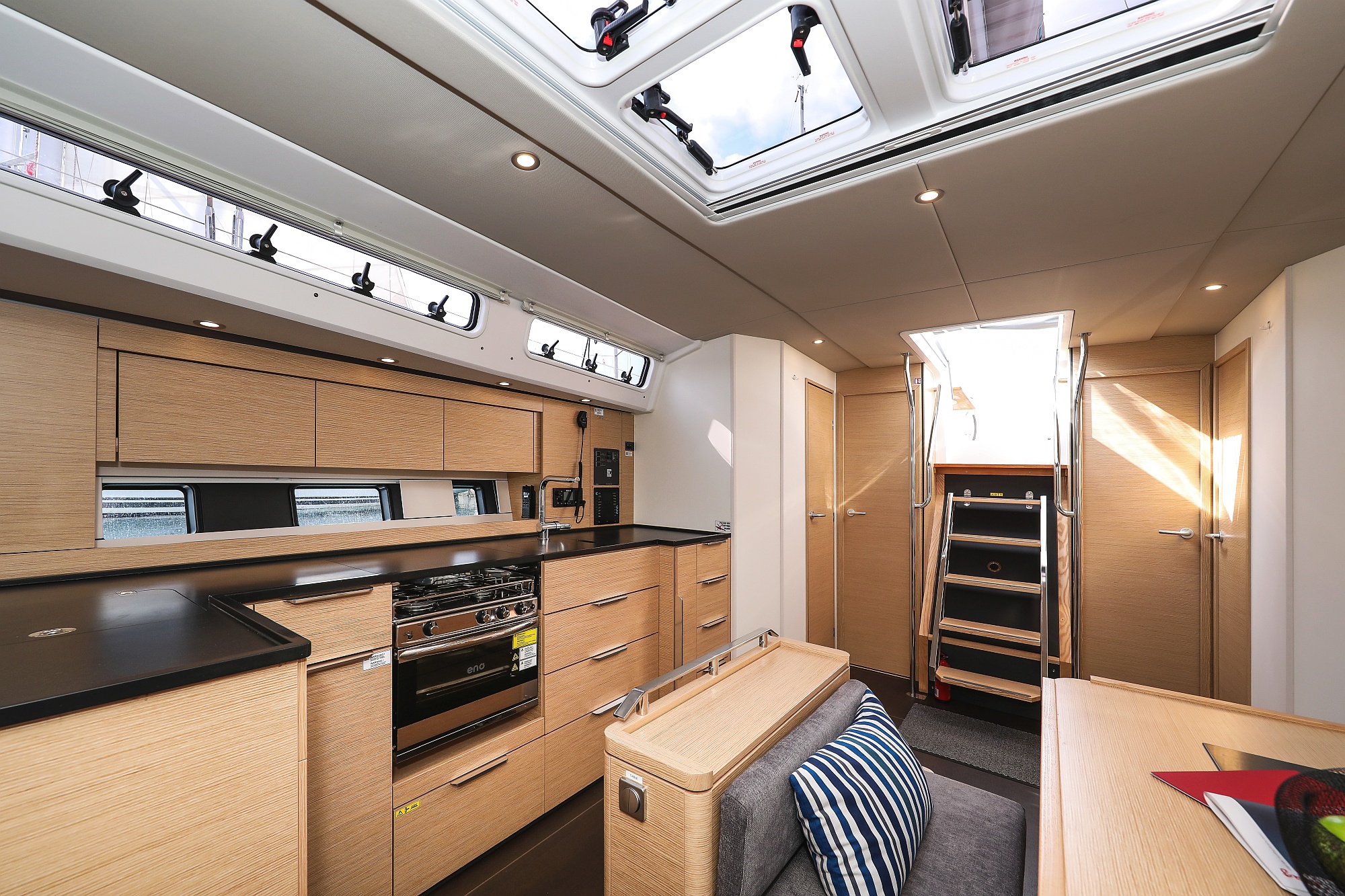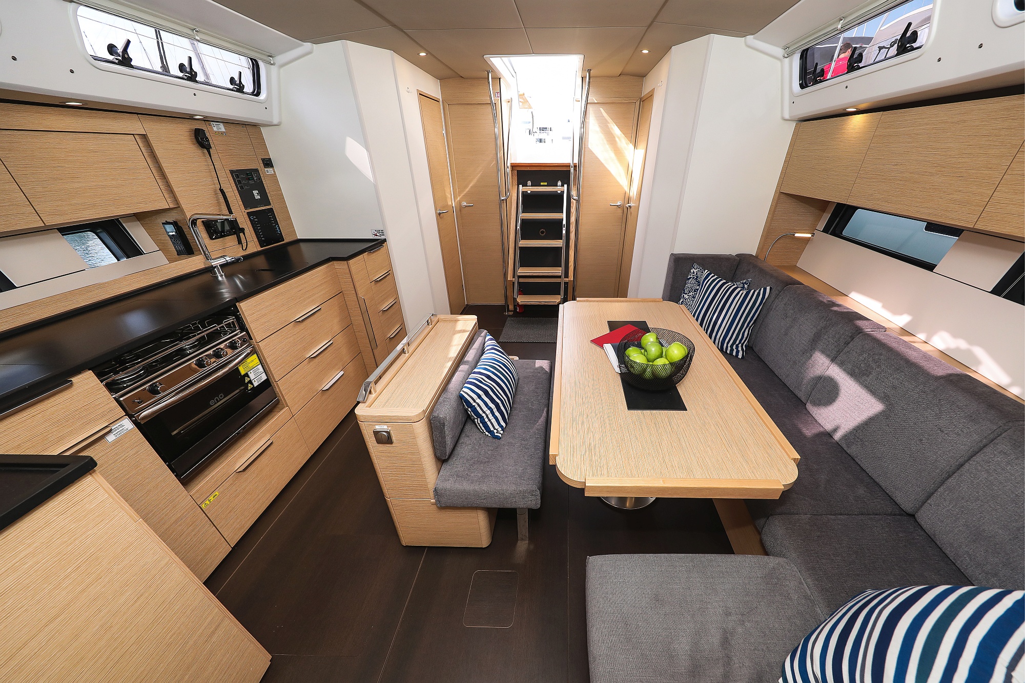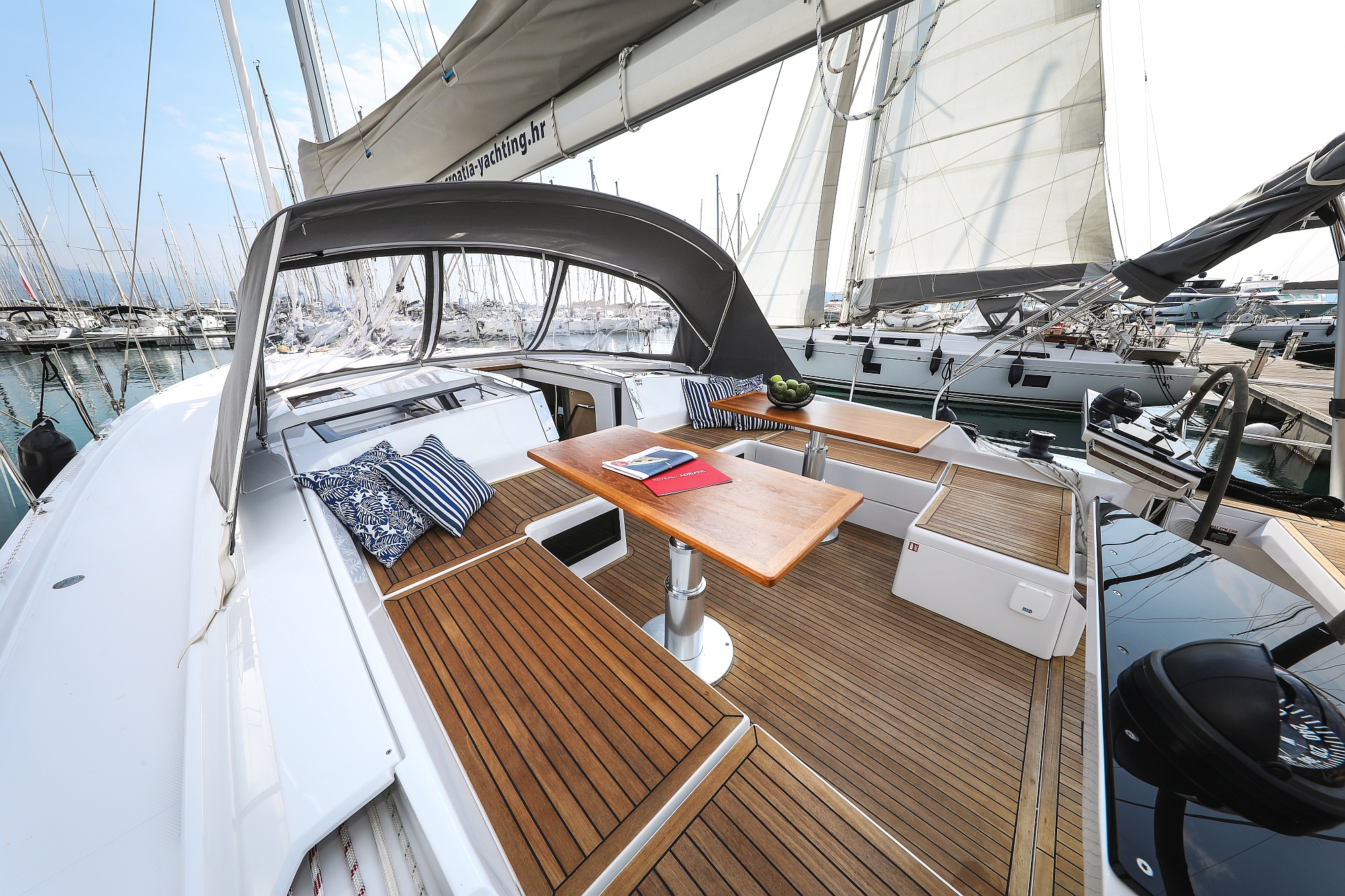 | Outside | Badeplattform, Biminitop, Cockpitdusche, Cockpitlautsprecher, Cockpitpolster, Cockpittisch absenkbar, elektr. Ankerwinsch, Solaranlage, Sprayhood, Teak im Cockpit |