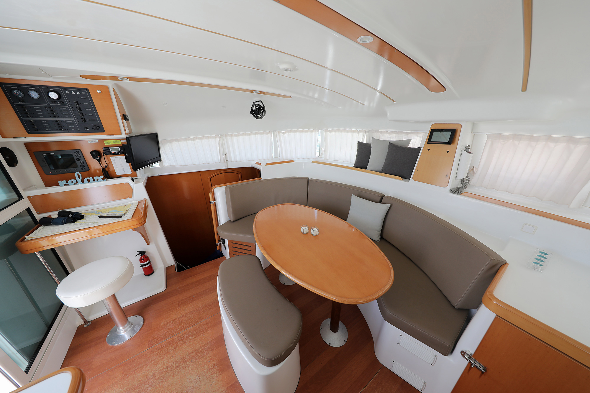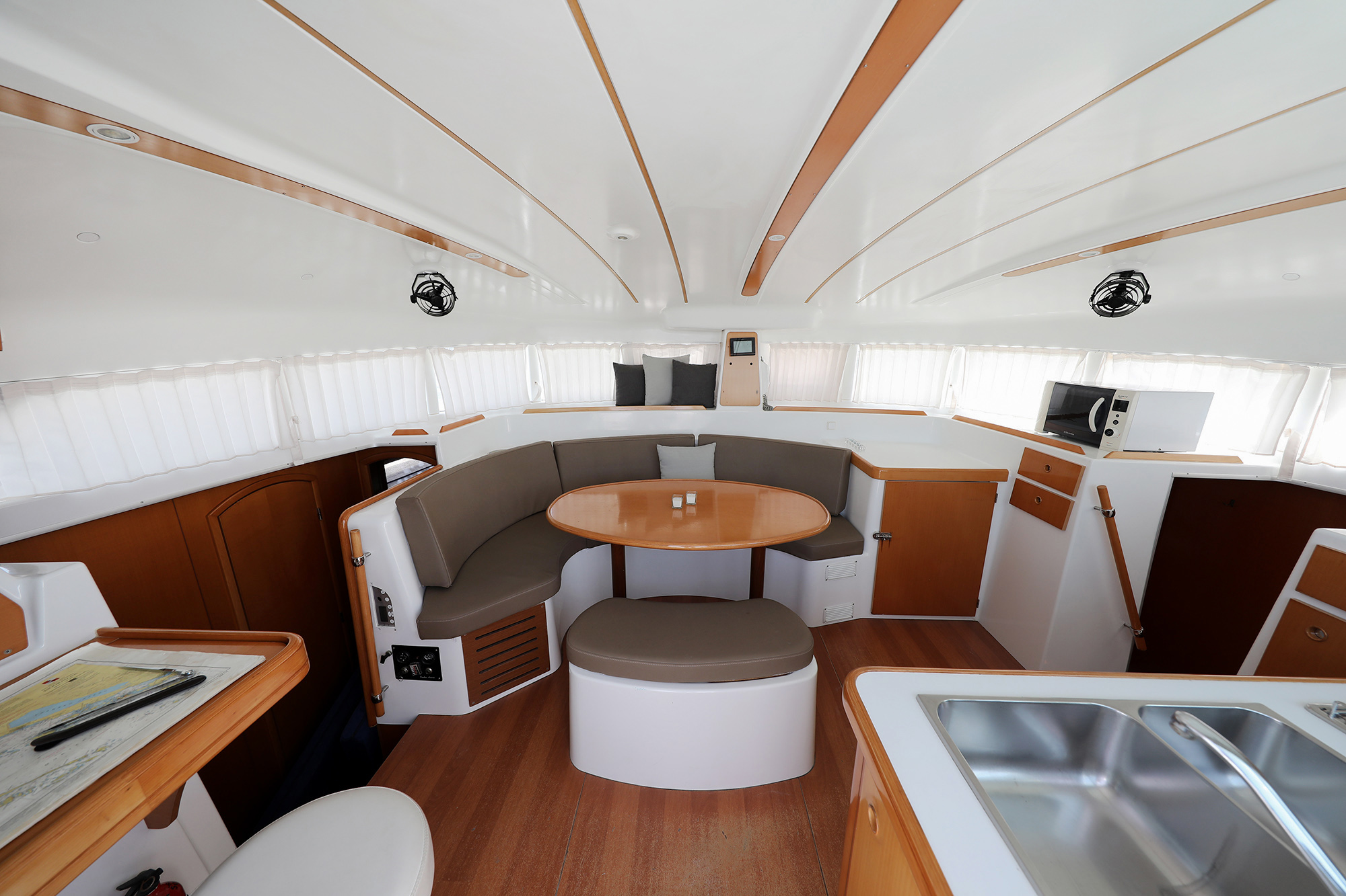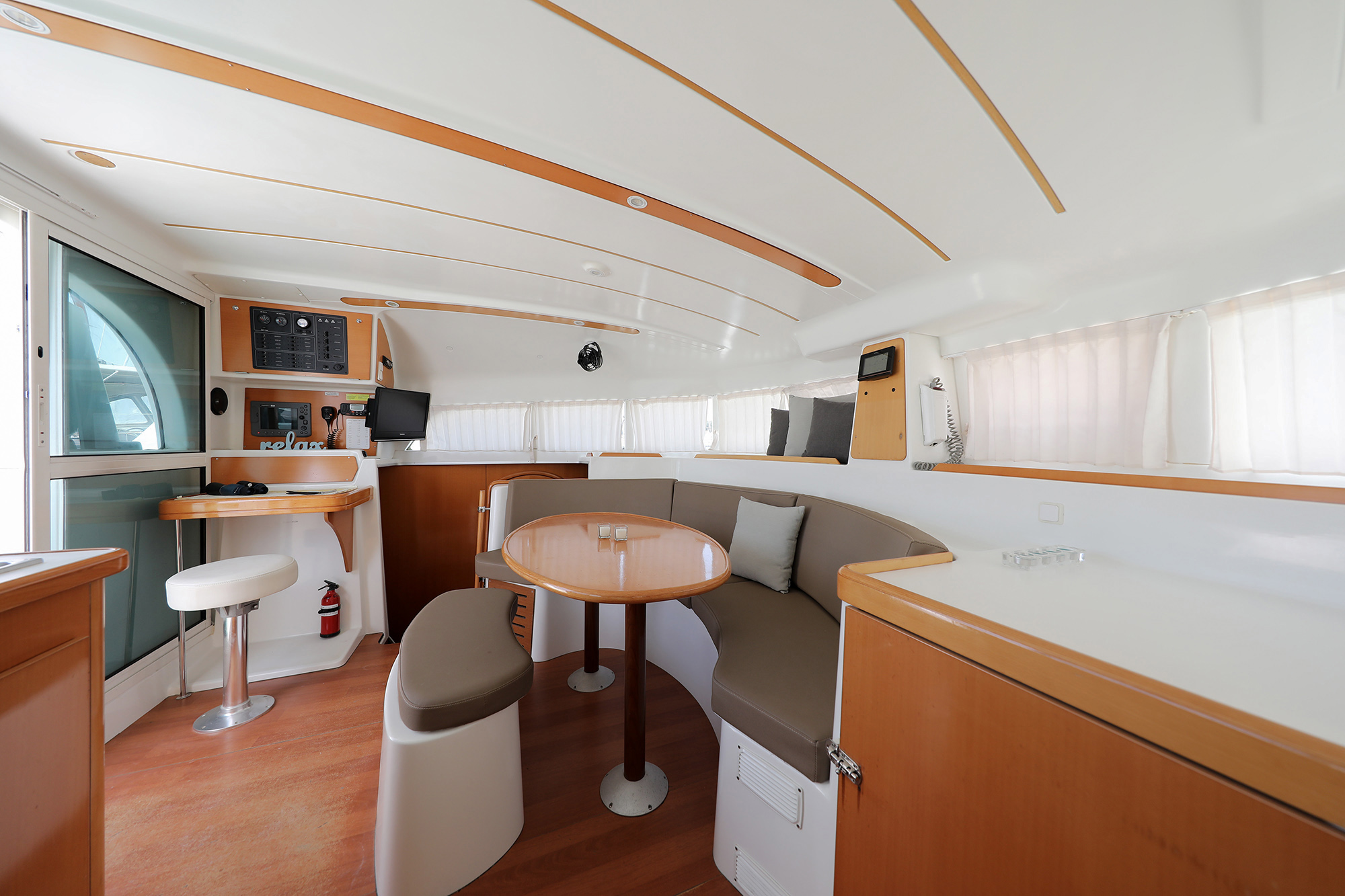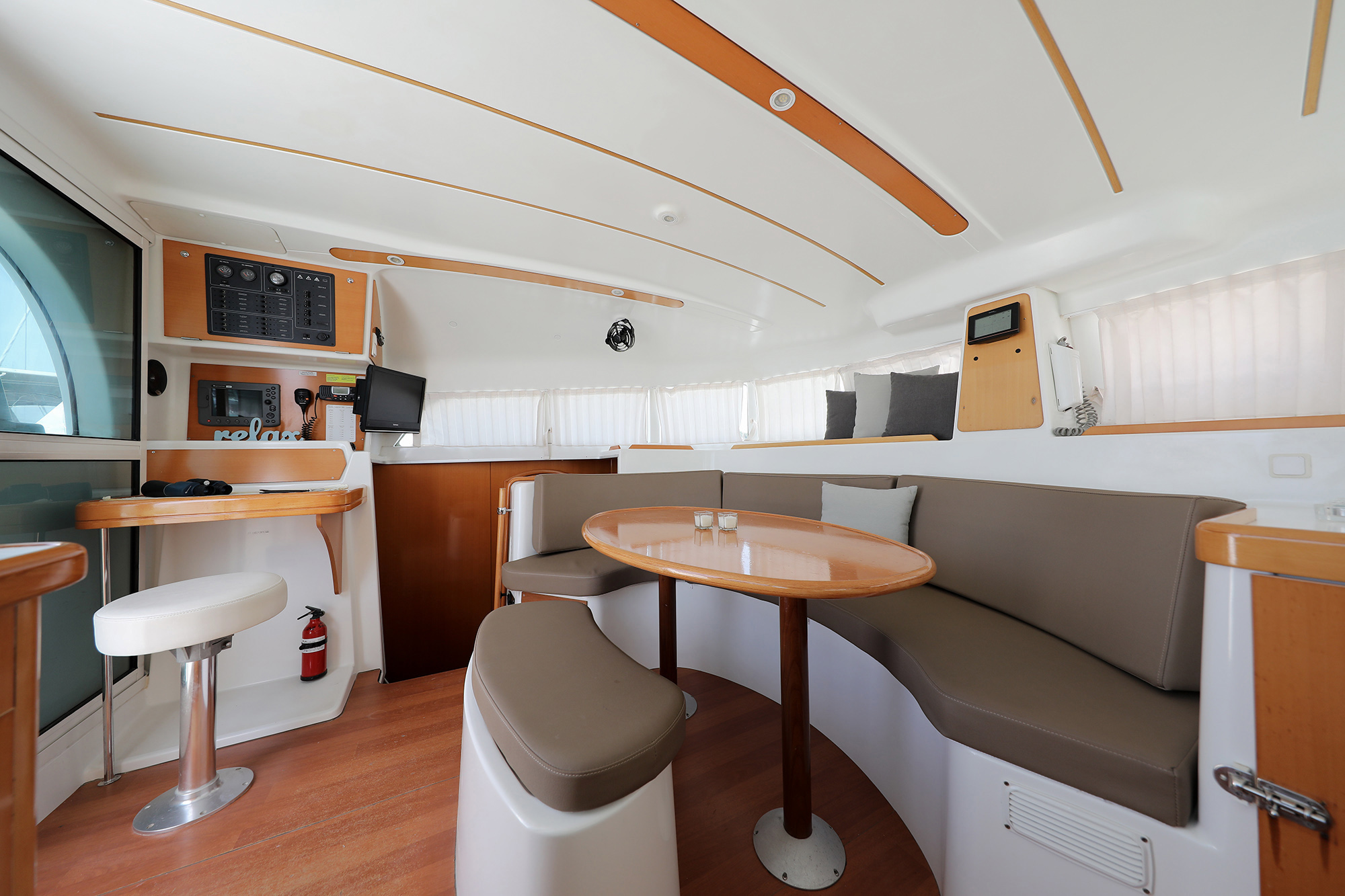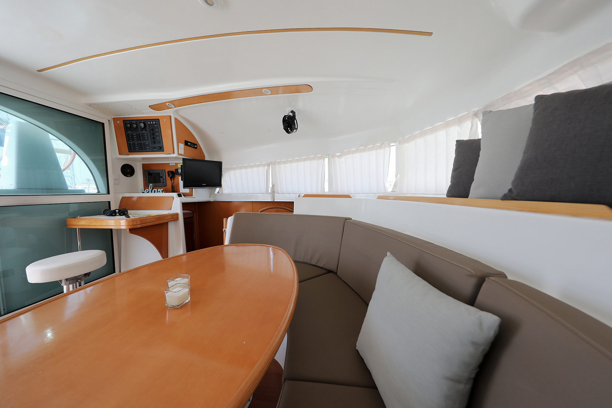 | Outside | 220 V-Landanschluss, Biminitop, Bootshaken, Cockpitdusche, Cockpitlautsprecher, Cockpitpolster, Cockpittisch, Cockpittisch mit Eisbox, Delta-Anker, elektr. Ankerwinsch, Faltsteuerrad, Fender, Festmacherleinen, Gangway, Wasserschlauch, Winschen |