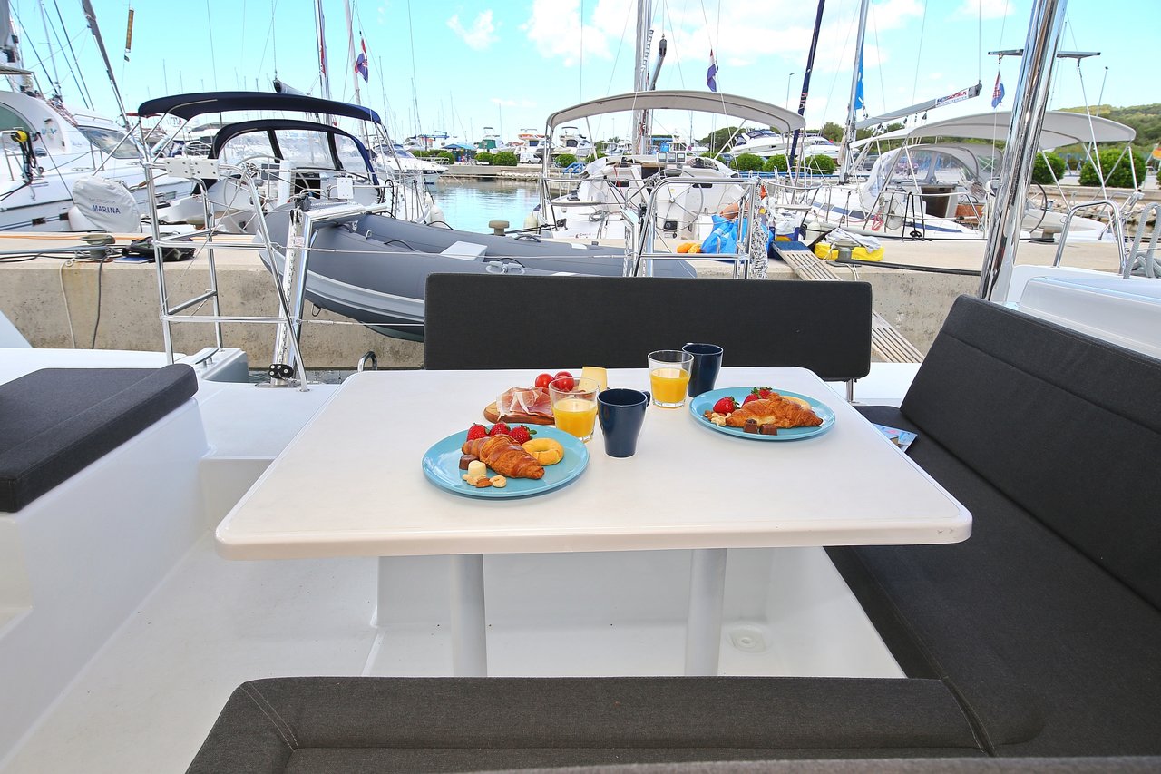 | Outside | Biminitop, Bootshaken, Cockpitdusche warm/kalt, Cockpitlautsprecher, Cockpitpolster, Cockpittisch, Delta-Anker, elektr. Ankerwinsch, Fender, Festmacherleinen, Gangway, Wasserschlauch, Winschen |