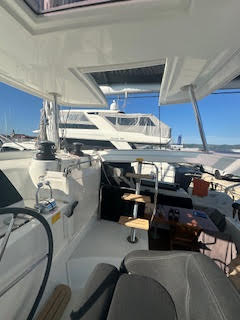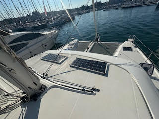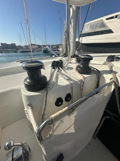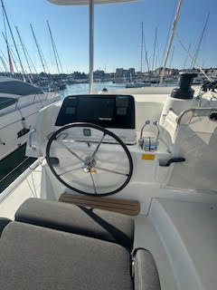 | Outside | 12 V-Anschluss, 220 V-Landanschluss, Anker mit Kette, Badeleiter, Badeplattform, Biminitop, Bootshaken, Cockpitdusche, Cockpitlautsprecher, Cockpitpolster, Cockpittisch, Deckbürste, Deckpolster, Dieselkanister , elektr. Ankerwinsch, elektr. Winsch, Fallwinschen, Fender, Festmacherleinen, Gangway, Lifeline System, Solaranlage, Sprayhood, Teak im Cockpit, Windex |