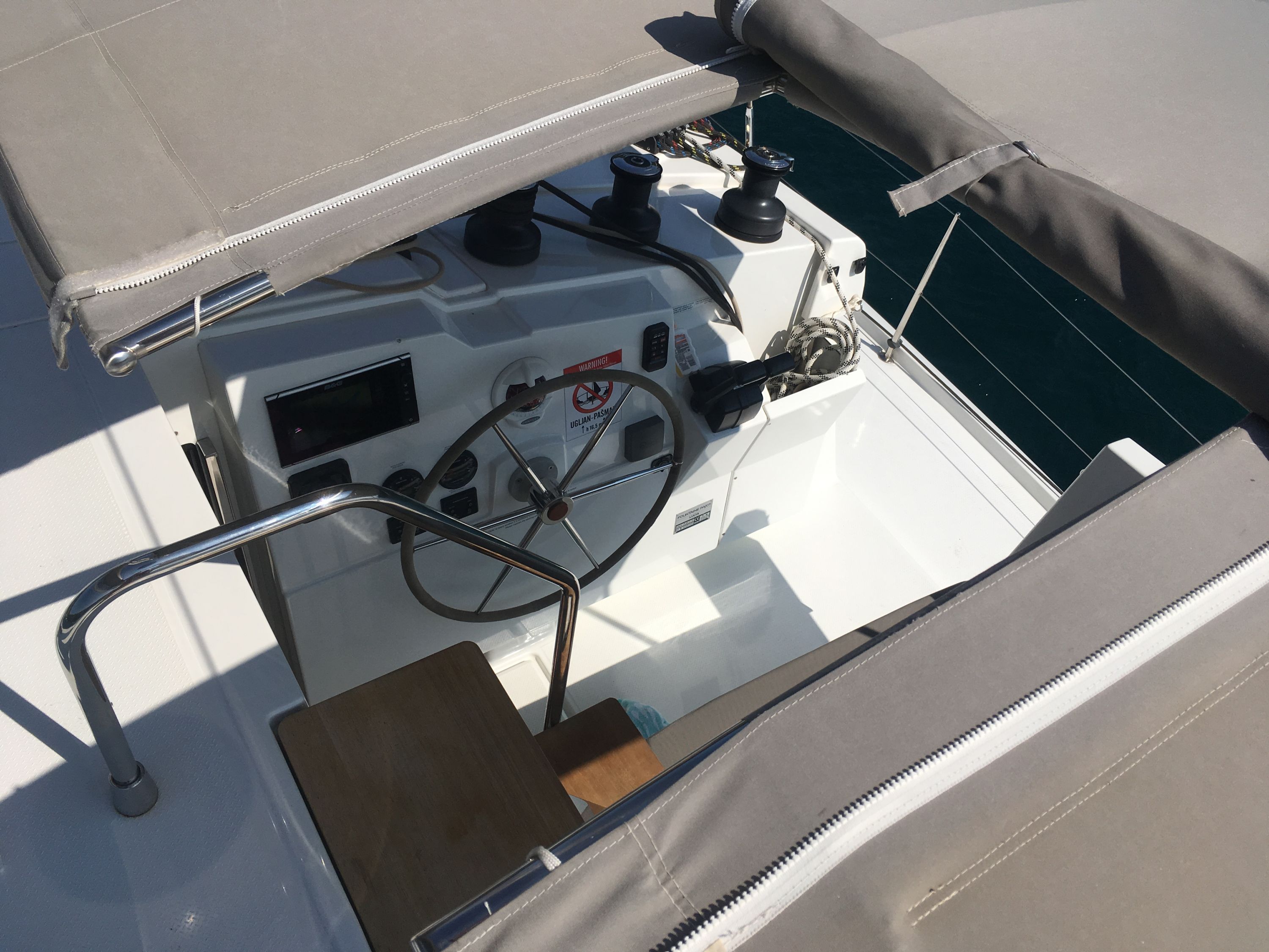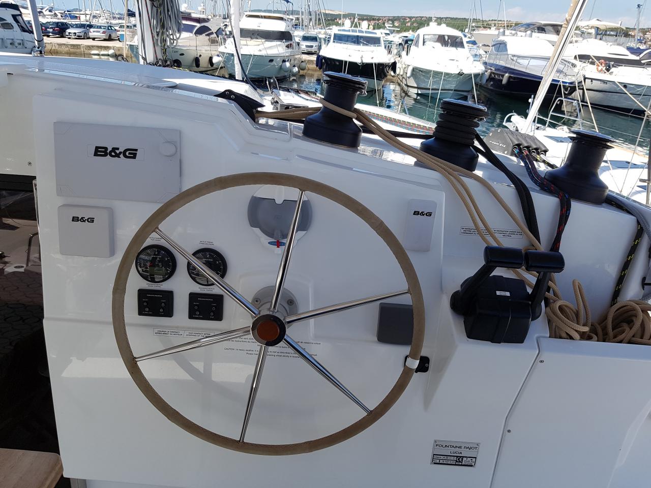 | Outside | 220 V-Landanschluss, Anker mit Kette, Bootshaken, Cockpitdusche, Cockpitkühlschrank, Cockpitlautsprecher, Cockpitpolster, Cockpittisch, elektr. Winsch, Fender, Festmacherleinen, Gangway, Hardtop, Kugelfender, Solaranlage, Wasserschlauch, Winschen |