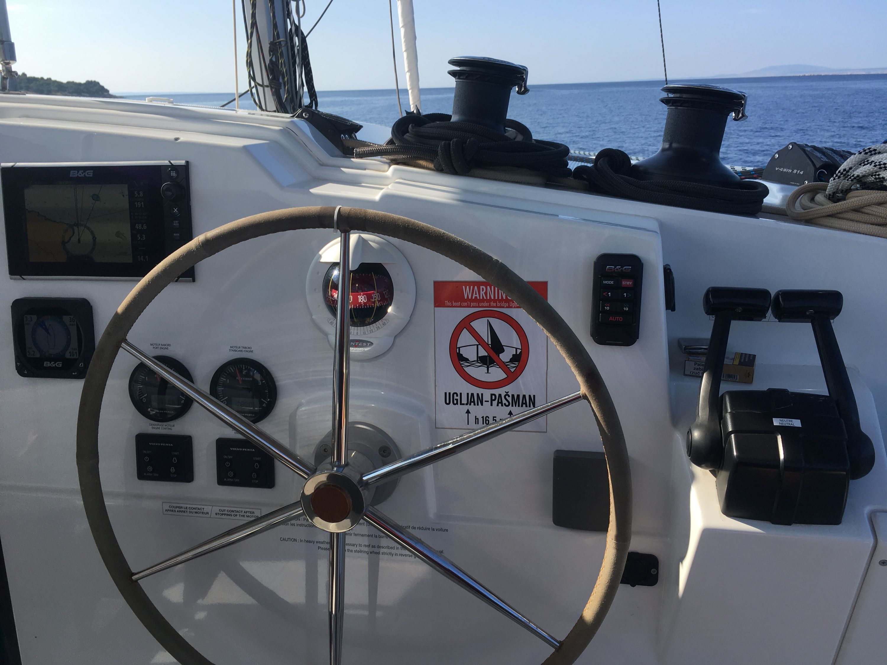 | Navigation | Barometer, GPS mit Kartenplotter im Cockpit, Handpeilkompass, Kompass, Navigationsbesteck, Radar, Seekarten, Tridata (Log, Echolot, Windm.), Windmesser |