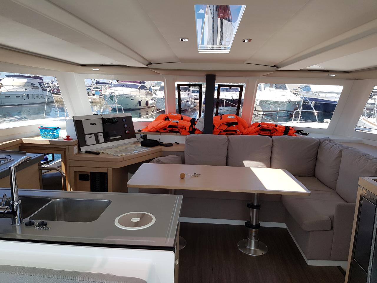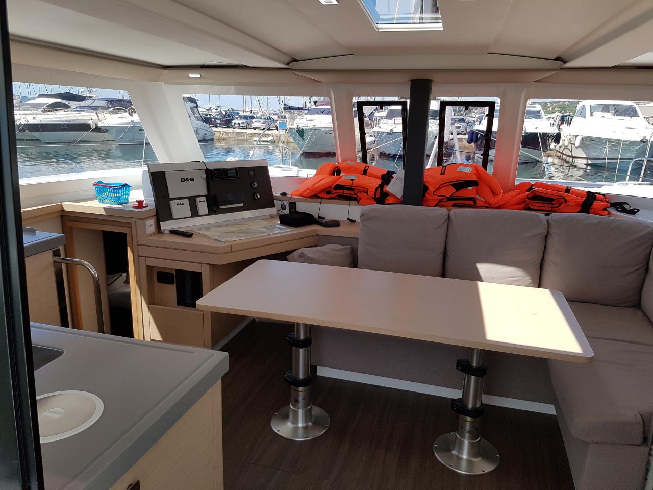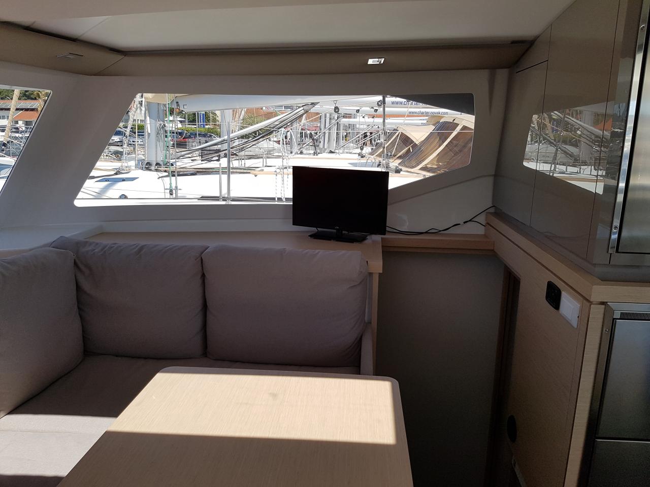 | Inside | Borduhr, Eiswürfelmaschine, Heizung, Inverter 12V/220V, Klimaanlage (Landstrom), Kühlschrank, Ladegerät, Radio, Salontisch absenkbar, TV + DVD, Watermaker |