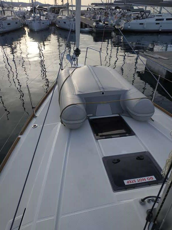 | Outside | 220 V-Landanschluss, Anker mit Kette, Ankerwinsch, Biminitop, Bootshaken, Cockpitdusche, Cockpitlautsprecher, Cockpitpolster, Cockpittisch, Dieselkanister , elektr. Ankerwinsch, Fender, Festmacherleinen, Gangway, Kugelfender, Kunststoff-Eimer (Pütz), Solaranlage, Sprayhood, Teak im Cockpit, Wantenschneider, Wasserkanister , Wasserschlauch |