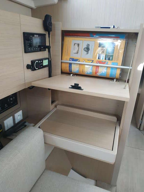 | Navigation | Barometer, Fernglas mit Peilkompass, GPS mit Kartenplotter im Cockpit, Hafenhandbücher, Navigationsbesteck, Seekarten, Tridata (Log, Echolot, Windm.) |