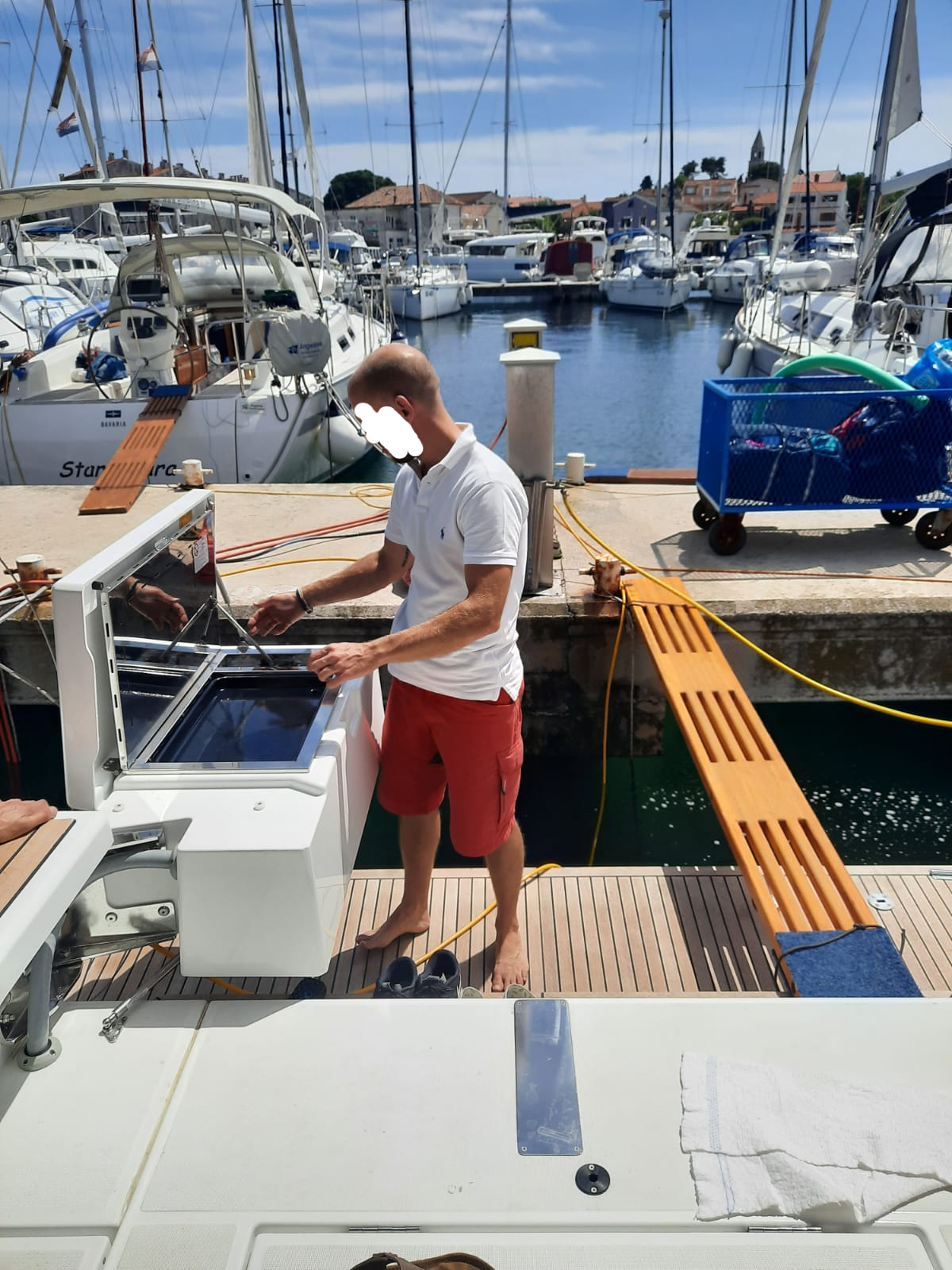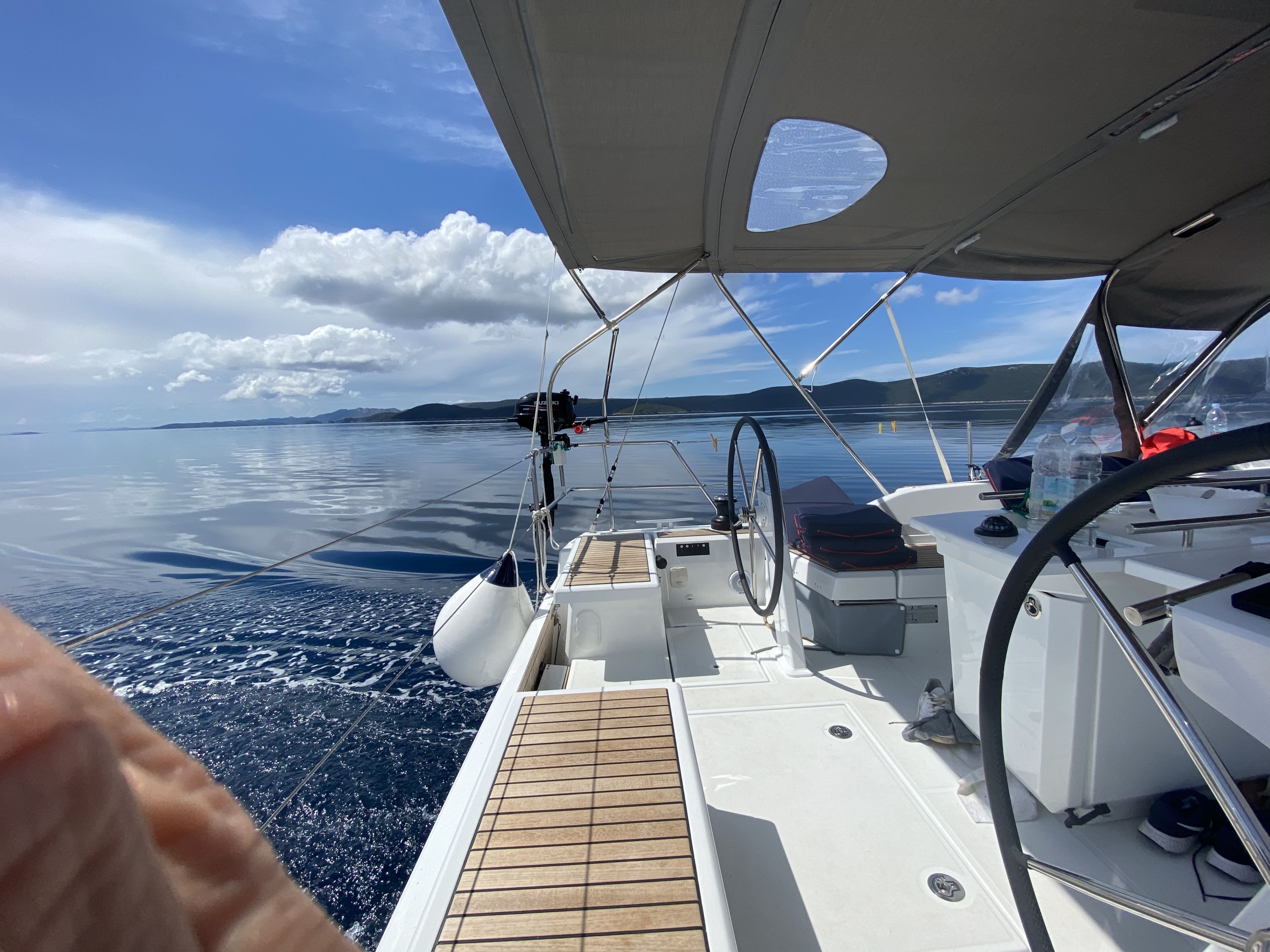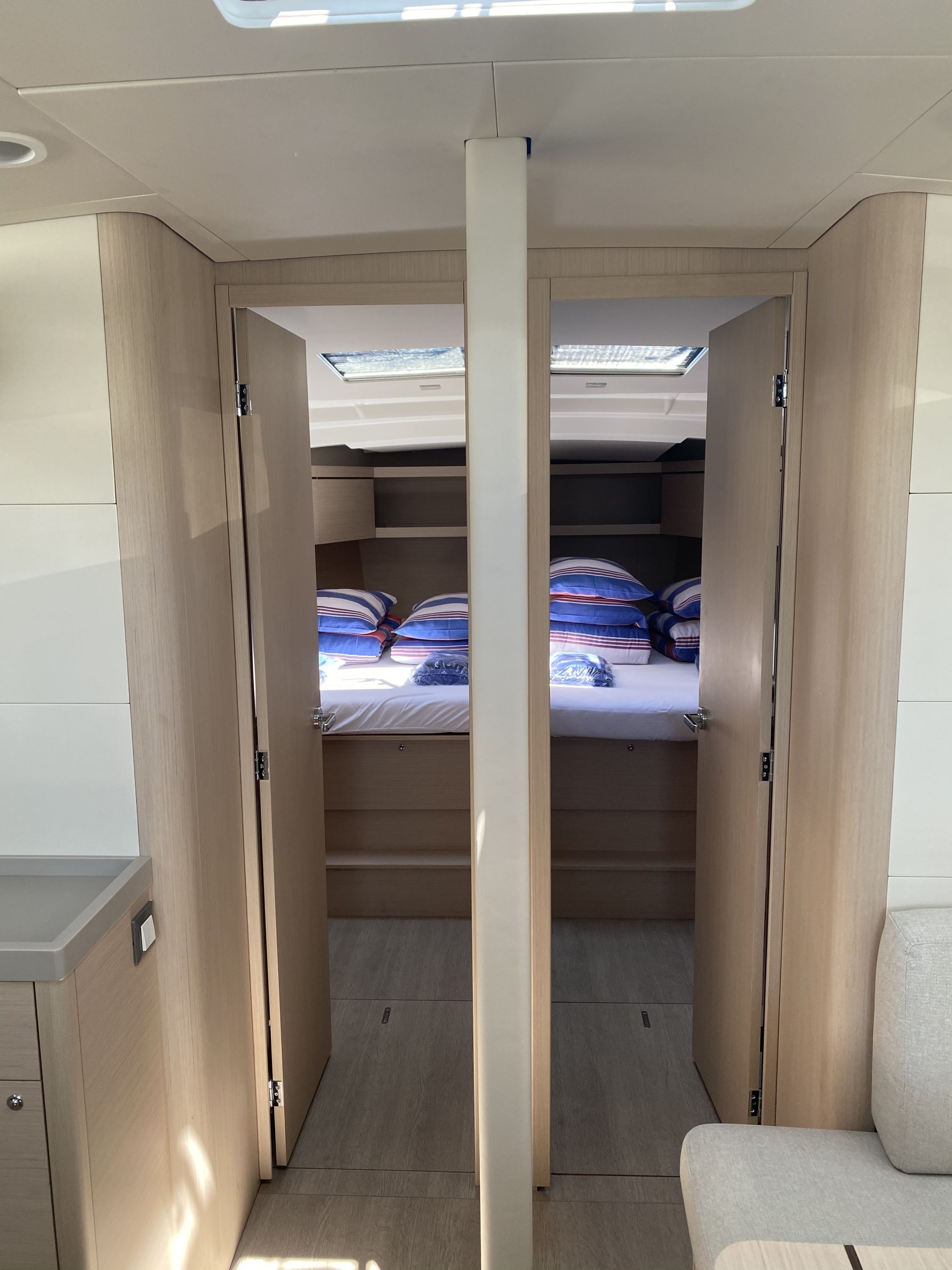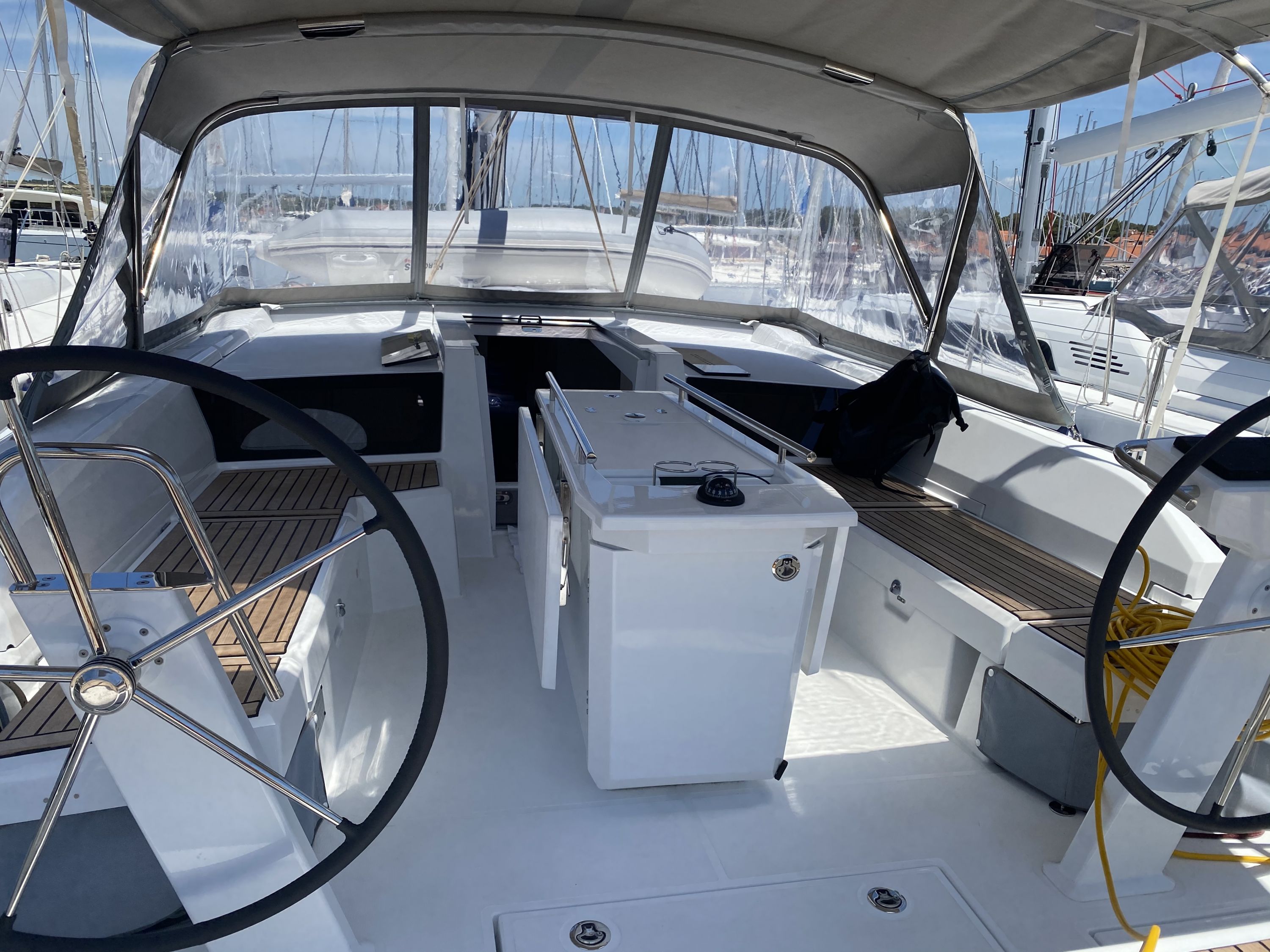 Outside 220 V-Landanschluss, Anker mit Kette, Badeplattform, Biminitop, Bootshaken, Cockpitdusche, Cockpitlautsprecher, Cockpitpolster, Cockpittisch, Delta-Anker, elektr. Ankerwinsch, Fender, Festmacherleinen, Gangway, Grill, Jambo Anker, Sprayhood, Teak im Cockpit, Winschen
