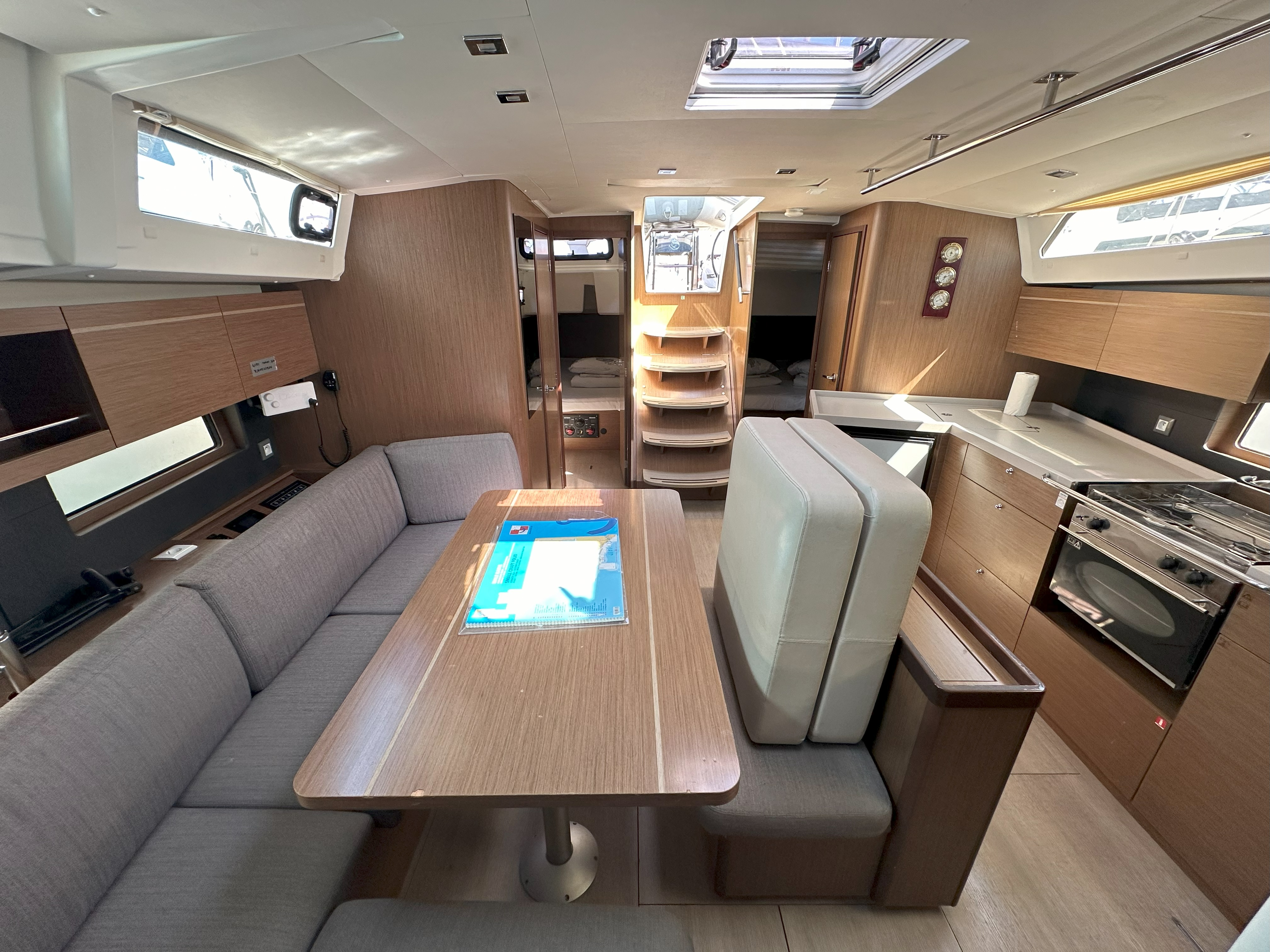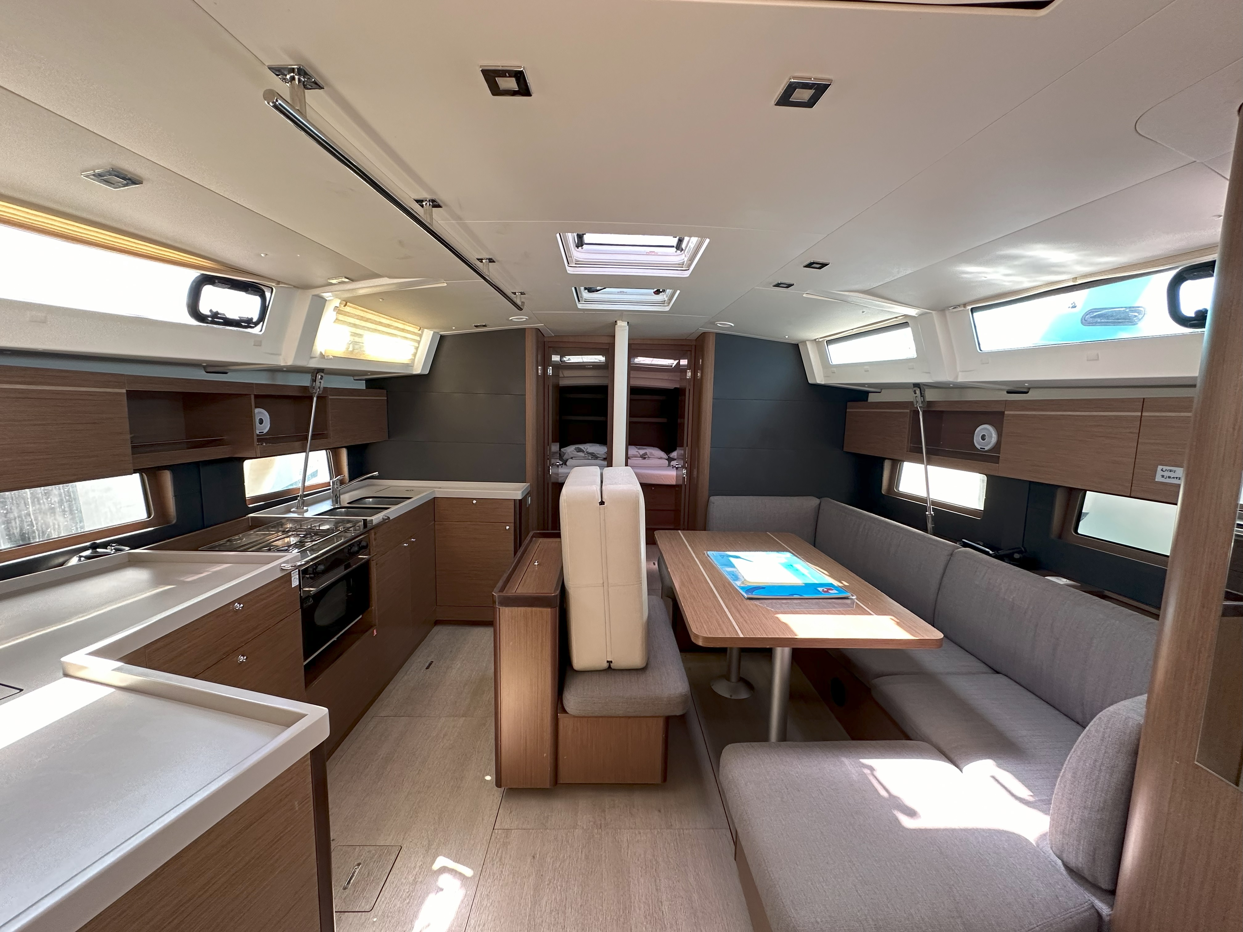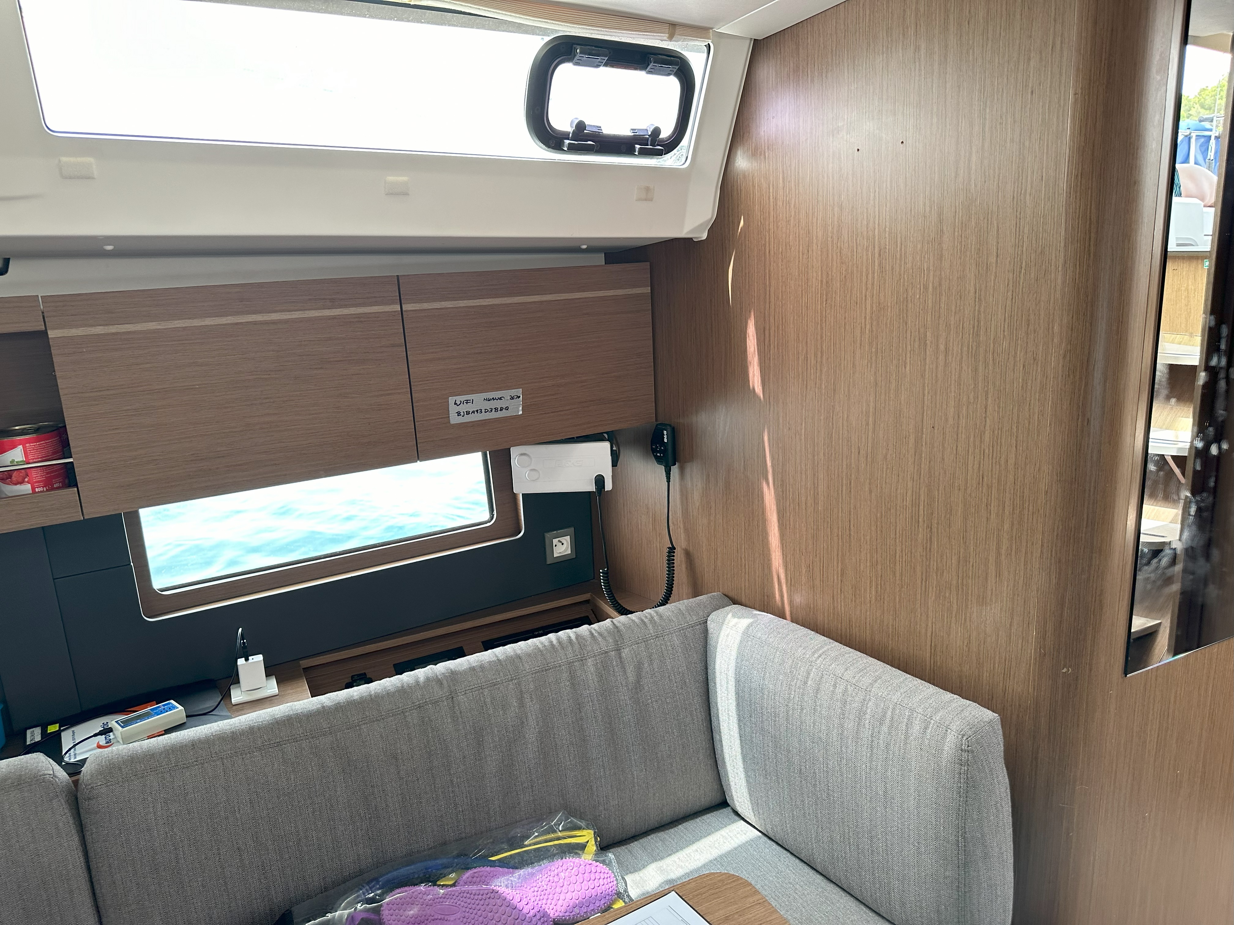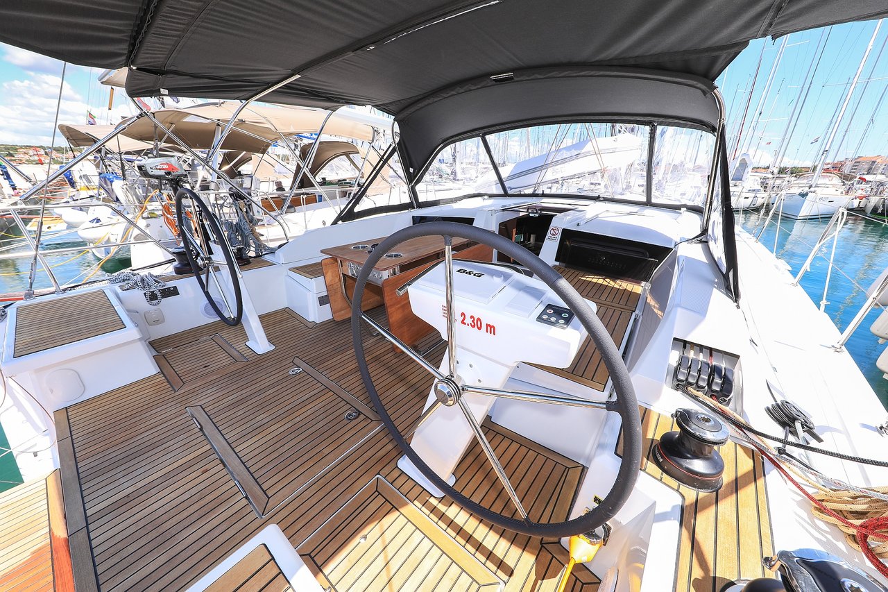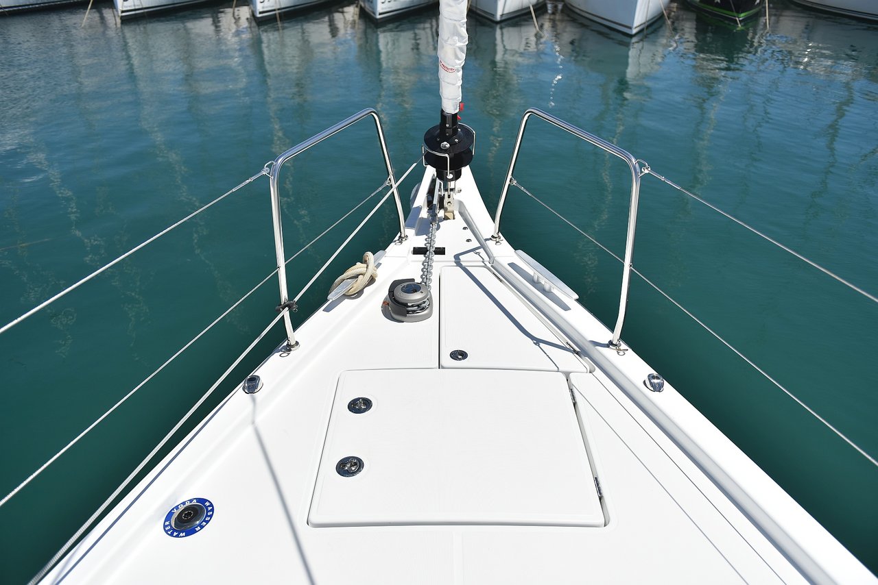 | Outside | 220 V-Landanschluss, Anker mit Kette, Badeplattform, Biminitop, Cockpitdusche, Cockpitlautsprecher, Cockpitpolster, Cockpittisch, elektr. Ankerwinsch, Faltpropeller, Fender, Festmacherleinen, Sprayhood, Teak im Cockpit, Treibanker, Wantenschneider, Windex, Winschen |