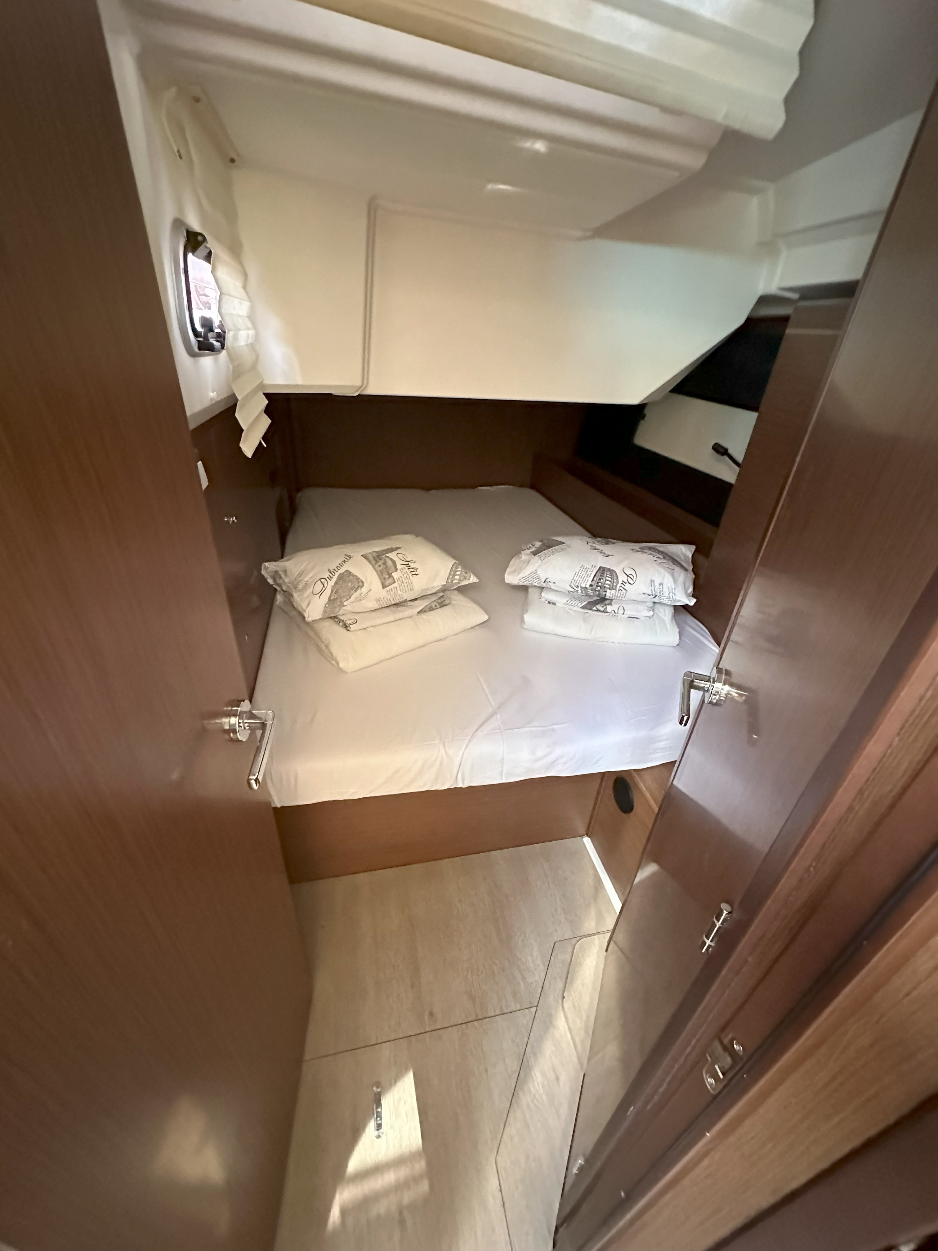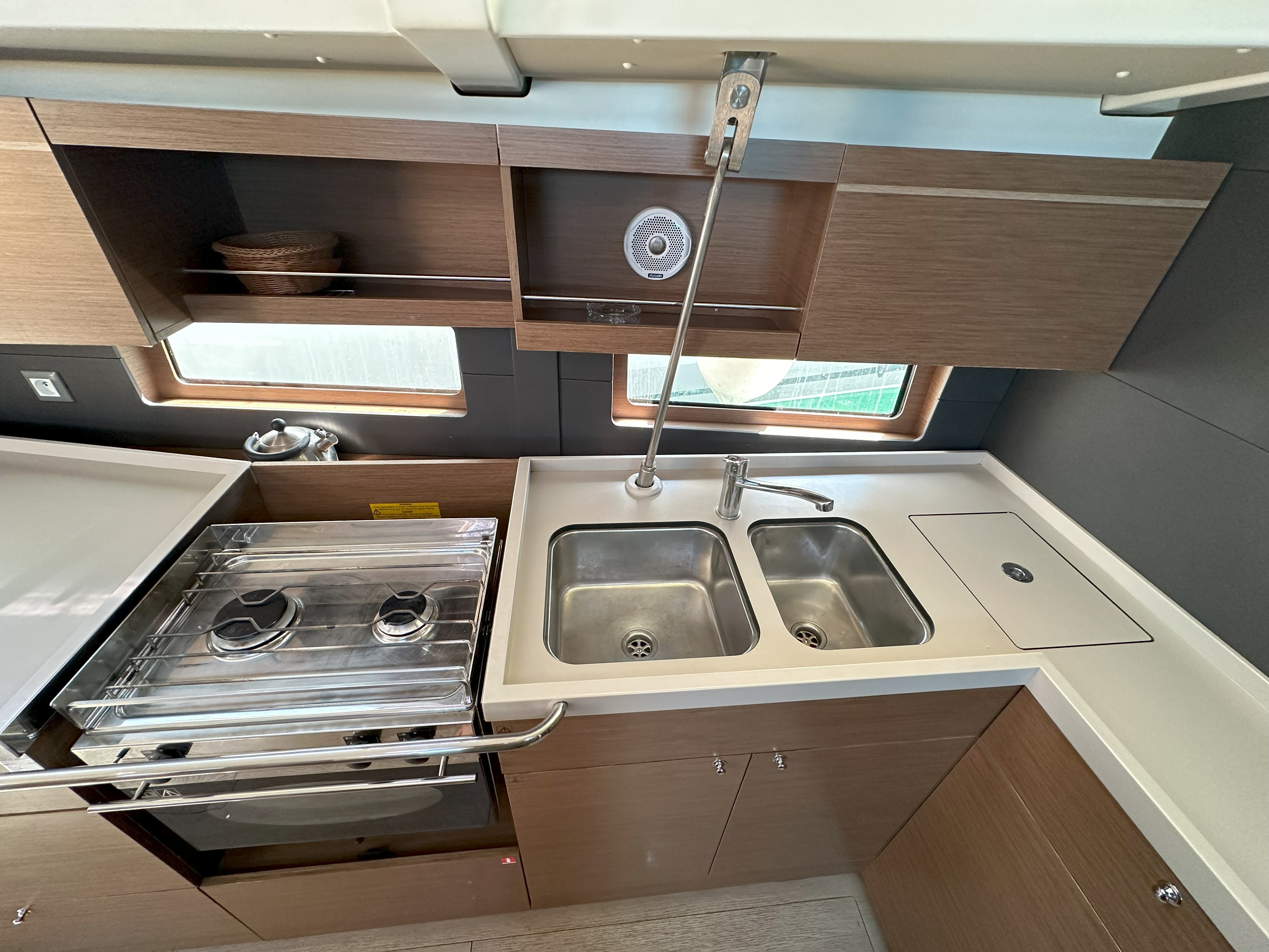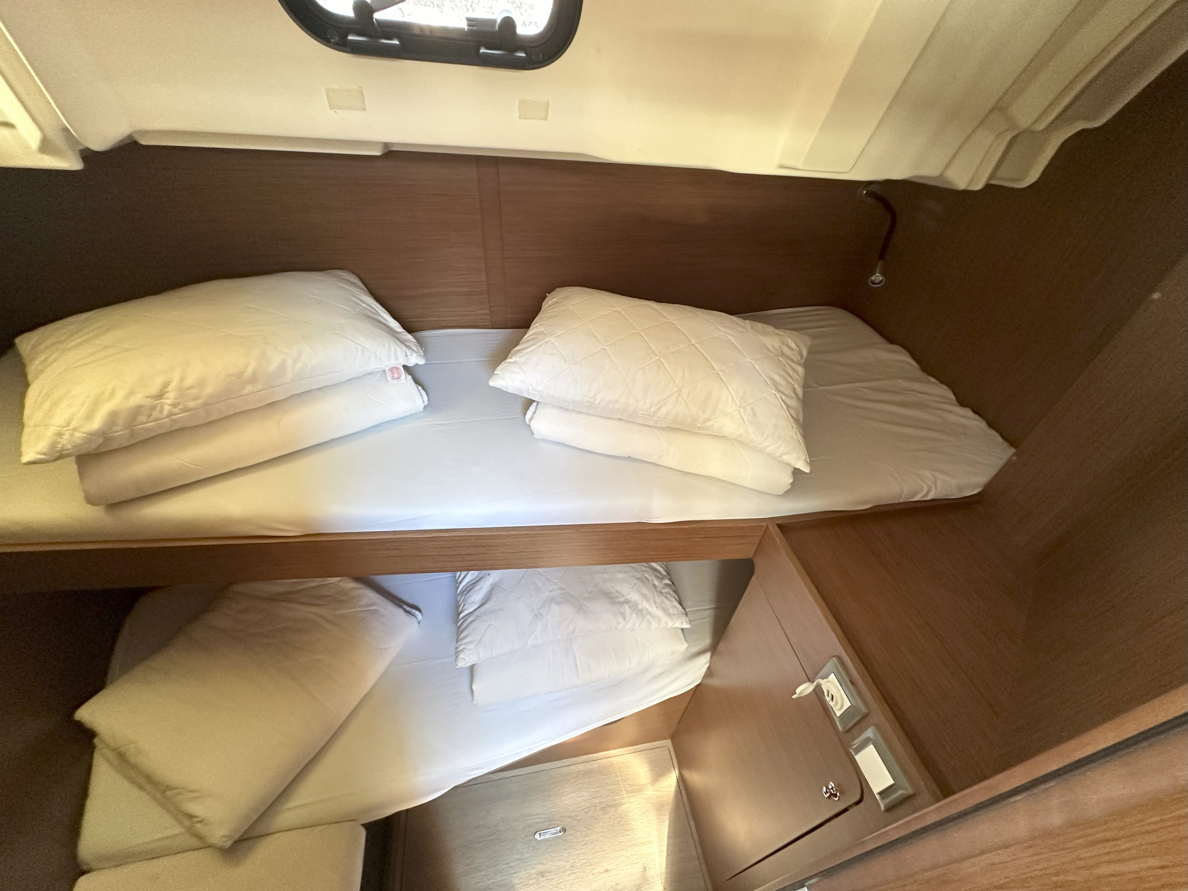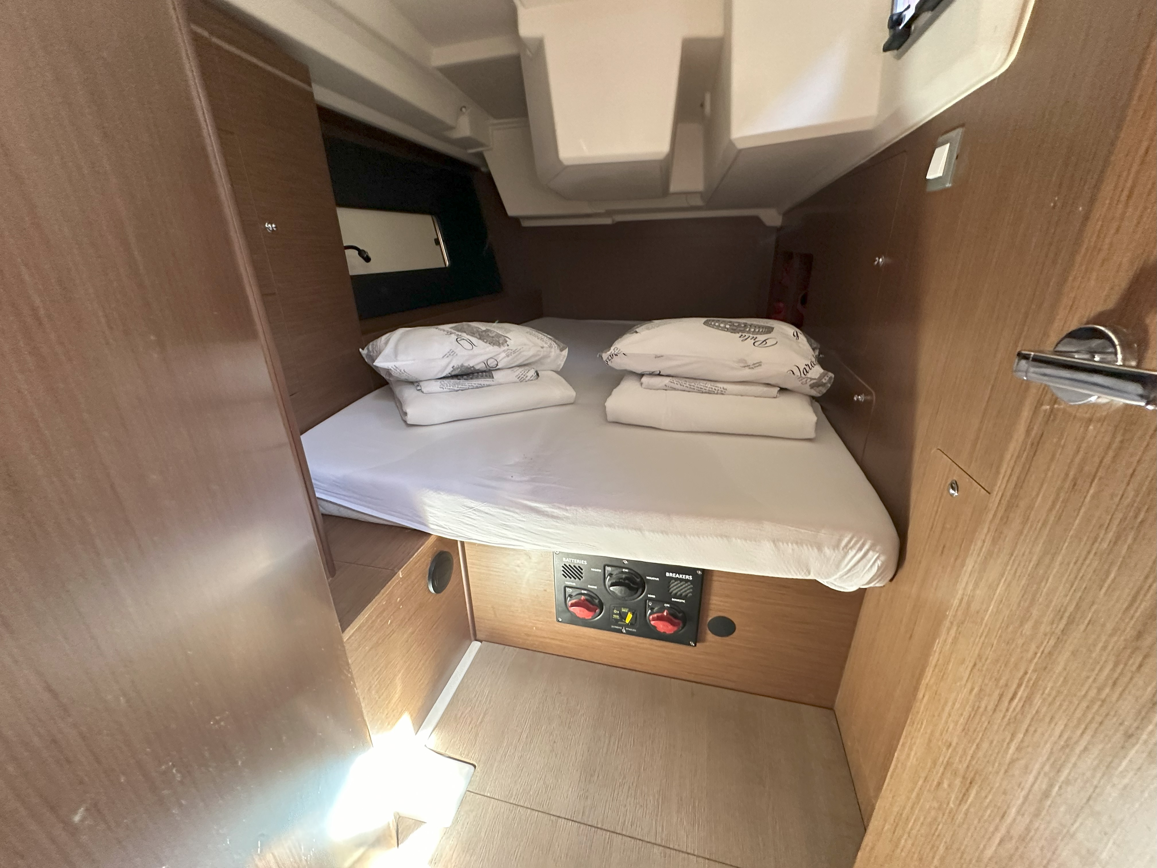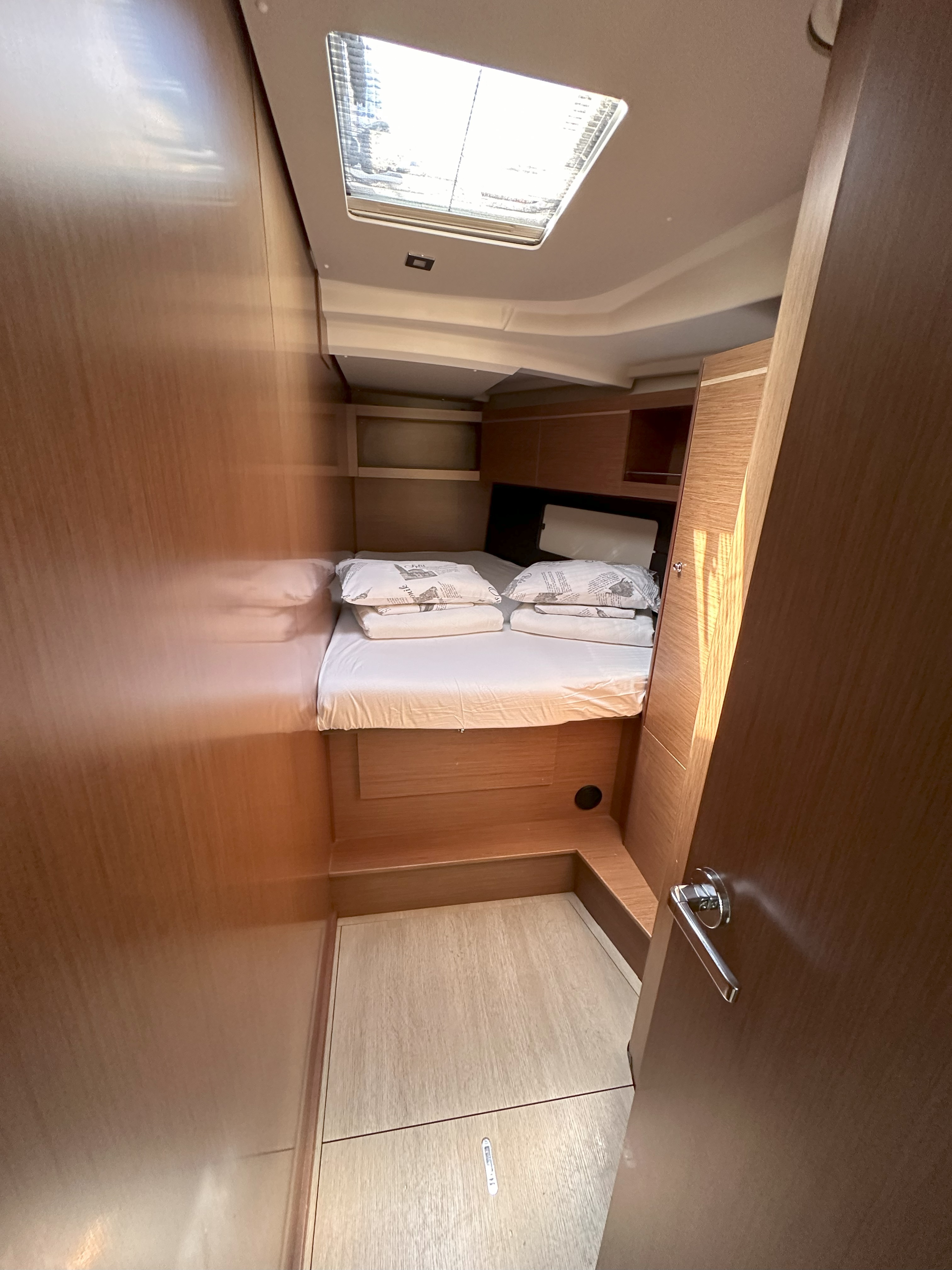 | Outside | 220 V-Landanschluss, Anker mit Kette, Badeplattform, Biminitop, Cockpitdusche, Cockpitlautsprecher, Cockpitpolster, Cockpittisch, elektr. Ankerwinsch, Faltpropeller, Fender, Festmacherleinen, Sprayhood, Teak im Cockpit, Treibanker, Wantenschneider, Windex, Winschen |
