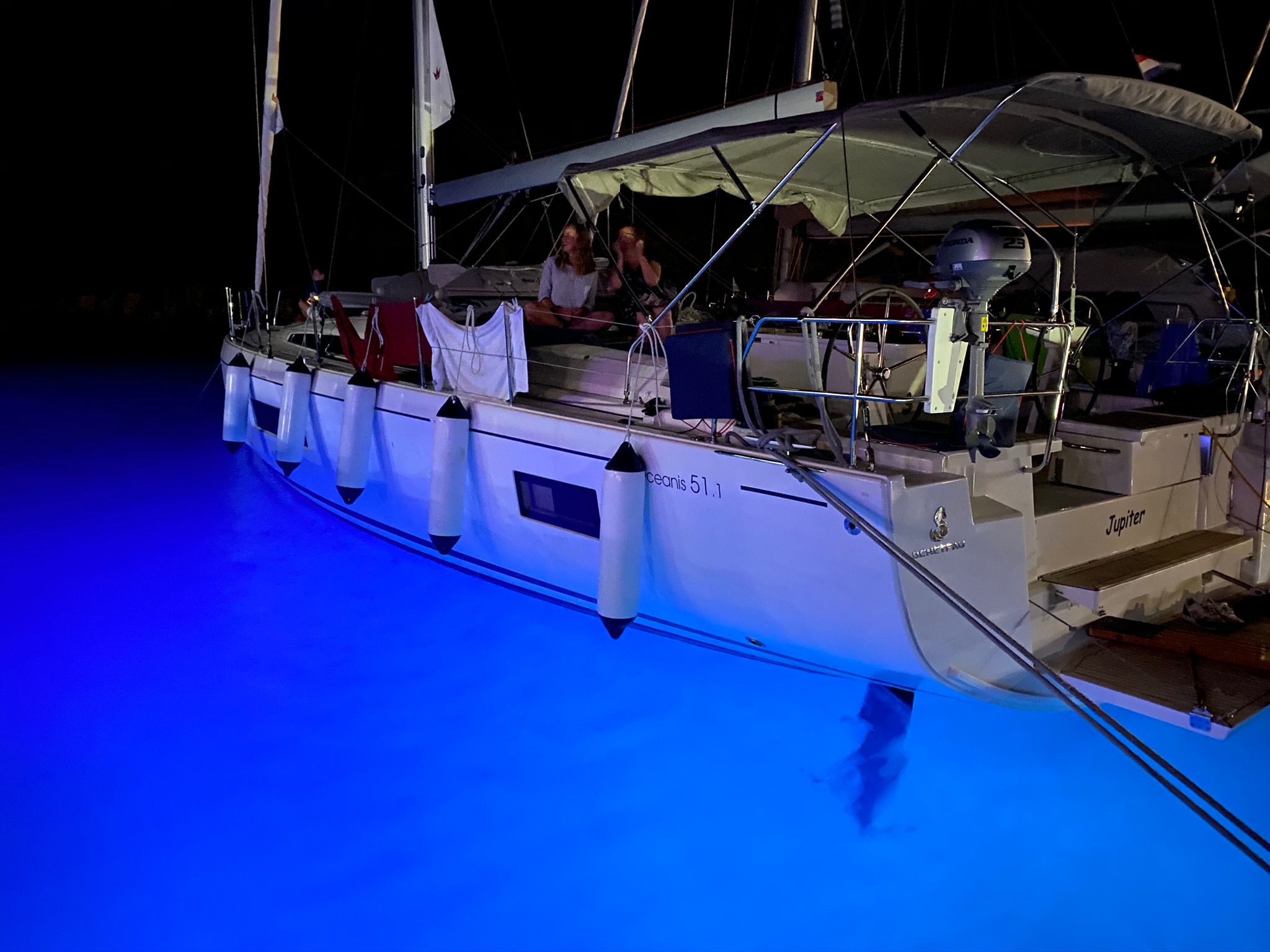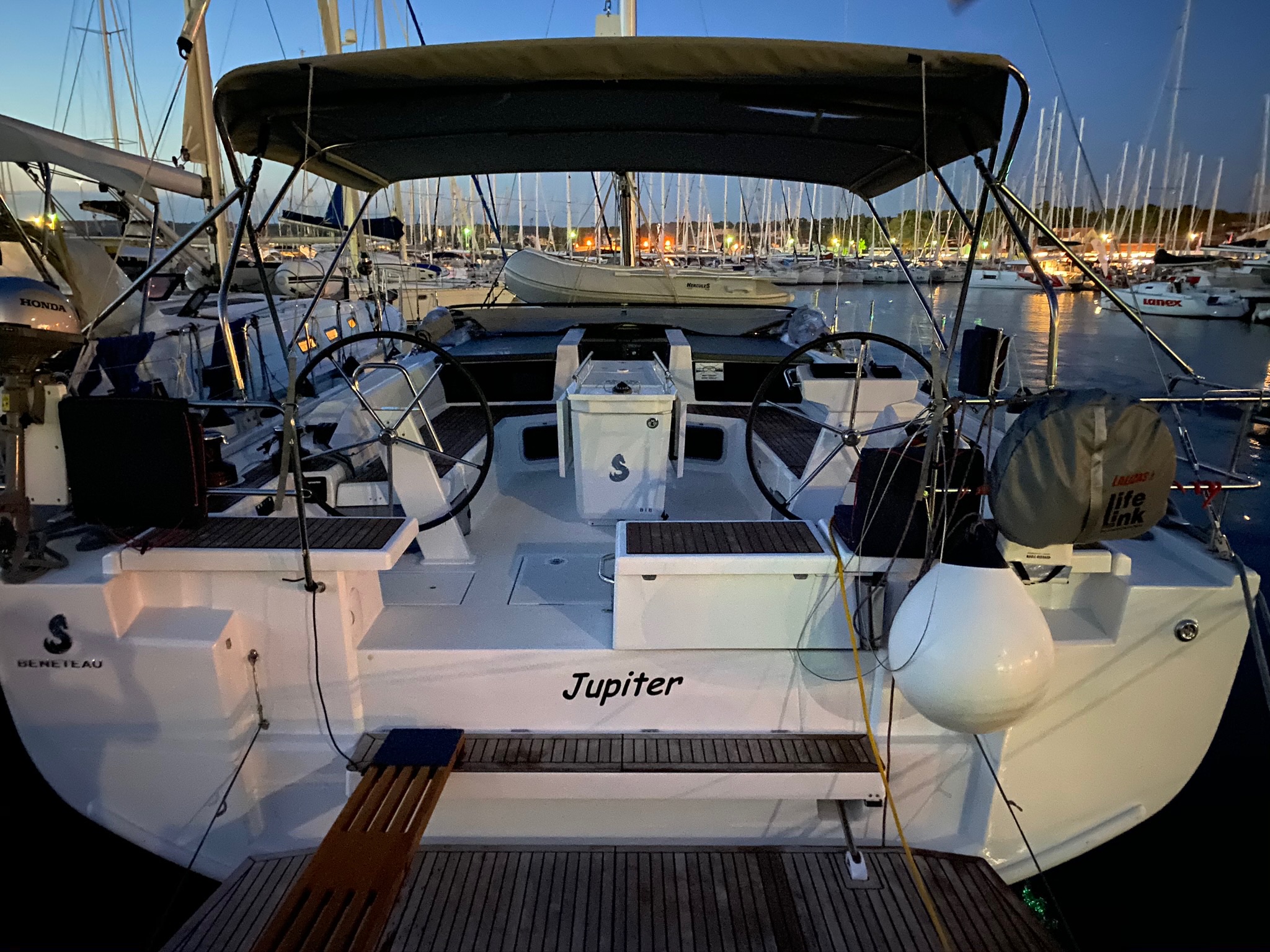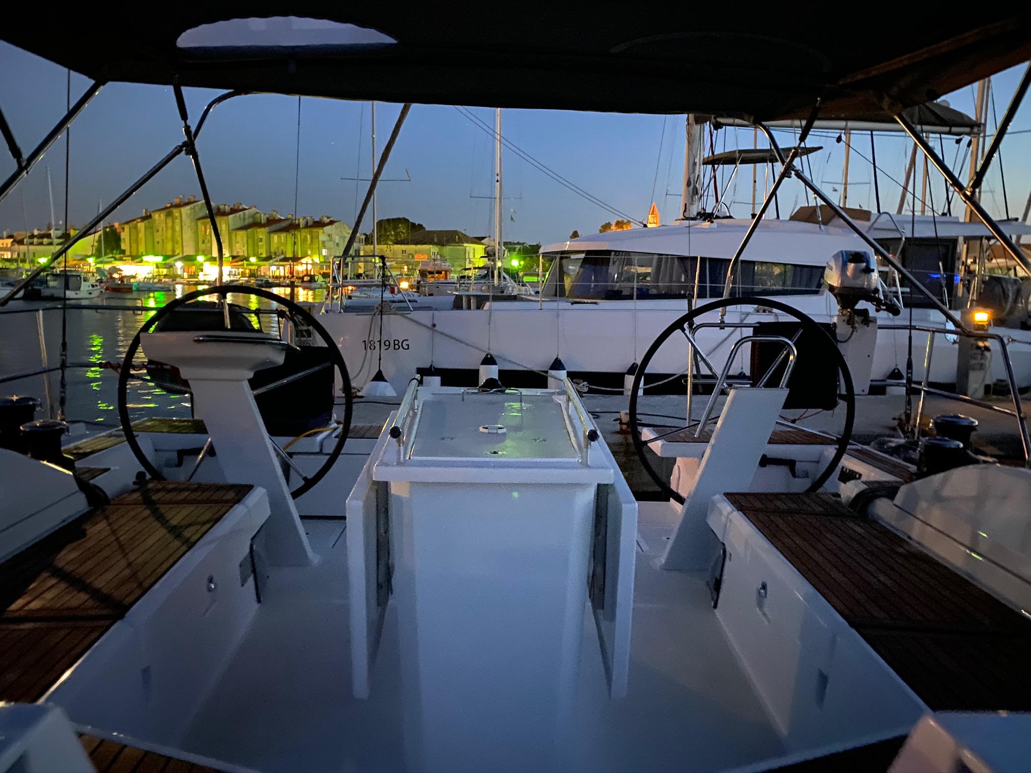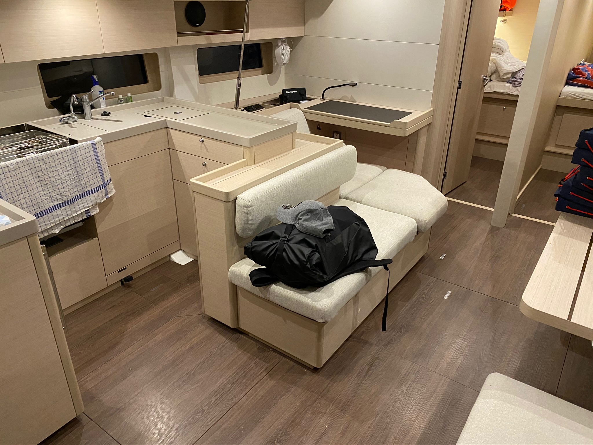 | Outside | 220 V-Landanschluss, Anker mit Kette, Badeplattform, Biminitop, Bootshaken, Cockpitdusche, Cockpitlautsprecher, Cockpitpolster, Cockpittisch mit Eisbox, Delta-Anker, elektr. Ankerwinsch, Fender, Festmacherleinen, Gangway, Grill, Jambo Anker, Sprayhood, Teak im Cockpit, Wasserschlauch, Winschen |
