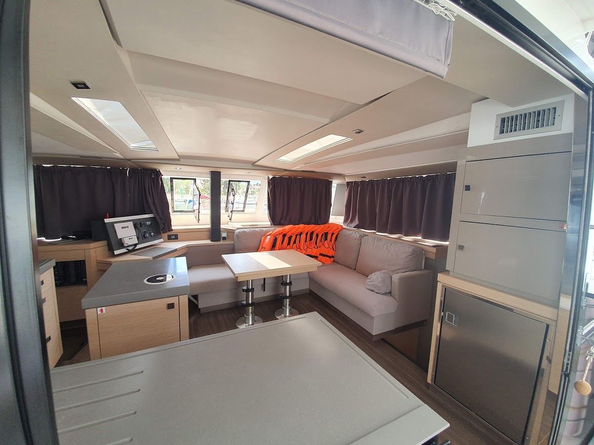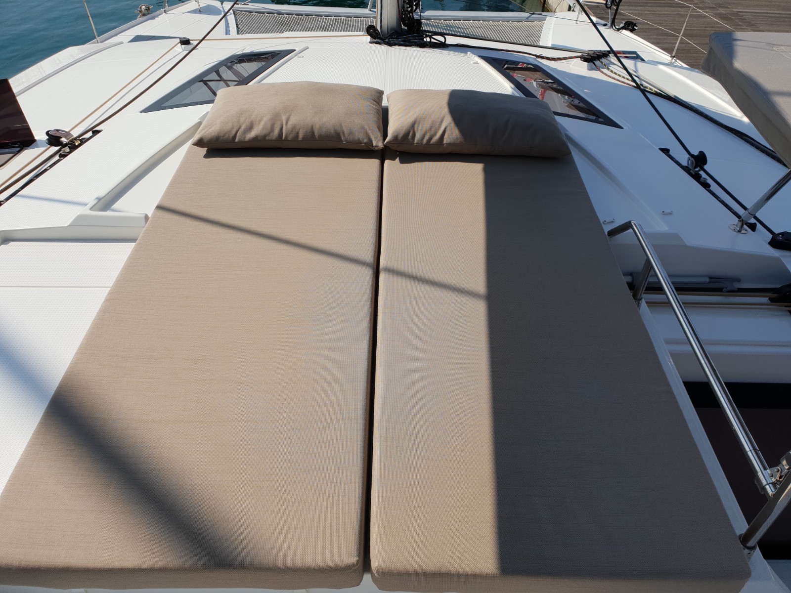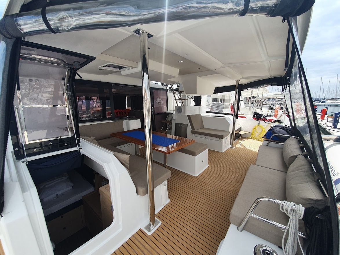 | Outside | Badeplattform, Bootshaken, Cockpitdusche, Cockpitkühlschrank, Cockpitpolster, Cockpittisch, Delta-Anker, elektr. Ankerwinsch, elektr. Winsch, Fender, Festmacherleinen, Hardtop, Jambo Anker, Kugelfender, Liegestühle, Sonnensegel, Teak im Cockpit, Unterwasserbeleuchtung, Wasserschlauch, Winschen |