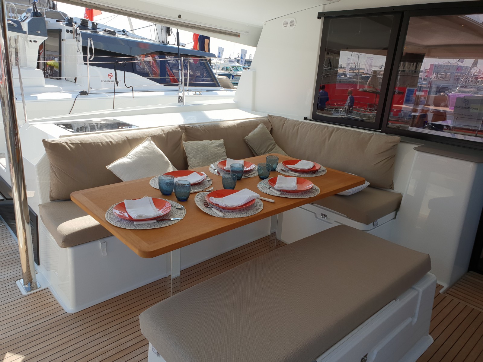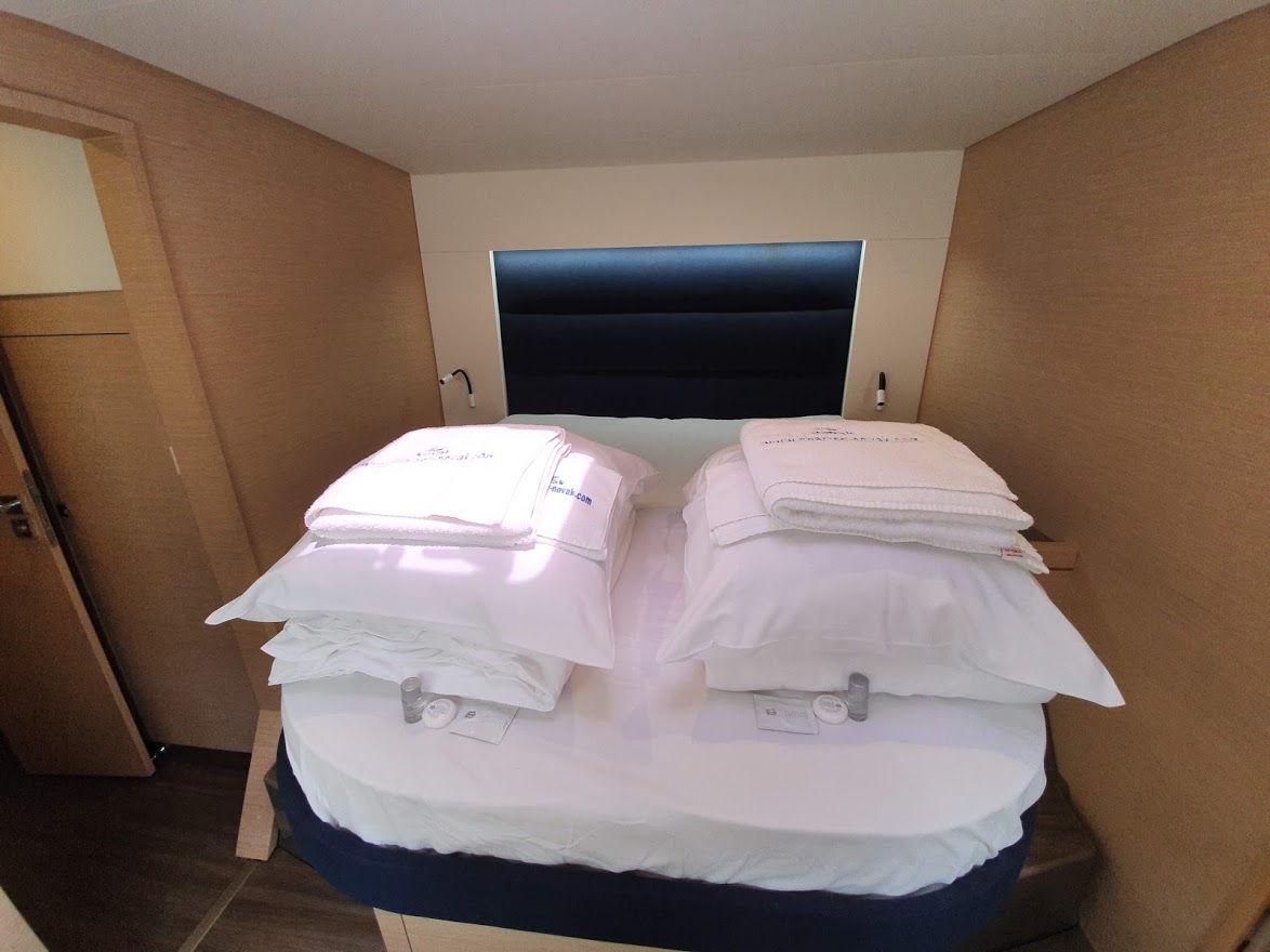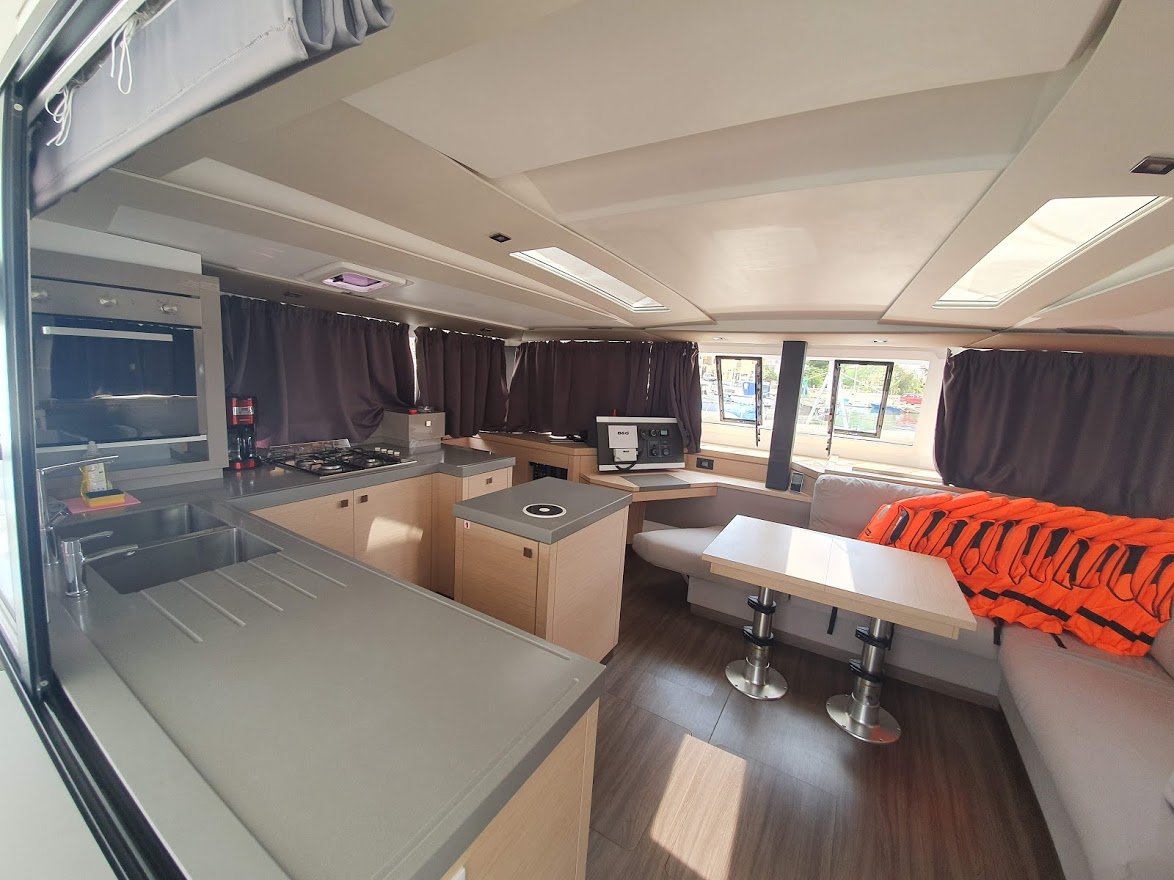 | Outside | Badeplattform, Bootshaken, Cockpitdusche, Cockpitkühlschrank, Cockpitpolster, Cockpittisch, Delta-Anker, elektr. Ankerwinsch, elektr. Winsch, Fender, Festmacherleinen, Hardtop, Jambo Anker, Kugelfender, Liegestühle, Sonnensegel, Teak im Cockpit, Unterwasserbeleuchtung, Wasserschlauch, Winschen |