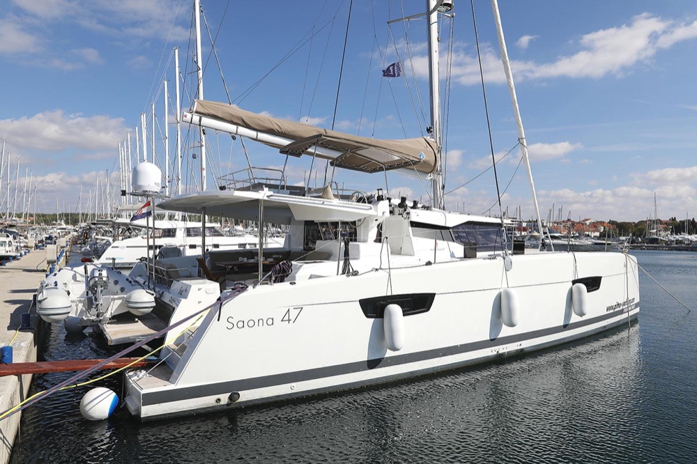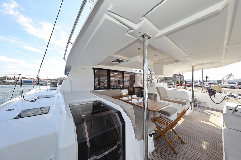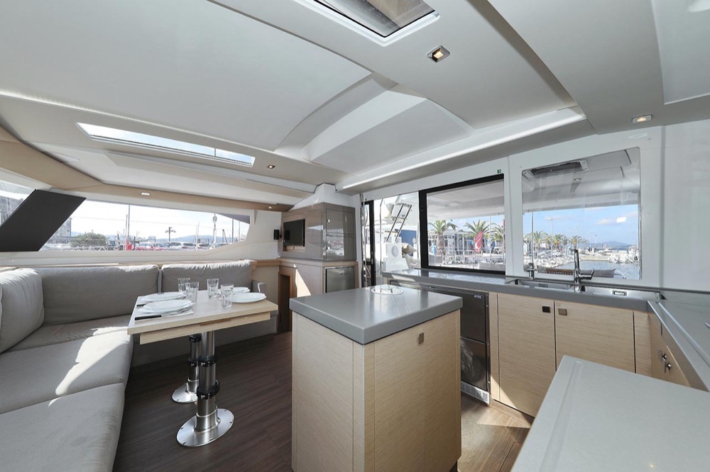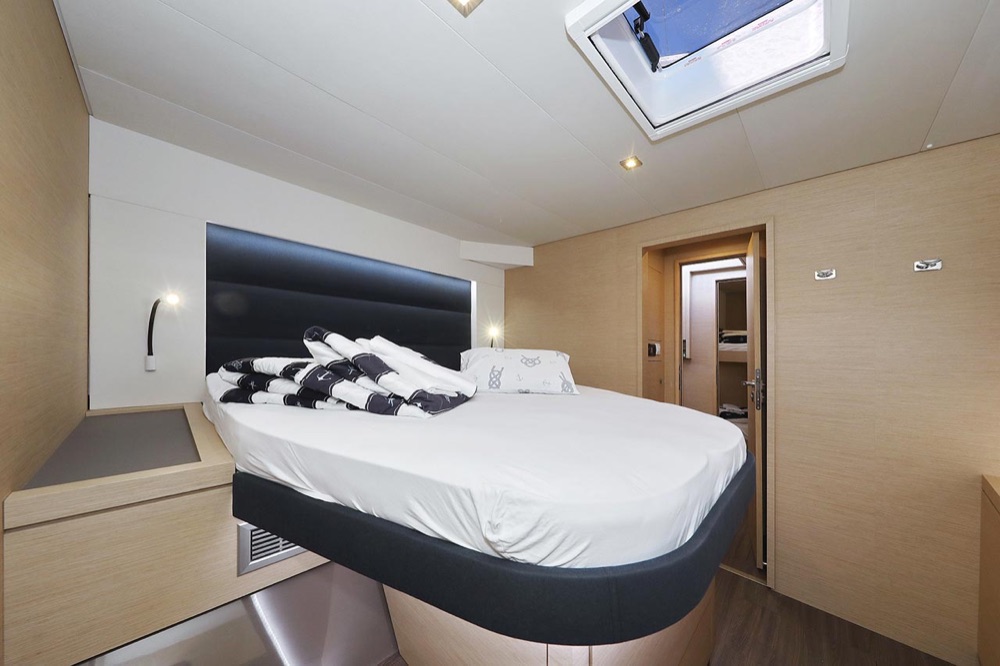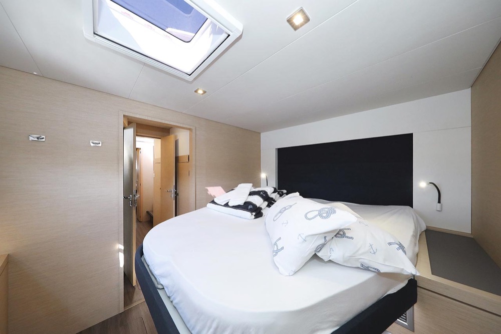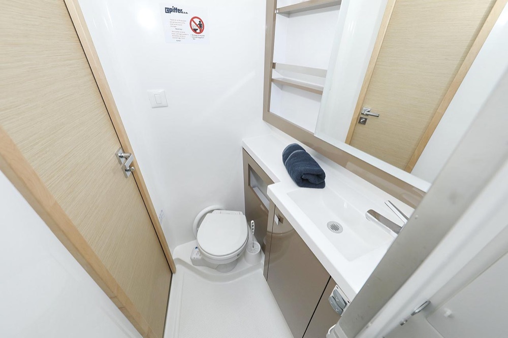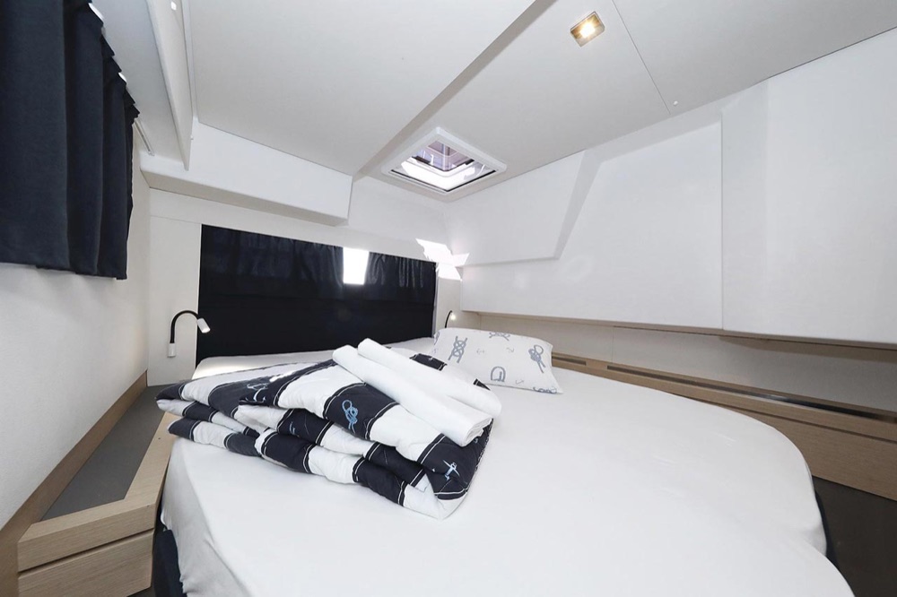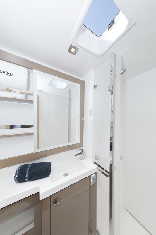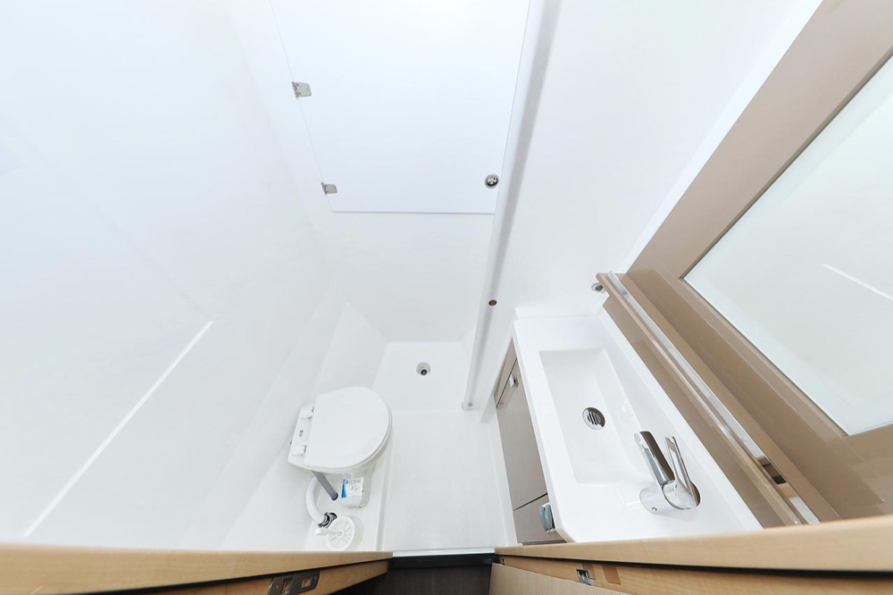 | Inside | 2. Kühlschrank, Borduhr, Generator, Heizung, Inverter 12V/220V, Klimaanlage (ohne Landstrombedarf), Kühlschrank, Ladegerät, Luftpumpe für Beiboot, Pantryausstattung, Radio mit CD, USB, Bluetooth, Salontisch absenkbar, USB Steckdosen in den Kabinen, Warmwasser, WC (elektr.) |