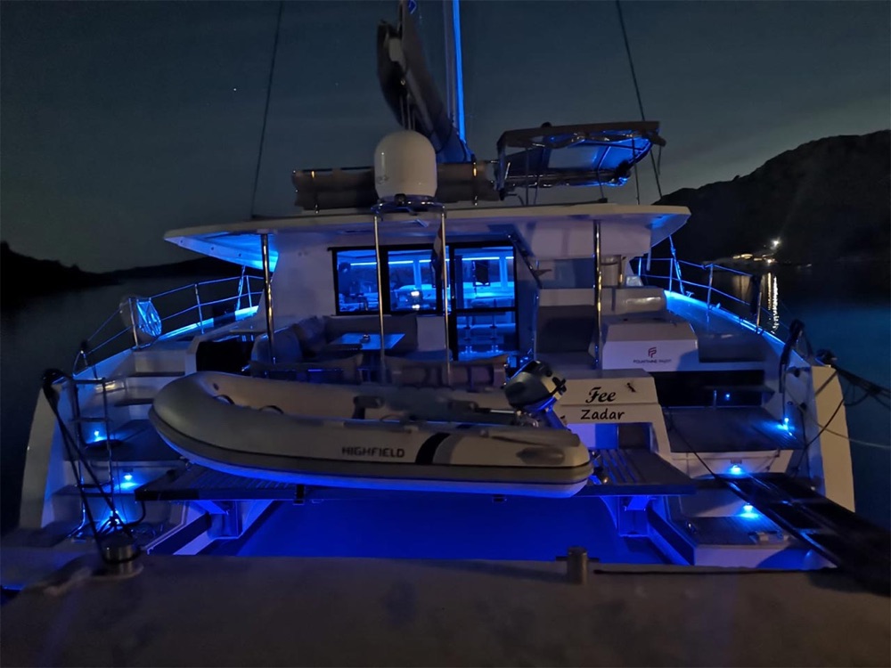 | Outside | 220 V-Landanschluss, Anker mit Kette, Ankerwinsch, Badeplattform (hydr.), Biminitop, Bootshaken, Cockpitdusche, Cockpitkühlschrank, Cockpitlautsprecher, Cockpitpolster, Cockpittisch, Cockpitverdeck, Deckpolster, Dieselkanister , elektr. Ankerwinsch, elektr. Winsch, Fender, Festmacherleinen, Gangway, Kugelfender, Kunststoff-Eimer (Pütz), Solaranlage, Unterwasserbeleuchtung, Wantenschneider, Wasserkanister , Wasserschlauch |
