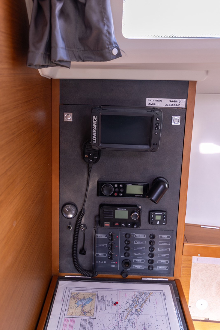 | Navigation | Feuermelder, GPS mit Kartenplotter, Hafenhandbücher, Handpeilkompass, Kompass, Seekarten, Sumlog, Tridata (Log, Echolot, Windm.), Windmesser |