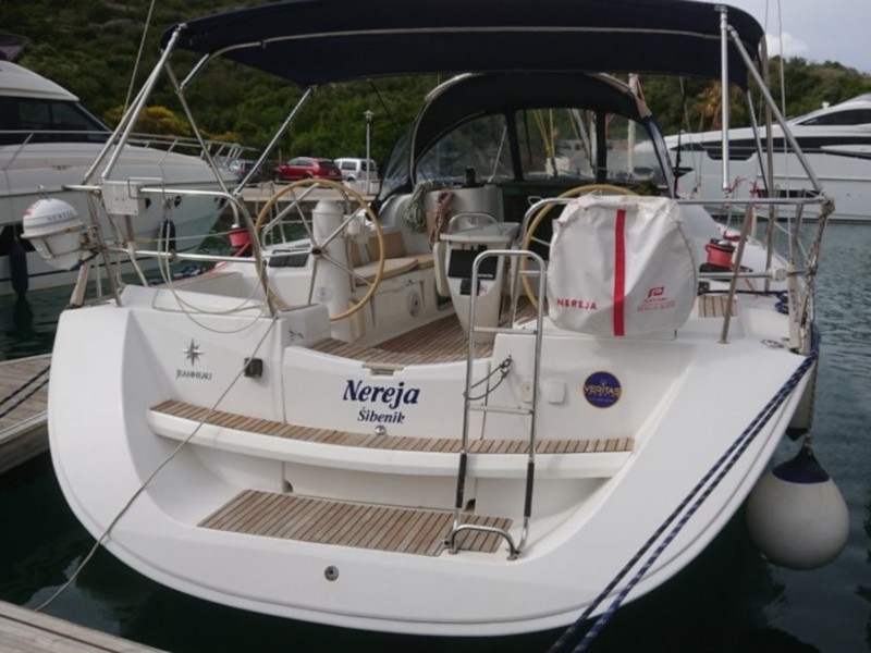 | Outside | Biminitop, Cockpitdusche, Cockpittisch, elektr. Ankerwinsch, Solaranlage, Sprayhood, Teak im Cockpit |